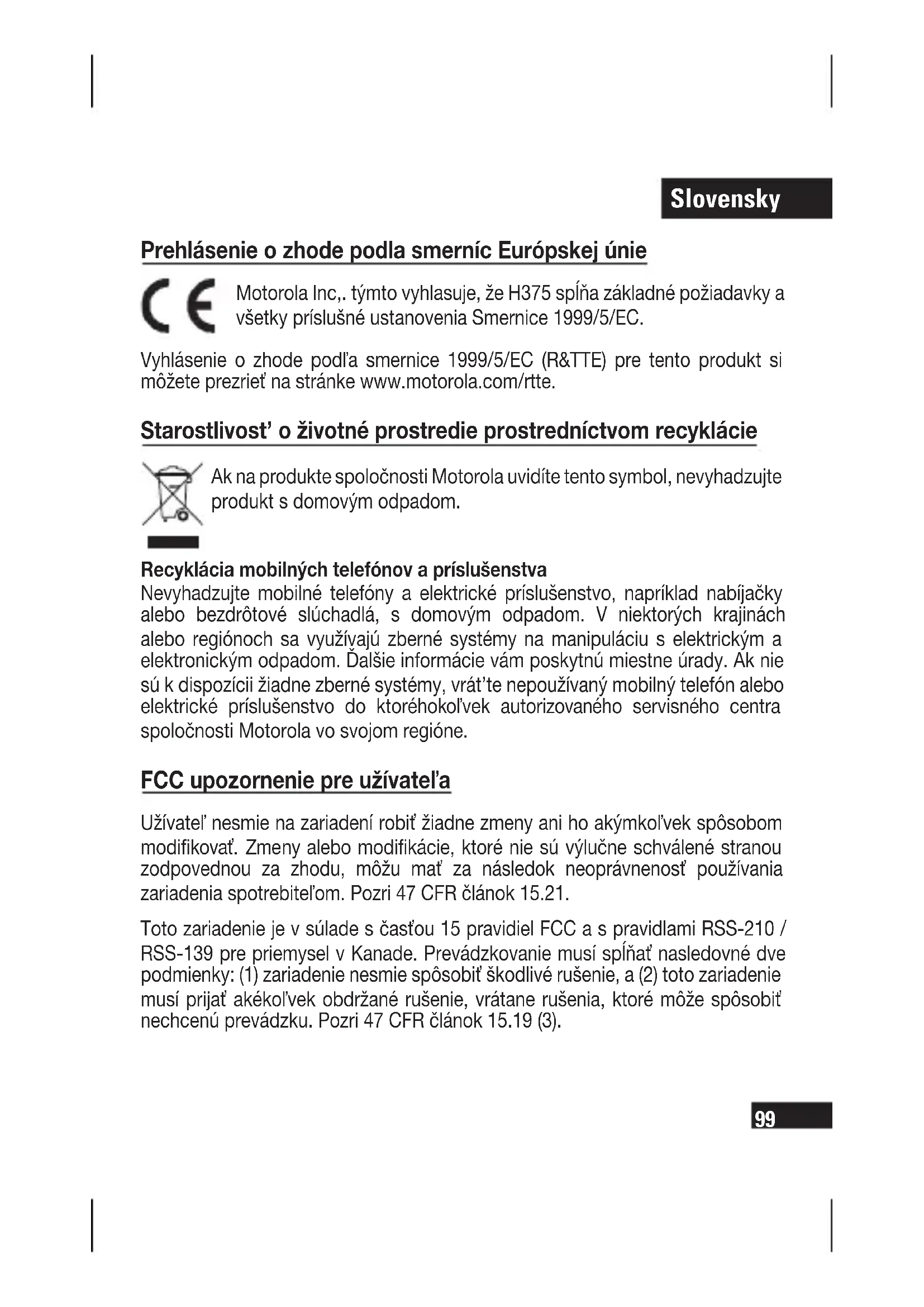 Prehlásenie o zhode podla smerníc Európskej únie Motorola Inc,. týmto vyhlasuje, že H375 spĺňa základné požiadavky a všetky príslušné ustanovenia Smernice 1999/5/EC. Vyhlásenie o zhode podľa smernice 1999/5/EC (R&TTE) pre tento produkt si môžete prezrieť na stránke www.motorola.com/rtte. Starostlivost’ o životné prostredie prostredníctvom recyklácie Ak na produkte spoločnosti Motorola uvidíte tento symbol, nevyhadzujte produkt s domovým odpadom. Recyklácia mobilných telefónov a príslušenstva Nevyhadzujte mobilné telefóny a elektrické príslušenstvo, napríklad nabíjačky alebo bezdrôtové slúchadlá, s domovým odpadom. V niektorých krajinách alebo regiónoch sa využívajú zberné systémy na manipuláciu s elektrickým a elektronickým odpadom. Ďalšie informácie vám poskytnú miestne úrady. Ak nie sú k dispozícii žiadne zberné systémy, vrát’te nepoužívaný mobilný telefón alebo elektrické príslušenstvo do ktoréhokoľvek autorizovaného servisného centra spoločnosti Motorola vo svojom regióne. FCC upozornenie pre užívateľa Užívateľ nesmie na zariadení robiť žiadne zmeny ani ho akýmkoľvek spôsobom modifi kovať. Zmeny alebo modifi kácie, ktoré nie sú výlučne schválené stranou zodpovednou za zhodu, môžu mať za následok neoprávnenosť používania zariadenia spotrebiteľom. Pozri 47 CFR článok 15.21. Toto zariadenie je v súlade s časťou 15 pravidiel FCC a s pravidlami RSS-210 / RSS-139 pre priemysel v Kanade. Prevádzkovanie musí spĺňať nasledovné dve podmienky: (1) zariadenie nesmie spôsobiť škodlivé rušenie, a (2) toto zariadenie musí prijať akékoľvek obdržané rušenie, vrátane rušenia, ktoré môže spôsobiť nechcenú prevádzku. Pozri 47 CFR článok 15.19 (3).Slovensky