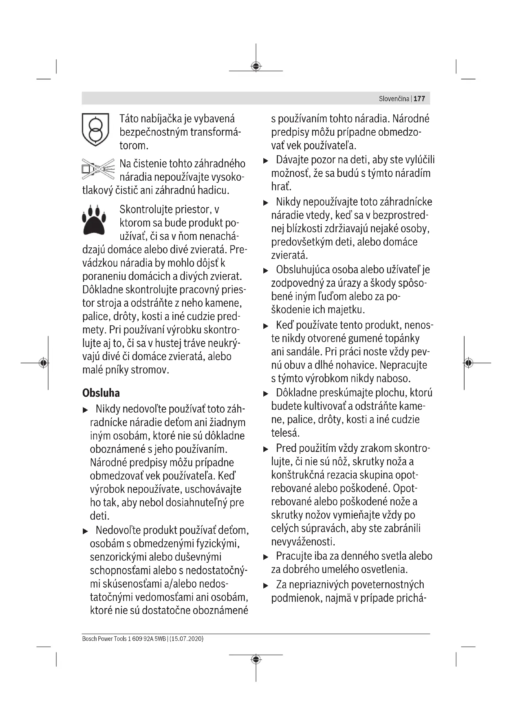 Pro prodloužení doby chodu lze zakoupit v autorizovaném servisním středisku pro zahradní nářadí Bosch dodatečný akumulátor. Hledání závad Příznak Možná příčina Odstranění Motor se nerozeběhne Vadná vnitřní kabeláž zahradního nářadí Obraťte se na zákaznický servis Bosch Vybitý akumulátor Nabijte akumulátor Příliš studený/horký akumulátor Akumulátor nechte ohřát/ochladit Příliš dlouhá tráva Max. přípustná výška trávy je 30 cm s největším nastavením výšky sečení Projevila se motorová ochrana Motor nechte vychladnout a nastavte větší výšku sečení Přerušovač okruhu el. proudu není správně / není zcela vložený Vložte správně Zahradní nářadí běží přerušovaně Vadná vnitřní kabeláž zahradního nářadí Obraťte se na zákaznický servis Bosch Projevila se motorová ochrana Motor nechte vychladnout a nastavte větší výšku sečení Zahradní nářadí zanechává nepravidelný obraz sečení a / nebo motor pracuje těžce Příliš nízká výška sečení Nastavte větší výšku sečení Tupý nůž Nůž vyměňte (viz obrázek K) Možné ucpání Zahradní nářadí vypněte a rozpojte přerušovač okruhu el. proudu Zkontrolujte a popř. uvolněte spodní stranu zahradního nářadí (noste vždy zahradní rukavice) Nesprávně dokola namontovaný nůž Nůž namontujte dokola správně 1 609 92A 5WB | (15.07.2020) Bosch Power ToolsČeština | 175 Příznak Možná příčina Odstranění Po zapnutí zahradního nářadí se nůž netočí Noži překáží tráva Zahradní nářadí vypněte a rozpojte přerušovač okruhu el. proudu Odstraňte ucpání (noste vždy zahradní rukavice) Uvolněná matice/šroub nože Matici/šroub nože utáhněte (27Nm) Silné vibrace/hluk Uvolněná matice/šroub nože Matici/šroub nože utáhněte (27Nm) Poškozený nůž Nůž vyměňte (viz obrázek K) Akumulátor a nabíječka Příznaky Možná příčina Odstranění Bliká červený ukazatel nabíjení akumulátoru na nabíječce Nabíjecí proces není možný Akumulátor není (správně) nasazený Nasaďte akumulátor správně do nabíječky Znečištěné kontakty akumulátoru Kontakty akumulátoru očistěte; např. několikerým zasunutím a vytažením akumulátoru, popř. akumulátor nahraďte Vadný akumulátor Akumulátor nahraďte Ukazatelé nabíjení akumulátoru na nabíječce nesvítí Síťová zástrčka nabíječky není (správně) zastrčena Síťovou zástrčku (zcela) zastrčte do zásuvky Zásuvka, síťový kabel nebo nabíječka mají závadu Zkontrolujte síťové napětí, nabíječku příp. nechte zkontrolovat autorizovaným servisním střediskem pro elektronářadí Bosch Údržba a servis Péče o akumulátor u Výstraha! Dříve, než provedete práce údržby nebo čištění, zahradní nářadí vypněte, rozpojte přerušovač okruhu el. proudu a odstraňte akumulátor a též sběrný vak na trávu. u Když manipulujete nebo pracujete v oblasti ostrých nožů, vždy noste zahradní rukavice. Pro zaručení optimálního používání akumulátoru dbejte následujících upozornění a opatření: – Chraňte akumulátor před vlhkostí a vodou. – Zahradní nářadí a akumulátor skladujte pouze v teplotním rozsahu od –20 °C do 50 °C. Nenechávejte zahradní nářadí např. v létě ležet v autě. – Akumulátor uskladněte odděleně a nikoli v nabíječce. – Při přímém slunečním záření nenechávejte akumulátor v zahradním nářadí. – Optimální teplota pro uskladnění akumulátoru činí 5 °C. – Příležitostně vyčistěte větrací otvory akumulátoru měkkým, čistým a suchým štětcem. Výrazně zkrácená doba provozu po nabití ukazuje, že je akumulátor opotřebovaný a musí se nahradit. Zákaznická služba aporadenství ohledně použití Zákaznická služba zodpoví vaše dotazy kopravě aúdržbě vašeho výrobku atéž knáhradním dílům. Rozkladové výkresy ainformace onáhradních dílech najdete také na: www.bosch-pt.com. Vpřípadě dotazů knašim výrobkům apříslušenství vám ochotně pomůže poradenský tým Bosch. Vpřípadě veškerých otázek aobjednávek náhradních dílů bezpodmínečně uveďte 10místné věcné číslo podle typového štítku výrobku. Czech Republic Robert Bosch odbytová s.r.o. Bosch Service Center PT K Vápence 1621/16 692 01 Mikulov Na www.bosch-pt.cz si si můžete objednat opravu Vašeho stroje nebo náhradní díly online. Tel.: +420 519 305700 Fax: +420 519 305705 E-Mail: servis.naradi@cz.bosch.com www.bosch-pt.cz Další adresy servisů najdete na: www.bosch-pt.com/serviceaddresses Přeprava Obsažené lithium-iontové akumulátory podléhají požadavkům zákona o nebezpečných nákladech. Tyto akumulátory mohou byt bez dalších podmínek přepravovány uživatelem po silnici. Při zasílání prostřednictvím třetí osoby (např.: letecká přeprava nebo spedice) je třeba brát zřetel na zvláštní požadavky na balení a označení. Zde musí být při přípravě zásilky nezbytně přizván expert na nebezpečné náklady. Akumulátory zasílejte pouze tehdy, pokud je těleso nepoškozené. Otevřené kontakty přelepte lepicí páskou a Bosch Power Tools 1 609 92A 5WB | (15.07.2020)176 | Slovenčina akumulátor zabalte tak, aby se v obalu nemohl pohybovat. Dodržujte prosím také případné další národní předpisy. Zpracování odpadů Zahradní nářadí, akumulátory, příslušenství a obaly mají být dodány k opětovnému zhodnocení nepoškozujícímu životní prostředí. Nevyhazujte zahradní nářadí a akumulátory/ baterie do domovního odpadu! Pouze pro zeměEU: Podle evropské směrnice 2012/19/EU musejí být neupotřebitelná elektrická a elektronická zařízení a podle evropské směrnice 2006/66/ES vadné nebo opotřebované akumulátory/baterie odděleně shromážděny a dodány k opětovnému zhodnocen