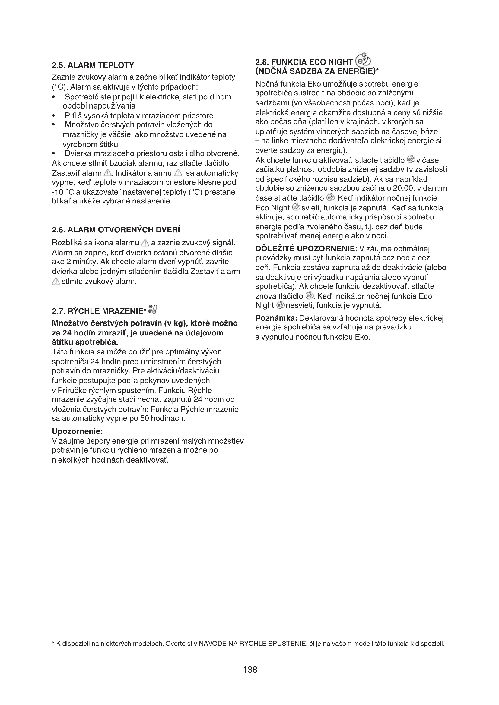 - Aksúpotravinyvmraziacompriestorezmrazené, znamenáto,žesarozmraziliapoobnovení dodávkyelektrickejenergieznovuzmrazili,čo mánepriaznivývplyvnachuť,kvalitu,nutričnú hodnotuakonzumáciatakýchtopotravínmôžebyť nebezpečná.Odporúčasapotravinynejesťaobsah mrazničkyvyhodiť.Účelomalarmuprerušenia dodávkyelektrickejenergiejesignalizovaťmožnosť pokazeniapotravínvmrazničkepočasprerušenia dodávkyelektriny.Tentosystémnezaručujekvalitu alebobezpečnúkonzumáciupotravínaspotrebiteľ samusíriadiťvlastnýmúsudkomprihodnotení kvalitypotravínvmraziacompriestore. *Kdispozíciinaniektorýchmodeloch.OvertesivNÁVODENARÝCHLESPUSTENIE,čijenavašommodelitátofunkciakdispozícii.138