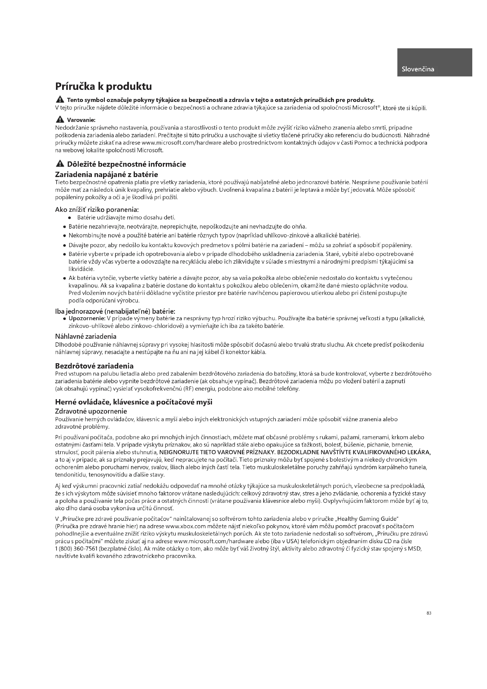 , ktoré ste si kúpili. Varovanie: Nedodržanie správneho nastavenia, používania a starostlivosti o tento produkt môže zvýšiť riziko vážneho zranenia alebo smrti, prípadne poškodenia zariadenia alebo zariadení. Prečítajte si túto príručku a uschovajte si všetky tlačené príručky ako referenciu do budúcnosti. Náhradné príručky môžete získať na adrese www.microsoft.com/hardware alebo prostredníctvom kontaktných údajov v časti Pomoc a technická podpora na webovej lokalite spoločnosti Microsoft. Dôležité bezpečnostné informácie Zariadenia napájané z batérie Tieto bezpečnostné opatrenia platia pre všetky zariadenia, ktoré používajú nabíjateľné alebo jednorazové batérie. Nesprávne používanie batérií môže mať za následok únik kvapaliny, prehriatie alebo výbuch. Uvoľnená kvapalina z batérií je leptavá a môže byť jedovatá. Môže spôsobiť popáleniny pokožky a očí a je škodlivá pri požití. Ako znížiť riziko poranenia: ● Batérie udržiavajte mimo dosahu detí. ● Batérie nezahrievajte, neotvárajte, neprepichujte, nepoškodzujte ani nevhadzujte do ohňa. ● Nekombinujte nové a použité batérie ani batérie rôznych typov (napríklad uhlíkovo-zinkové a alkalické batérie). ● Dávajte pozor, aby nedošlo ku kontaktu kovových predmetov s pólmi batérie na zariadení – môžu sa zohriať a spôsobiť popáleniny. ● Batérie vyberte v prípade ich opotrebovania alebo v prípade dlhodobého uskladnenia zariadenia. Staré, vybité alebo opotrebované batérie vždy včas vyberte a odovzdajte na recykláciu alebo ich zlikvidujte v súlade s miestnymi a národnými predpismi týkajúcimi sa likvidácie. ● Ak batéria vytečie, vyberte všetky batérie a dávajte pozor, aby sa vaša pokožka alebo oblečenie nedostalo do kontaktu s vytečenou kvapalinou. Ak sa kvapalina z batérie dostane do kontaktu s pokožkou alebo oblečením, okamžite dané miesto opláchnite vodou. Pred vložením nových batérií dôkladne vyčistite priestor pre batérie navlhčenou papierovou utierkou alebo pri čistení postupujte podľa odporúčaní výrobcu. Iba jednorazové (nenabíjateľné) batérie: ● Upozornenie: V prípade výmeny batérie za nesprávny typ hrozí riziko výbuchu. Používajte iba batérie správnej veľkosti a typu (alkalické, zinkovo-uhlíkové alebo zinkovo-chloridové) a vymieňajte ich iba za takéto batérie. Náhlavné zariadenia Dlhodobé používanie náhlavnej súpravy pri vysokej hlasitosti môže spôsobiť dočasnú alebo trvalú stratu sluchu. Ak chcete predísť poškodeniu náhlavnej súpravy, nesadajte a nestúpajte na ňu ani na jej kábel či konektor kábla. Bezdrôtové zariadenia Pred vstupom na palubu lietadla alebo pred zabalením bezdrôtového zariadenia do batožiny, ktorá sa bude kontrolovať, vyberte z bezdrôtového zariadenia batérie alebo vypnite bezdrôtové zariadenie (ak obsahuje vypínač). Bezdrôtové zariadenia môžu po vložení batérií a zapnutí (ak obsahujú vypínač) vysielať vysokofrekvenčnú (RF) energiu, podobne ako mobilné telefóny. Herné ovládače, klávesnice a počítačové myši Zdravotné upozornenie Používanie herných ovládačov, klávesníc a myší alebo iných elektronických vstupných zariadení môže spôsobiť vážne zranenia alebo zdravotné problémy. Pri používaní počítača, podobne ako pri mnohých iných činnostiach, môžete mať občasné problémy s rukami, pažami, ramenami, krkom alebo ostatnými časťami tela. V prípade výskytu príznakov, ako sú napríklad stále alebo opakujúce sa ťažkosti, bolesť, búšenie, pichanie, brnenie, strnulosť, pocit pálenia alebo stuhnutia, NEIGNORUJTE TIETO VAROVNÉ PRÍZNAKY. BEZODKLADNE NAVŠTÍVTE KVALIFIKOVANÉHO LEKÁRA, a to aj v prípade, ak sa príznaky prejavujú, keď nepracujete na počítači. Tieto príznaky môžu byť spojené s bolestivým a niekedy chronickým ochorením alebo poruchami nervov, svalov, šliach alebo iných častí tela. Tieto muskuloskeletálne poruchy zahŕňajú syndróm karpálneho tunela, tendonitídu, tenosynovitídu a ďalšie stavy. Aj keď výskumní pracovníci zatiaľ nedokážu odpovedať na mnohé otázky týkajúce sa muskuloskeletálnych porúch, všeobecne sa predpokladá, že s ich výskytom môže súvisieť mnoho faktorov vrátane nasledujúcich: celkový zdravotný stav, stres a jeho zvládanie, ochorenia a fyzické stavy a poloha a používanie tela počas práce a ostatných činností (vrátane používania klávesnice alebo myši). Ovplyvňujúcim faktorom môže byť aj to, ako dlho daná osoba vykonáva určitú činnosť. V „Príručke pre zdravé používanie počítačov“ nainštalovanej so softvérom tohto zariadenia alebo v príručke „Healthy Gaming Guide“ (Príručka pre zdravé hranie hier) na adrese www.xbox.com môžete nájsť niekoľko pokynov, ktoré vám môžu pomôcť pracovať s počítačom pohodlnejšie a eventuálne znížiť riziko výskytu muskuloskeletálnych porúch. Ak ste toto zariadenie nedostali so softvérom, „Príručku pre zdravú prácu s počítačmi“ môžete získať aj na adrese www.microsoft.com/hardware alebo (iba v USA) telefonickým objednaním disku CD na čísle 1 (800) 360-7561 (bezplatné číslo). Ak máte otázky o tom, ako môže byť váš životný štýl, aktivity alebo zdravotný či fyzický stav spojený s MSD, navštívte kvalifi kovaného zdravotníckeho pracovníka. Slovenčina84 Fotosenzitívne záchvaty U veľmi malého percenta ľudí sa môže dostaviť záchvat, keď sú vystavení istým vizuálnym obrazom, medzi ktoré patria aj blikajúce svetlá a vzory, ktoré sa môžu objaviť vo videohrách. Dokonca aj ľudia bez predchádzajúcich záchvatov alebo epilepsie môžu byť v nediagnostikovanom stave, ktorý môže počas sledovania videohier spôsobiť tieto „fotosenzitívne epileptické záchvaty“. Záchvaty sa m