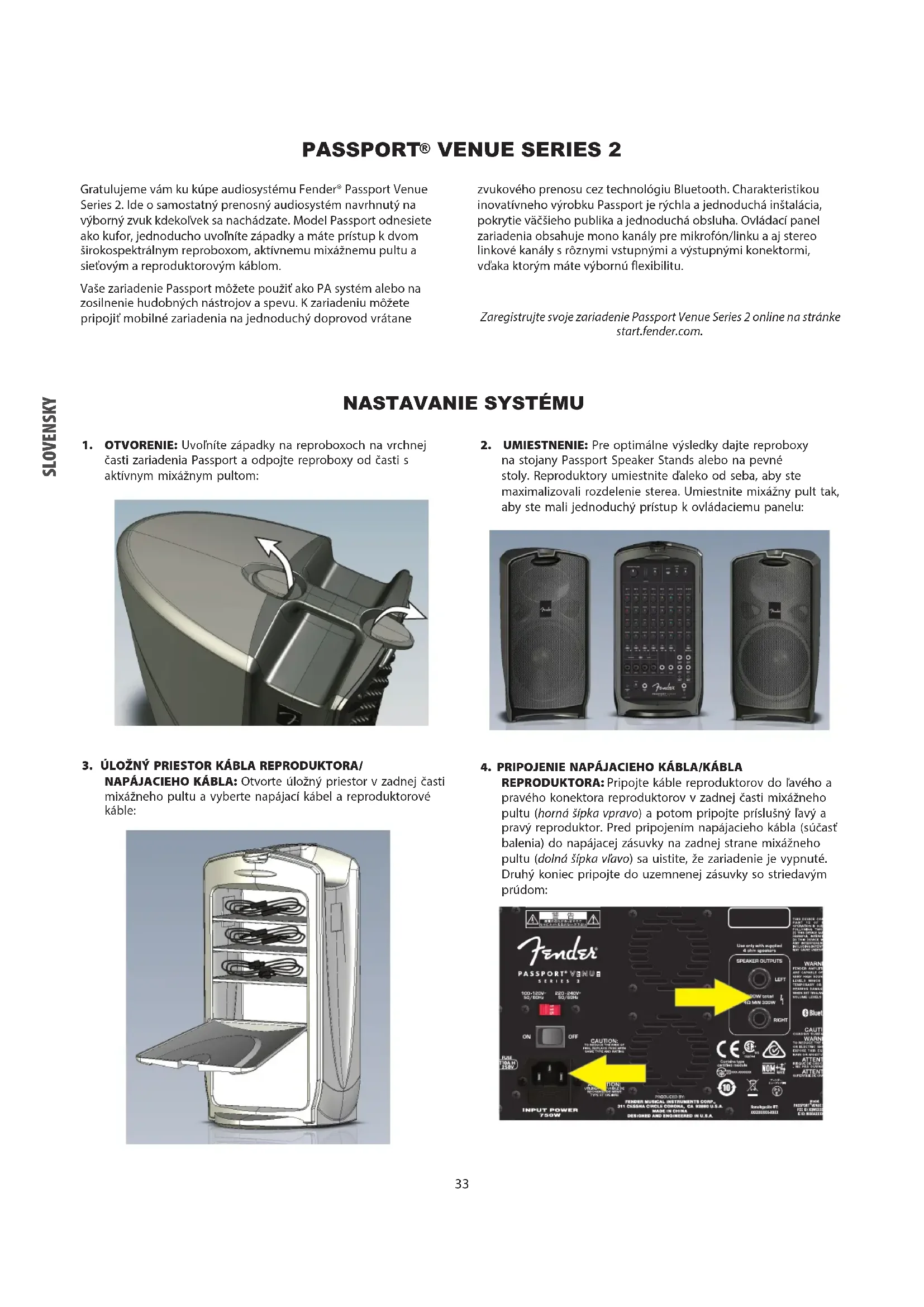 POJISTKA T10A H, 250V TYP ZESILOVAČE Třída D REPRODUKTORY Dva basové woofery 10", dva vysokotónové reproduktory 1,2" ROZMĚRY A HMOTNOST Šířka: 73,6cm Výška: 58,4cm Hloubka: 27,9cm Hmotnost: 19,96kg Technické údaje se mohou změnit bez předchozího upozornění.NASTAVANIE SYSTÉMU Gratulujeme vám ku kúpe audiosystému Fender® Passport Venue Series 2. Ide o samostatný prenosný audiosystém navrhnutý na výborný zvuk kdekoľvek sa nachádzate. Model Passport odnesiete ako kufor, jednoducho uvoľníte západky a máte prístup k dvom širokospektrálnym reproboxom, aktívnemu mixážnemu pultu a sieťovým a reproduktorovým káblom. Vaše zariadenie Passport môžete použiť ako PA systém alebo na zosilnenie hudobných nástrojov a spevu. K zariadeniu môžete pripojiť mobilné zariadenia na jednoduchý doprovod vrátane zvukového prenosu cez technológiu Bluetooth. Charakteristikou inovatívneho výrobku Passport je rýchla a jednoduchá inštalácia, pokrytie väčšieho publika a jednoduchá obsluha. Ovládací panel zariadenia obsahuje mono kanály pre mikrofón/linku a aj stereo linkové kanály s rôznymi vstupnými a výstupnými konektormi, vďaka ktorým máte výbornú flexibilitu. Zaregistrujte svoje zariadenie Passport Venue Series 2 online na stránke start.fender.com. SLOVENSKY PASSPORT