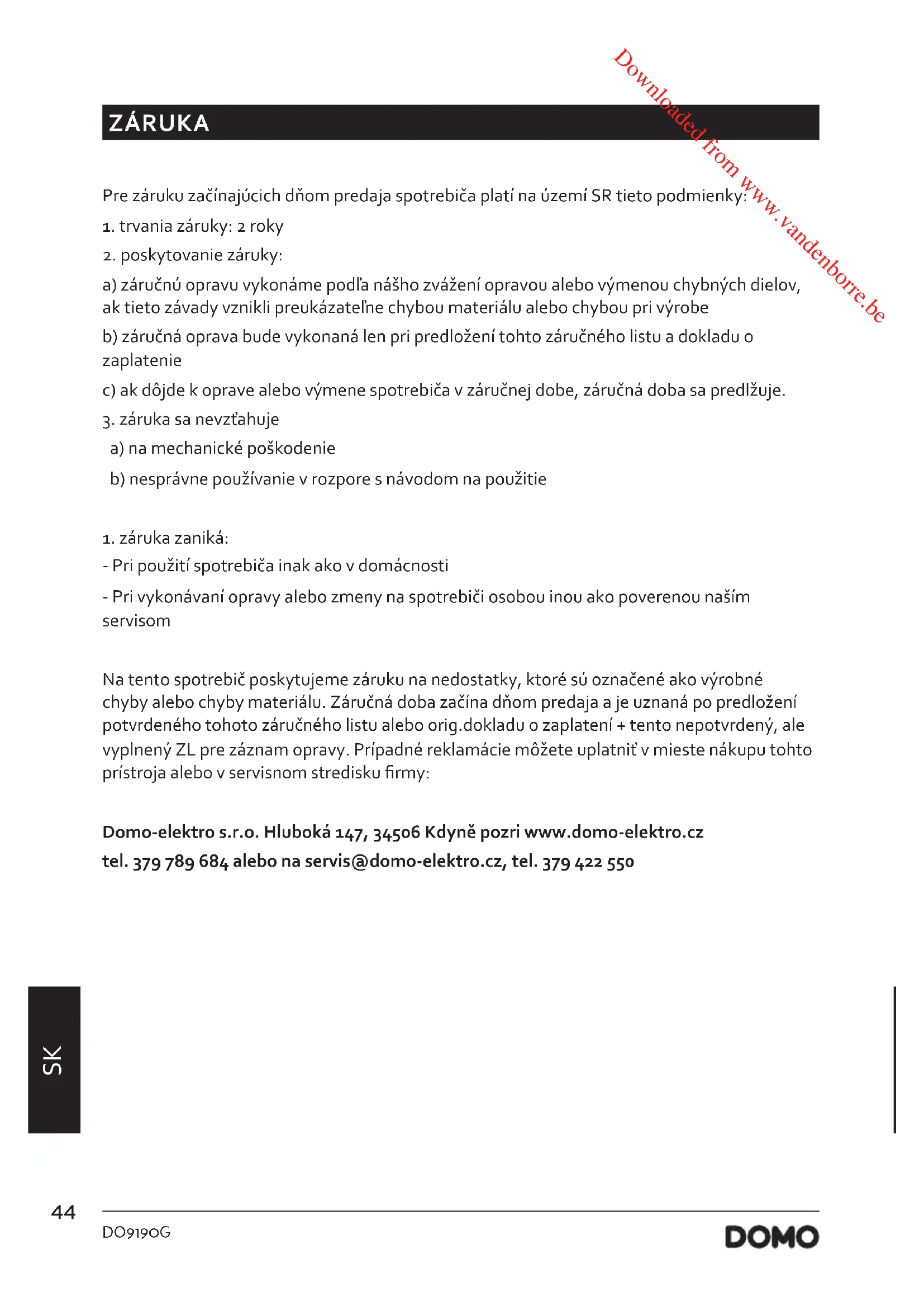 - Pri použití spotrebiča inak ako v domácnosti - Pri vykonávaní opravy alebo zmeny na spotrebiči osobou inou ako poverenou naším servisom Na tento spotrebič poskytujeme záruku na nedostatky, ktoré sú označené ako výrobné chyby alebo chyby materiálu. Záručná doba začína dňom predaja a je uznaná po predložení potvrdeného tohoto záručného listu alebo orig.dokladu o zaplatení + tento nepotvrdený, ale vyplnený ZL pre záznam opravy. Prípadné reklamácie môžete uplatniť v mieste nákupu tohto prístroja alebo v servisnom stredisku rmy: Domo-elektro s.r.o. Hluboká 147, 34506 Kdyně pozri www.domo-elektro.cz tel. 379 789 684 alebo na servis@domo-elektro.cz, tel. 379 422 550 Downloaded from www.vandenborre.be45 DO9190G www.domo-elektro.be