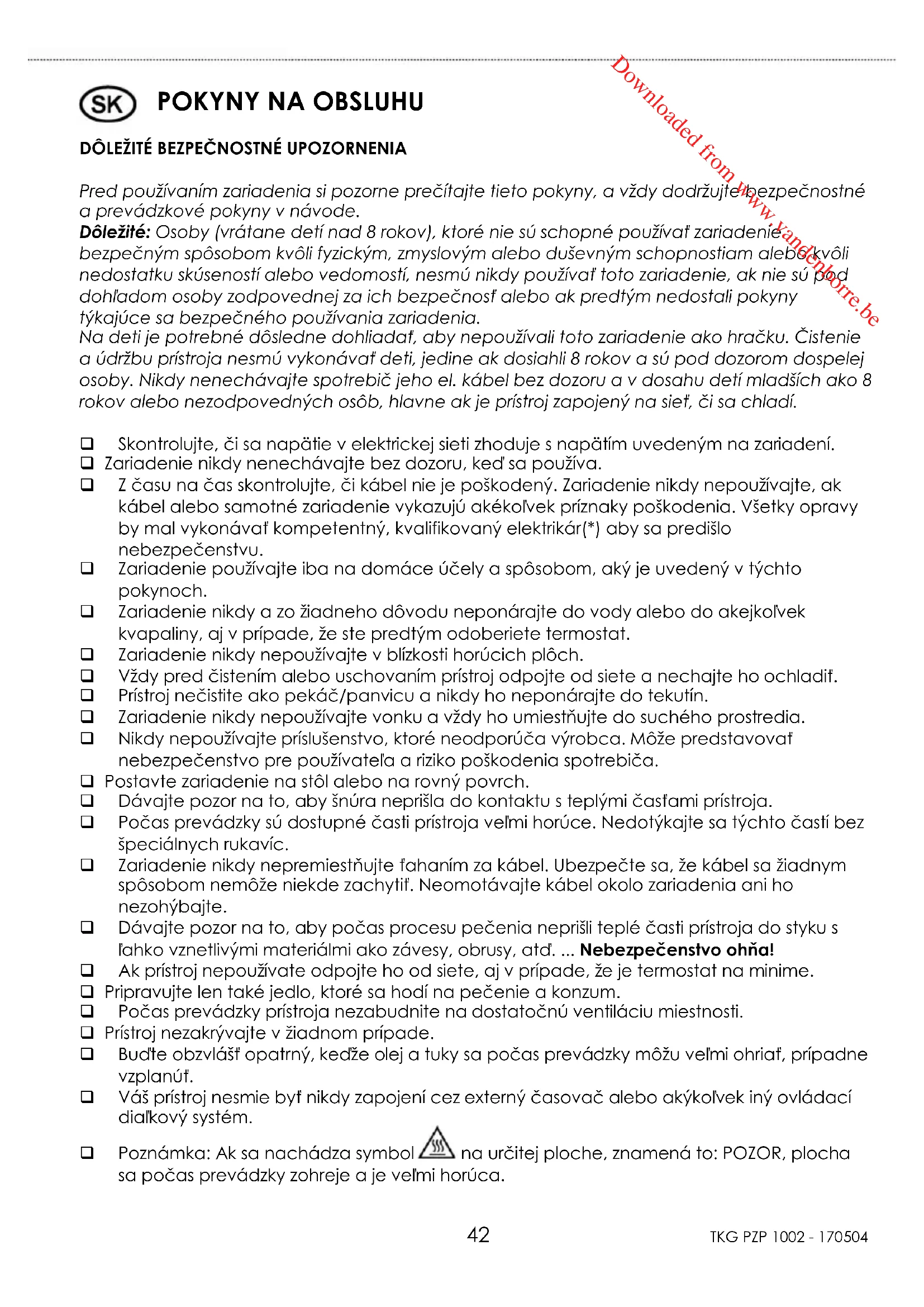 Pred používaním zariadenia si pozorne prečítajte tieto pokyny, a vždy dodržujte bezpečnostné a prevádzkové pokyny v návode. Dôležité: Osoby (vrátane detí nad 8 rokov), ktoré nie sú schopné používať zariadenie bezpečným spôsobom kvôli fyzickým, zmyslovým alebo duševným schopnostiam alebo kvôli nedostatku skúseností alebo vedomostí, nesmú nikdy používať toto zariadenie, ak nie sú pod dohľadom osoby zodpovednej za ich bezpečnosť alebo ak predtým nedostali pokyny týkajúce sa bezpečného používania zariadenia. Na deti je potrebné dôsledne dohliadať, aby nepoužívali toto zariadenie ako hračku. Čistenie a údržbu prístroja nesmú vykonávať deti, jedine ak dosiahli 8 rokov a sú pod dozorom dospelej osoby. Nikdy nenechávajte spotrebič jeho el. kábel bez dozoru a v dosahu detí mladších ako 8 rokov alebo nezodpovedných osôb, hlavne ak je prístroj zapojený na sieť, či sa chladí. Skontrolujte, či sa napätie v elektrickej sieti zhoduje s napätím uvedeným na zariadení. Zariadenie nikdy nenechávajte bez dozoru, keď sa používa. Z času na čas skontrolujte, či kábel nie je poškodený. Zariadenie nikdy nepoužívajte, ak kábel alebo samotné zariadenie vykazujú akékoľvek príznaky poškodenia. Všetky opravy by mal vykonávať kompetentný, kvalifikovaný elektrikár(*) aby sa predišlo nebezpečenstvu. Zariadenie používajte iba na domáce účely a spôsobom, aký je uvedený v týchto pokynoch. Zariadenie nikdy a zo žiadneho dôvodu neponárajte do vody alebo do akejkoľvek kvapaliny, aj v prípade, že ste predtým odoberiete termostat. Zariadenie nikdy nepoužívajte v blízkosti horúcich plôch. Vždy pred čistením alebo uschovaním prístroj odpojte od siete a nechajte ho ochladiť. Prístroj nečistite ako pekáč/panvicu a nikdy ho neponárajte do tekutín. Zariadenie nikdy nepoužívajte vonku a vždy ho umiestňujte do suchého prostredia. Nikdy nepoužívajte príslušenstvo, ktoré neodporúča výrobca. Môže predstavovať nebezpečenstvo pre používateľa a riziko poškodenia spotrebiča. Postavte zariadenie na stôl alebo na rovný povrch. Dávajte pozor na to, aby šnúra neprišla do kontaktu s teplými časťami prístroja. Počas prevádzky sú dostupné časti prístroja veľmi horúce. Nedotýkajte sa týchto častí bez špeciálnych rukavíc. Zariadenie nikdy nepremiestňujte ťahaním za kábel. Ubezpečte sa, že kábel sa žiadnym spôsobom nemôže niekde zachytiť. Neomotávajte kábel okolo zariadenia ani ho nezohýbajte. Dávajte pozor na to, aby počas procesu pečenia neprišli teplé časti prístroja do styku s ľahko vznetlivými materiálmi ako závesy, obrusy, atď. ... Nebezpečenstvo ohňa! Ak prístroj nepoužívate odpojte ho od siete, aj v prípade, že je termostat na minime. Pripravujte len také jedlo, ktoré sa hodí na pečenie a konzum. Počas prevádzky prístroja nezabudnite na dostatočnú ventiláciu miestnosti. Prístroj nezakrývajte v žiadnom prípade. Buďte obzvlášť opatrný, keďže olej a tuky sa počas prevádzky môžu veľmi ohriať, prípadne vzplanúť. Váš prístroj nesmie byť nikdy zapojení cez externý časovač alebo akýkoľvek iný ovládací diaľkový systém. Poznámka: Ak sa nachádza symbol na určitej ploche, znamená to: POZOR, plocha sa počas prevádzky zohreje a je veľmi horúca. Downloaded from www.vandenborre.beCopies of the I/B. Please reproduce them without any changes except under special instruction from Team International BELGIUM. The pages must be reproduced and folded in order to obtain a booklet A5 (+/- 148.5 mm width x 210 mm height). When folding, make sure you keep the good numbering when you turn the pages of the I/B. Don’t change the page numbering. Keep the language integrity.