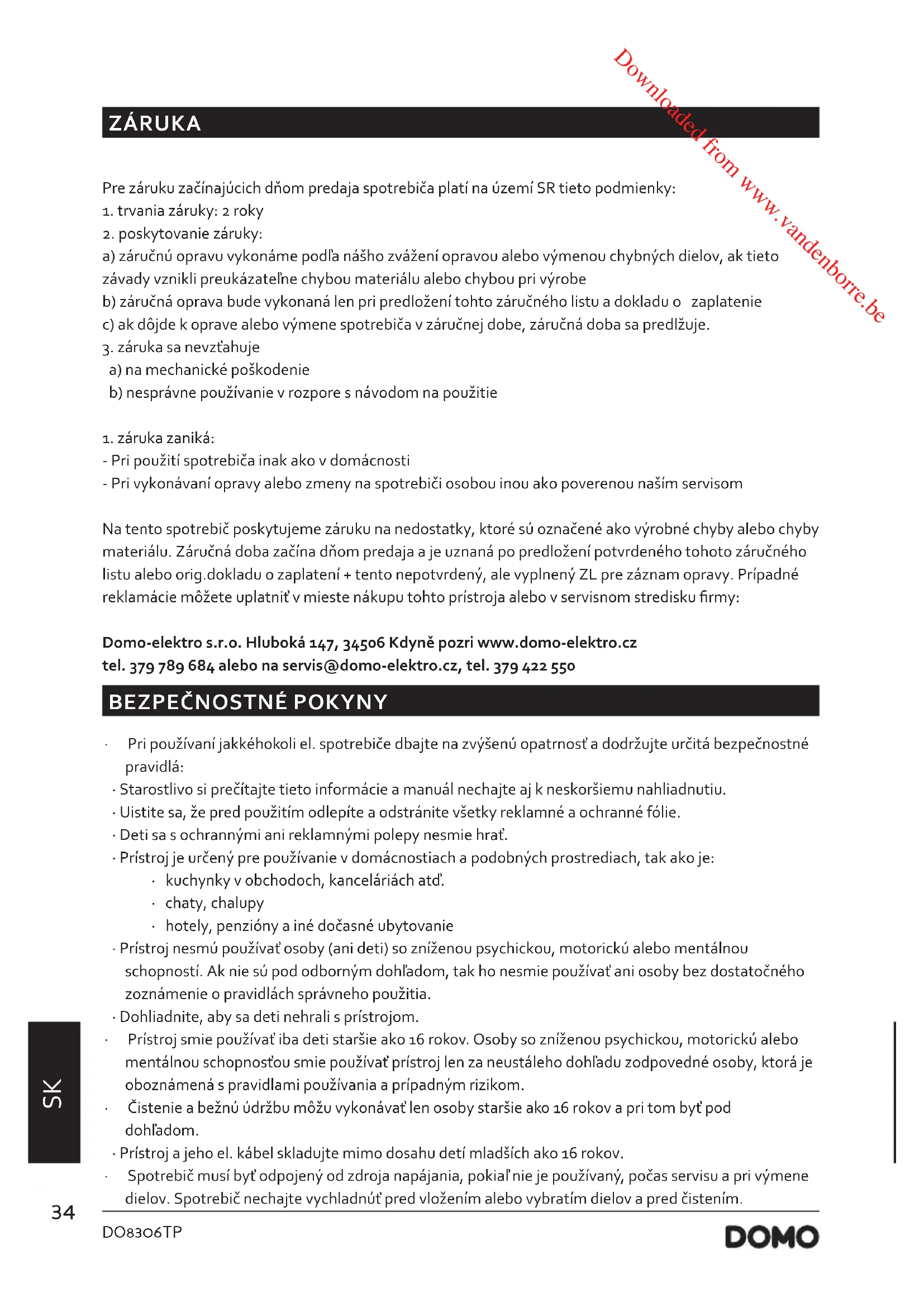 Symbol na prístroji alebo na jeho obale znamená, že s týmto výrobkom nie je možné nakladať ako s domovým odpadom, ale musí byť odovzdaný na miestach určených na zber a likvidáciu elektrických a elektronických zariadení. Dodržaním tohto odporúčania chránite životné prostredie a zdravie spoluobčanov. Viac informácií o možnostiach likvidácie nebezpečného odpadu obdržíte na obecných alebo mestských úradoch, zberných dvoroch alebo v predajni, kde ste prístroj zakúpili. Obalové materiály sú recyklovateľné, nakladajte s nimi podľa predpisov pre životné prostredie. Downloaded from www.vandenborre.be39 DO8306TP www.domo-elektro.be