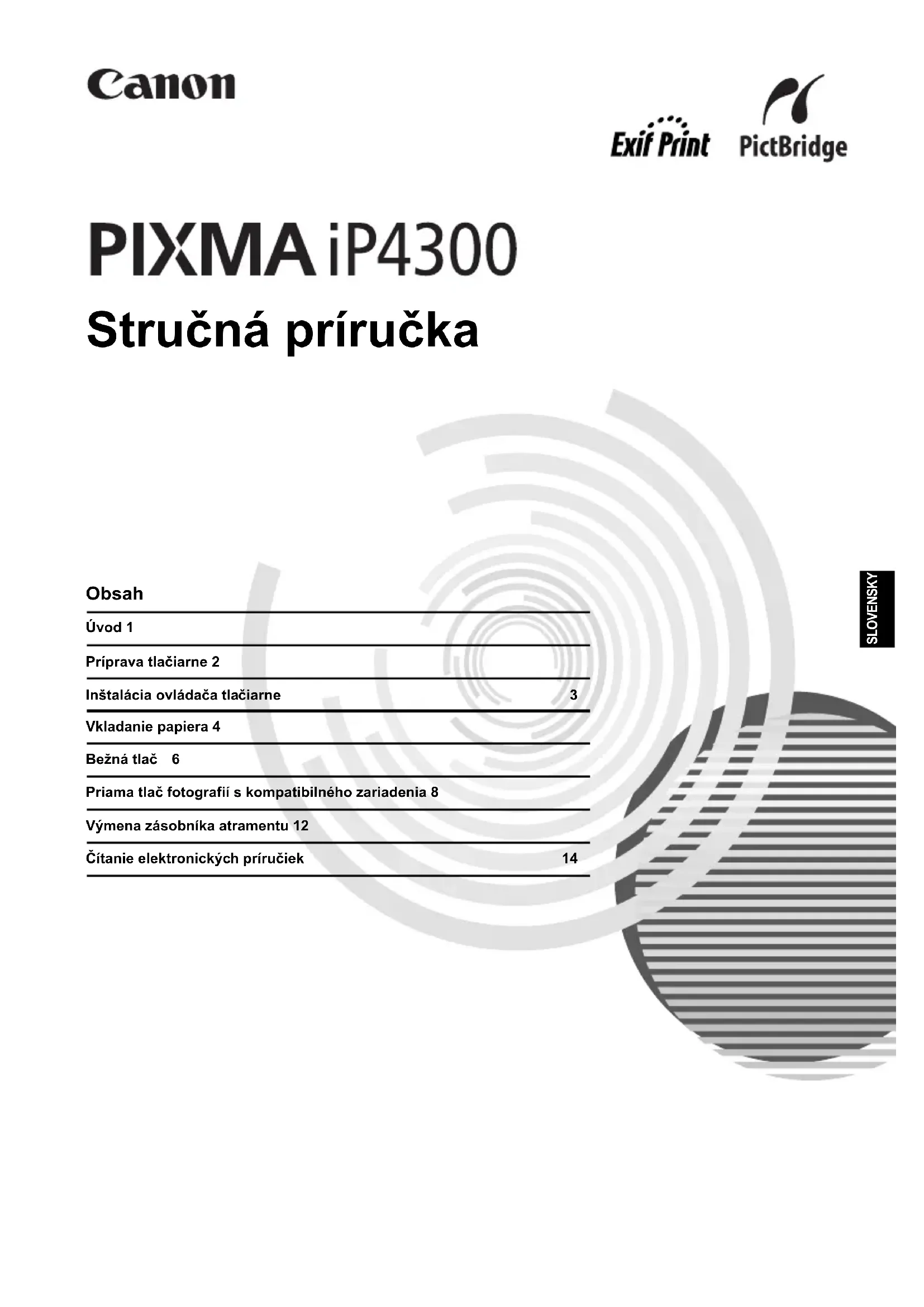 TlaþiareĖ vždy napájajte iba zo štandardných zdrojov napájania, ktoré sa používajú v krajine zakúpenia tlaþiarne. Použitie zdroja s nesprávnym napätím a frekvenciou môže spôsobiĢ požiar alebo úraz elektrickým prúdom. z Zástrþku vždy úplne zasuĖte do sieĢovej zásuvky. Upozornenie z Z bezpeþnostných príþin skladujte zásobníky atramentu mimo dosah malých detí. z Zásobníky atramentu nenechajte spadnúĢ ani s nimi netraste, mohlo by dôjsĢ k úniku atramentu a zneþisteniu odevu alebo rúk. Preþítajte si aj þasĢ „Safety Precautions/Bezpeþnostné opatrenia“ v elektronickej príruþke [User’s Guide/PoužívateĐská príruþka]. Dodržiavajte varovania a upozornenia uvedené v príruþkách. Predídete poškodeniu tlaþiarne alebo zraneniu. ýíslo modelu: K10284 (iP4300)1Úvod SLOVENSKY Úvod Ćakujeme, že ste si kúpili tlaþiareĖ Canon Inkjet. V Struþnej príruþke sú dôležité informácie oznaþené nasledujúcimi symbolmi. Venujte zvýšenú pozornosĢ pokynom, oznaþeným týmito symbolmi. Varovanie Oznaþuje pokyny, nedodržanie ktorých môže spôsobiĢ vážne zranenie alebo úmrtie kvôli nesprávnej þinnosti zariadenia. Uvedené pokyny sa musia dodržiavaĢ kvôli zaisteniu bezpeþnej þinnosti zariadenia. Upozornenie Oznaþuje pokyny, nedodržanie ktorých by mohlo spôsobiĢ zranenie alebo materiálne škody kvôli nesprávnej þinnosti zariadenia. Uvedené pokyny sa musia dodržiavaĢ kvôli zaisteniu bezpeþnej þinnosti zariadenia. Dôležité Pokyny, ktoré sa musia dodržiavaĢ kvôli zaisteniu bezpeþnej þinnosti zariadenia. Poznámky k ochranným známkam z „Windows“ a „Internet Explorer“ sú ochranné známky spoloþnosti Microsoft Corporation, registrované v Spojených štátoch a ćalších krajinách. z „Macintosh“ a „Mac“ sú ochranné známky spoloþnosti Apple Computer, Inc., registrované vUSA a ćalších krajinách. z „Adobe“ a „Adobe RGB (1998)“ sú buć registrované ochranné známky, alebo ochranné známky spoloþnosti Adobe Systems Incorporated v USA a/alebo v ćalších krajinách. Copyright ©2006 CANON INC. Všetky práva vyhradené. Žiadna þasĢ tejto publikácie nesmie byĢ prenášaná ani kopírovaná vakejkoĐvek forme bez predchádzajúceho písomného povolenia spoloþnosti Canon.2 Príprava tlaþiarne SLOVENSKY Príprava tlaþiarne Pred nastavením a prípravou vašej tlaþiarne na prevádzku si musíte najskôr preþítaĢ inštalaþný leták. 1 Zapnite tlaþiareĖ. 2 Nainštalujte tlaþovú hlavu. 3 Nainštalujte zásobníky s atramentom. 4 Vložte papier. V nasledujúcom postupe budete musieĢ vykonaĢ zarovnanie tlaþovej hlavy a do automatického podávaþa listov budete musieĢ vložiĢ list obyþajného papiera formátu A4/Letter. Upozornenie Skontrolujte, þi ste pred zapnutím tlaþiarne odstránili pásky. Poznámka Poloha pásky sa môže meniĢ. Upozornenie Okrem páþky zaistenia tlaþovej hlavy sa nedotýkajte iných vnútorných þastí. Dôležité Ak je vrchný kryt otvorený dlhšie ako 10 minút, držiak tlaþovej hlavy sa presunie doprava. V takomto prípade vrchný kryt zatvorte a znova otvorte. Poznámka