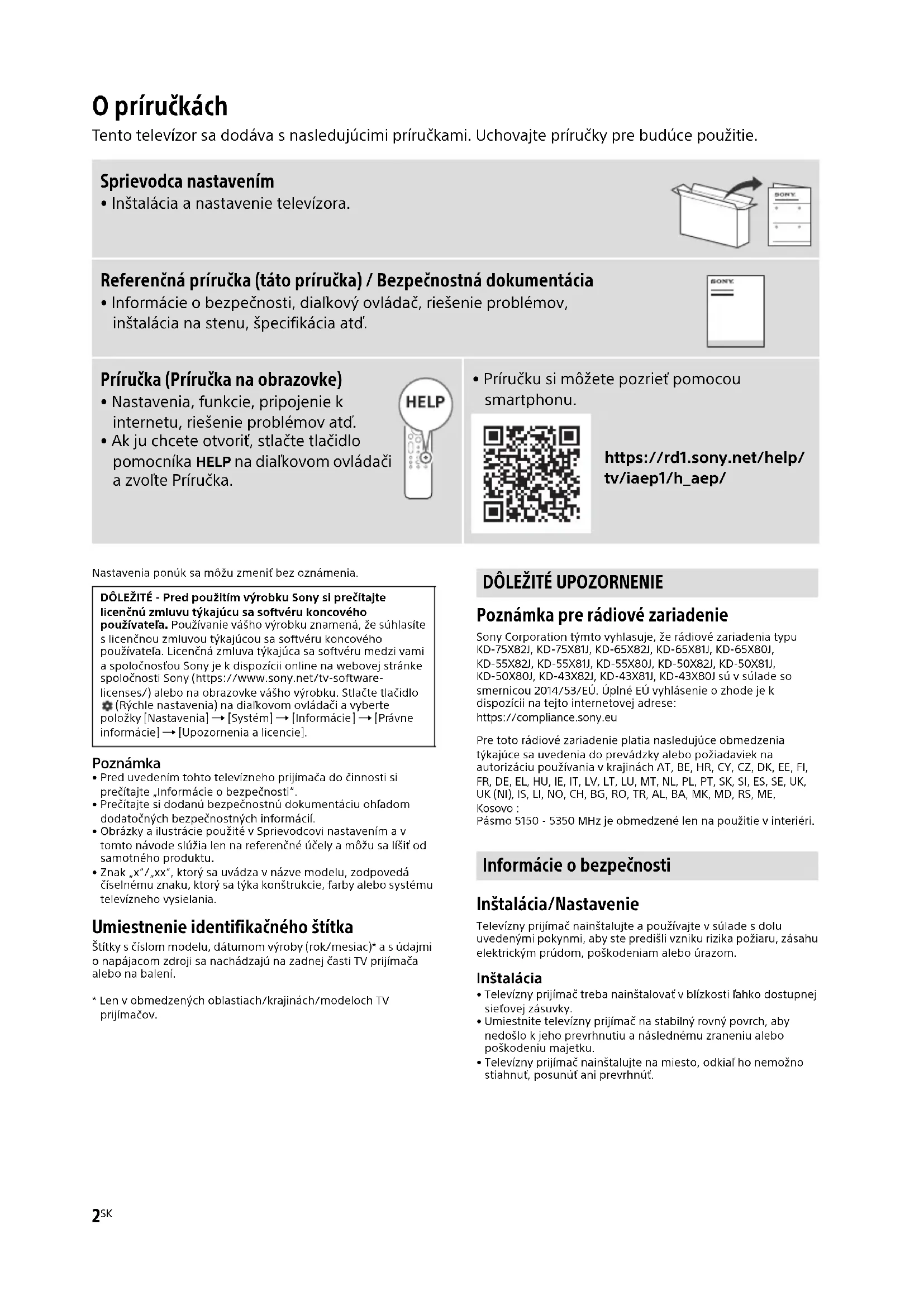 - Len v obmedzených oblastiach/krajinách/modeloch TV prijímačov. Poznámka pre rádiové zariadenie Sony Corporation týmto vyhlasuje, že rádiové zariadenia typu KD-75X82J, KD-75X81J, KD-65X82J, KD-65X81J, KD-65X80J, KD-55X82J, KD-55X81J, KD-55X80J, KD-50X82J, KD-50X81J, KD-50X80J, KD-43X82J, KD-43X81J, KD-43X80J sú v súlade so smernicou 2014/53/EÚ. Úplné EÚ vyhlásenie o zhode je k dispozícii na tejto internetovej adrese: https://compliance.sony.eu Pre toto rádiové zariadenie platia nasledujúce obmedzenia týkajúce sa uvedenia do prevádzky alebo požiadaviek na autorizáciu používania v krajinách AT, BE, HR, CY, CZ, DK, EE, FI, FR, DE, EL, HU, IE, IT, LV, LT, LU, MT, NL, PL, PT, SK, SI, ES, SE, UK, UK (NI), IS, LI, NO, CH, BG, RO, TR, AL, BA, MK, MD, RS, ME, Kosovo : Pásmo 5150 - 5350 MHz je obmedzené len na použitie v interiéri. Inštalácia/Nastavenie Televízny prijímač nainštalujte a používajte v súlade s dolu uvedenými pokynmi, aby ste predišli vzniku rizika požiaru, zásahu elektrickým prúdom, poškodeniam alebo úrazom. Inštalácia