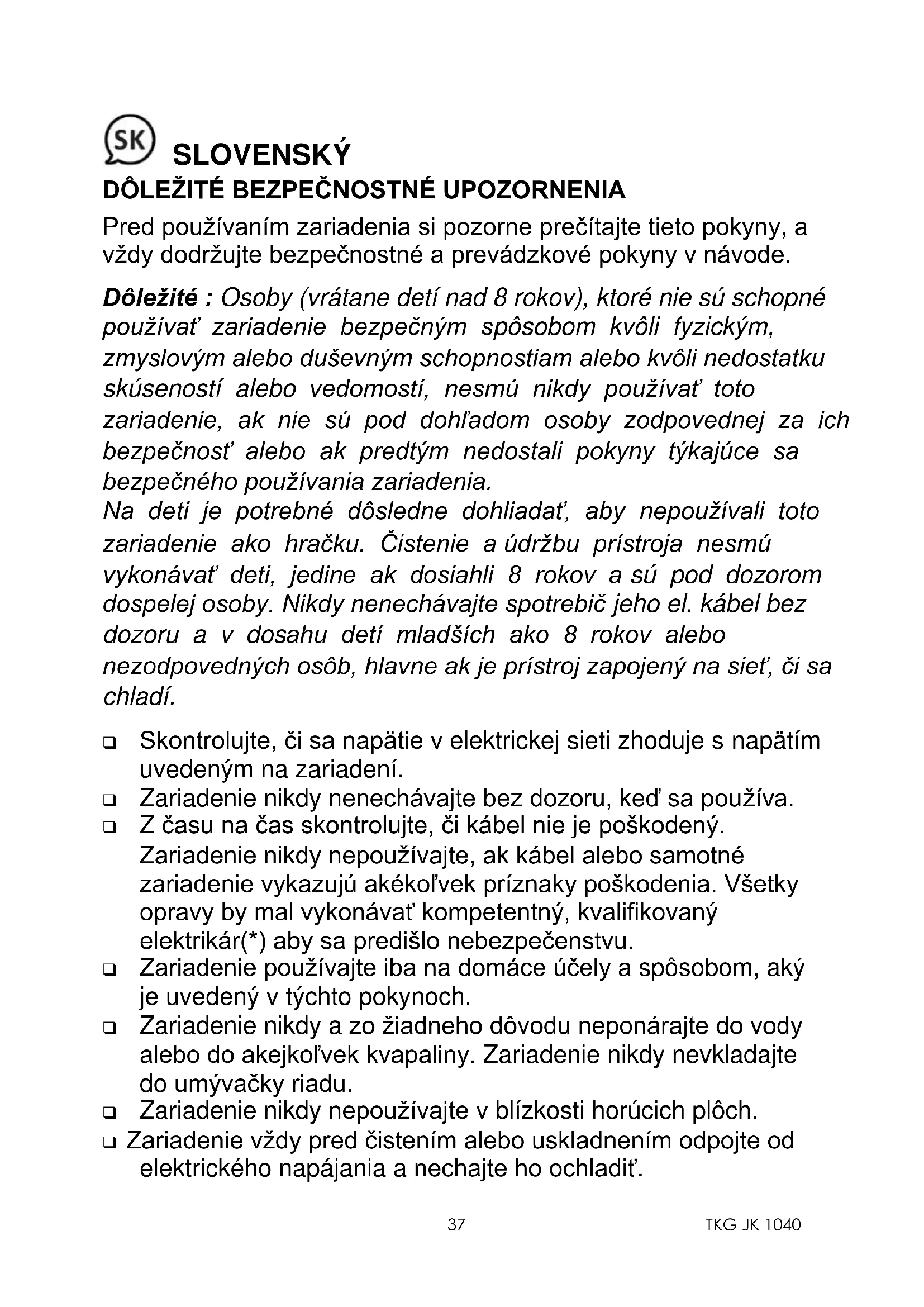 Pred používaním zariadenia si pozorne prečítajte tieto pokyny, a vždy dodržujte bezpečnostné a prevádzkové pokyny v návode. Dôležité : Osoby (vrátane detí nad 8 rokov), ktoré nie sú schopné používať zariadenie bezpečným spôsobom kvôli fyzickým, zmyslovým alebo duševným schopnostiam alebo kvôli nedostatku skúseností alebo vedomostí, nesmú nikdy používať toto zariadenie, ak nie sú pod dohľadom osoby zodpovednej za ich bezpečnosť alebo ak predtým nedostali pokyny týkajúce sa bezpečného používania zariadenia. Na deti je potrebné dôsledne dohliadať, aby nepoužívali toto zariadenie ako hračku. Čistenie a údržbu prístroja nesmú vykonávať deti, jedine ak dosiahli 8 rokov a sú pod dozorom dospelej osoby. Nikdy nenechávajte spotrebič jeho el. kábel bez dozoru a v dosahu detí mladších ako 8 rokov alebo nezodpovedných osôb, hlavne ak je prístroj zapojený na sieť, či sa chladí. ❑ Skontrolujte, či sa napätie v elektrickej sieti zhoduje s napätím uvedeným na zariadení. ❑ Zariadenie nikdy nenechávajte bez dozoru, keď sa používa. ❑ Z času na čas skontrolujte, či kábel nie je poškodený. Zariadenie nikdy nepoužívajte, ak kábel alebo samotné zariadenie vykazujú akékoľvek príznaky poškodenia. Všetky opravy by mal vykonávať kompetentný, kvalifikovaný elektrikár(*) aby sa predišlo nebezpečenstvu. ❑ Zariadenie používajte iba na domáce účely a spôsobom, aký je uvedený v týchto pokynoch. ❑ Zariadenie nikdy a zo žiadneho dôvodu neponárajte do vody alebo do akejkoľvek kvapaliny. Zariadenie nikdy nevkladajte do umývačky riadu. ❑ Zariadenie nikdy nepoužívajte v blízkosti horúcich plôch. ❑ Zariadenie vždy pred čistením alebo uskladnením odpojte od elektrického napájania a nechajte ho ochladiť.TKG JK 1040