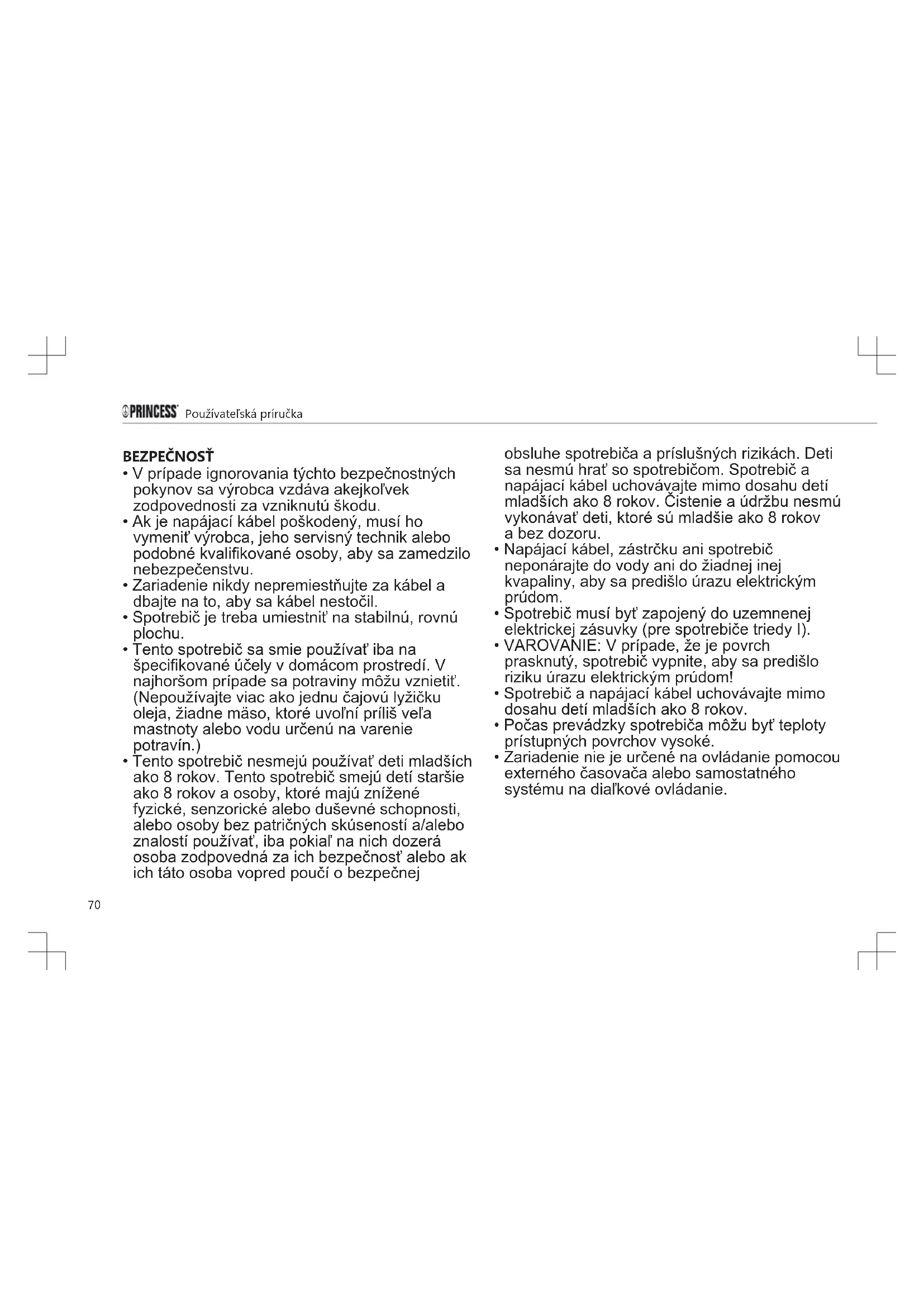 - Tento spotrebič nesmejú používať deti mladších ako 8 rokov. Tento spotrebič smejú detí staršie ako 8 rokov a osoby, ktoré majú znížené fyzické, senzorické alebo duševné schopnosti, alebo osoby bez patričných skúseností a/alebo znalostí používať, iba pokiaľ na nich dozerá osoba zodpovedná za ich bezpečnosť alebo ak ich táto osoba vopred poučí o bezpečnej obsluhe spotrebiča a príslušných rizikách. Deti sa nesmú hrať so spotrebičom. Spotrebič a napájací kábel uchovávajte mimo dosahu detí mladších ako 8 rokov. Čistenie a údržbu nesmú vykonávať deti, ktoré sú mladšie ako 8 rokov abez dozoru.