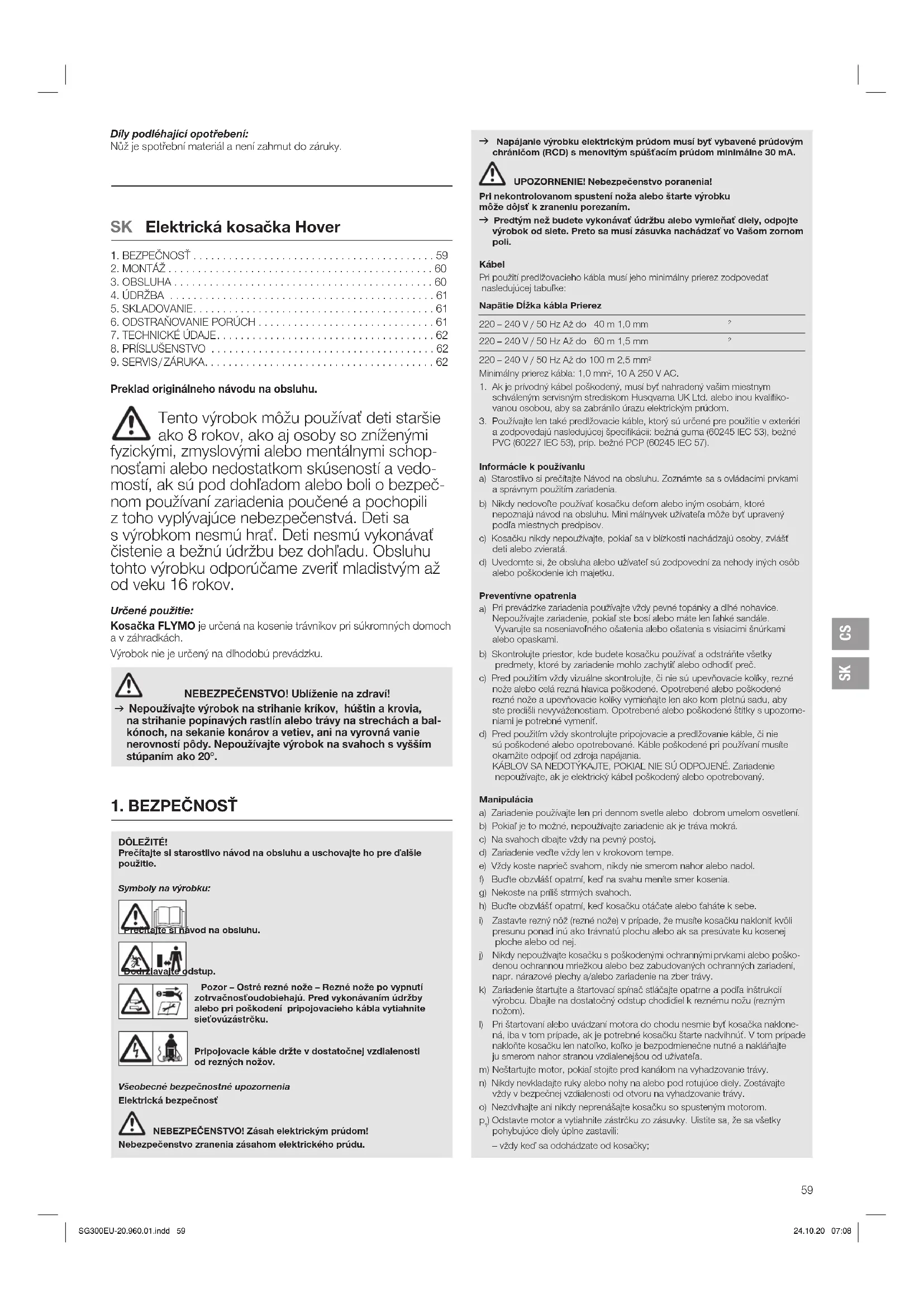 Preklad originálneho návodu na obsluhu. Tento výrobok môžu používať deti staršie ako 8 rokov, ako aj osoby so zníženými fyzickými, zmyslovými alebo mentálnymi schop- nosťami alebo nedostatkom skúseností a vedo- mostí, ak sú pod dohľadom alebo boli o bezpeč- nom používaní zariadenia poučené a pochopili ztoho vyplývajúce nebezpečenstvá. Deti sa svýrobkom nesmú hrať. Deti nesmú vykonávať čistenie a bežnú údržbu bez dohľadu. Obsluhu tohto výrobku odporúčame zveriť mladistvým až od veku 16 rokov. Určené použitie: Kosačka FLYMO je určená na kosenie trávnikov pri súkromných domoch a v záhradkách. Výrobok nie je určený na dlhodobú prevádzku. NEBEZPEČENSTVO! Ublíženie na zdraví! v Nepoužívajte výrobok na strihanie kríkov, húštin a krovia, na strihanie popínavých rastlín alebo trávy na strechách a bal- kónoch, na sekanie konárov a vetiev, ani na vyrovná vanie nerovností pôdy. Nepoužívajte výrobok na svahoch s vyšším stúpaním ako 20°. DÔLEŽITÉ! Prečítajte si starostlivo návod na obsluhu a uschovajte ho pre ďalšie použitie. Symboly na výrobku: Prečítajte si návod na obsluhu. Dodržiavajte odstup. Pozor – Ostré rezné nože – Rezné nože po vypnutí zotrvačnosťou dobiehajú. Pred vykonávaním údržby alebo pri poškodení pripojovacieho kábla vytiahnite sieťovú zástrčku. Pripojovacie káble držte v dostatočnej vzdialenosti od rezných nožov. Všeobecné bezpečnostné upozornenia Elektrická bezpečnosť NEBEZPEČENSTVO! Zásah elektrickým prúdom! Nebezpečenstvo zranenia zásahom elektrického prúdu.