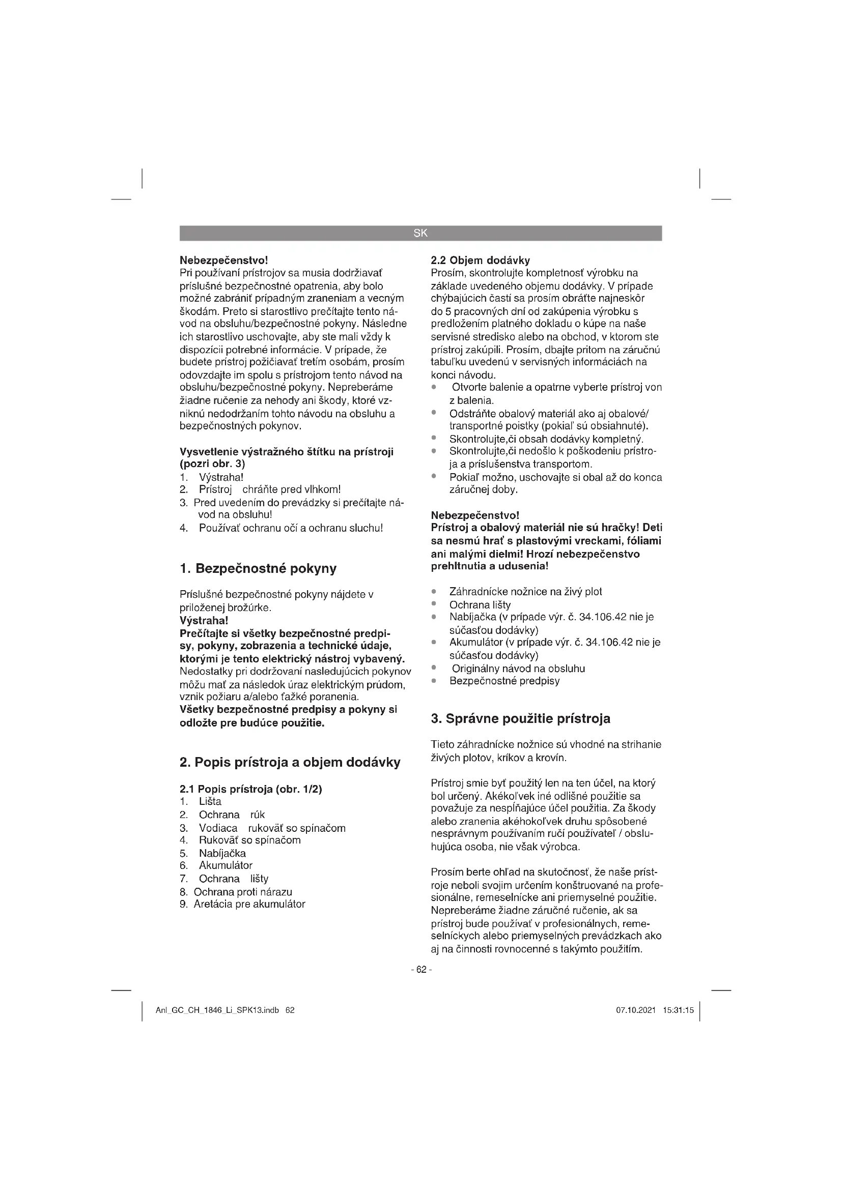 Tieto záhradnícke nožnice sú vhodné na strihanie živých plotov, kríkov a krovín. Prístroj smie byť použitý len na ten účel, na ktorý bol určený. Akékoľvek iné odlišné použitie sa považuje za nespĺňajúce účel použitia. Za škody alebo zranenia akéhokoľvek druhu spôsobené nesprávnym používaním ručí používateľ / obslu- hujúca osoba, nie však výrobca. Prosím berte ohľad na skutočnosť, že naše príst- roje neboli svojim určením konštruované na profe- sionálne, remeselnícke ani priemyselné použitie. Nepreberáme žiadne záručné ručenie, ak sa prístroj bude používať v profesionálnych, reme- selníckych alebo priemyselných prevádzkach ako aj na činnosti rovnocenné s takýmto použitím. Anl_GC_CH_1846_Li_SPK13.indb 62Anl_GC_CH_1846_Li_SPK13.indb 62 07.10.2021 15:31:1507.10.2021 15:31:15SK