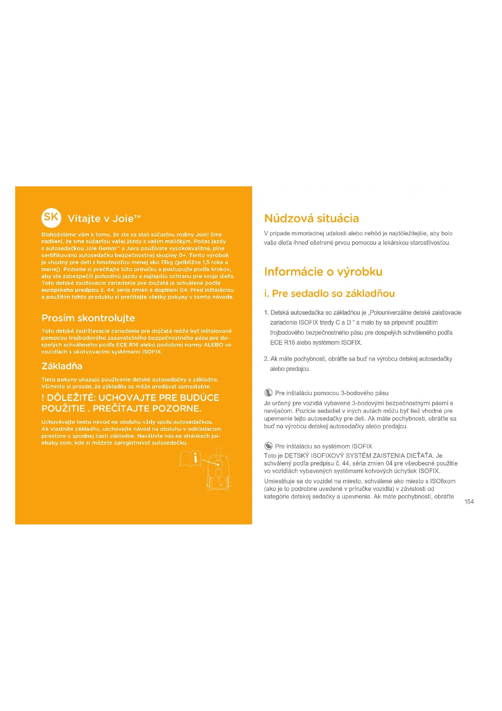 Vitajte v Joie™ Blahoželáme vám k tomu, že ste sa stali súčasťou rodiny Joie! Sme nadšení, že sme súčasťou vašej jazdy s vašim maličkým. Počas jazdy s autosedačkou Joie Gemm™ a Juva používate vysokokvalitnú, plne certifikovanú autosedačku bezpečnostnej skupiny 0+. Tento výrobok je vhodný pre deti s hmotnosťou menej ako 13kg (približne 1,5 roka a menej). Pozorne si prečítajte túto príručku a postupujte podľa krokov, aby ste zabezpečili pohodlnú jazdu a najlepšiu ochranu pre svoje dieťa. Toto detské zaisťovacie zariadenie pre dojčatá je schválené podľa európskeho predpisu č. 44, séria zmien a doplnení 04. Pred inštaláciou a použitím tohto produktu si prečítajte všetky pokyny v tomto návode. Prosím skontrolujte Toto detské zadržiavacie zariadenie pre dojčatá môže byť inštalované pomocou trojbodového zasúvateľného bezpečnostného pásu pre do-spelých schváleného podľa ECE R16 alebo podobnej normy ALEBO vo vozidlách s ukotvovacími systémami ISOFIX. Základňa Tieto pokyny ukazujú používanie detské autosedačky a základne. Všimnite si prosím, že základňa sa môže predávať samostatne. ! DÔLEŽITÉ: UCHOVAJTE PRE BUDÚCE POUŽITIE . PREČÍTAJTE POZORNE. Uchovávajte tento návod na obsluhu vždy spolu autosedačkou. Ak vlastníte základňu, uschovajte návod na obsluhu v odkladacom priestore v spodnej časti základne. Navštívte nás na stránkach joi-ebaby.com, kde si môžete zaregistrovať autosedačku. Núdzová situácia V prípade mimoriadnej udalosti alebo nehôd je najdôležitejšie, aby bolo vaše dieťa ihneď ošetrené prvou pomocou a lekárskou starostlivosťou. Informácie o výrobku