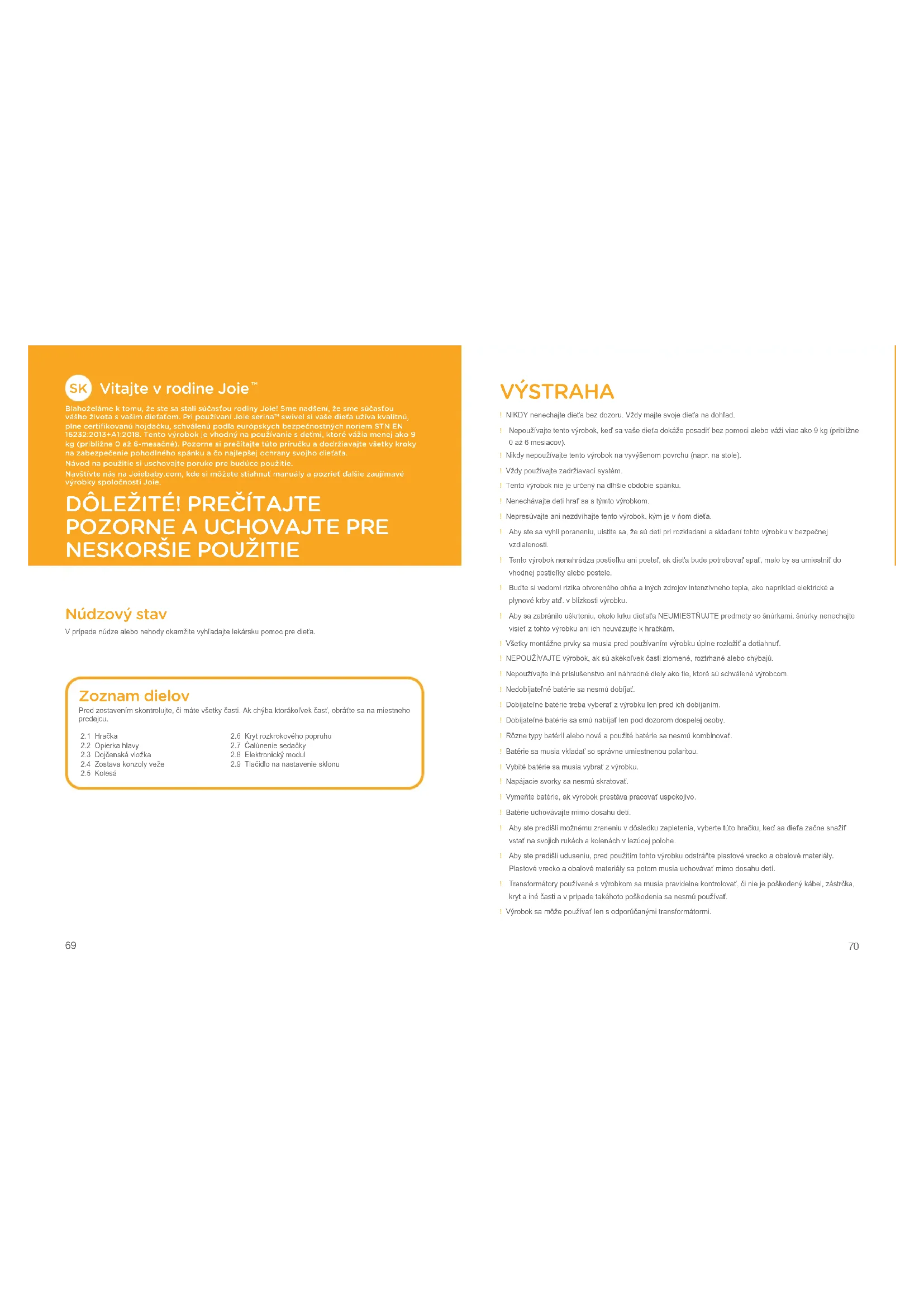 Núdzový stav V prípade núdze alebo nehody okamžite vyhľadajte lekársku pomoc pre dieťa. VÝSTRAHA ! NIKDY nenechajte dieťa bez dozoru. Vždy majte svoje dieťa na dohľad. ! Nepoužívajte tento výrobok, keď sa vaše dieťa dokáže posadiť bez pomoci alebo váži viac ako 9 kg (približne 0 až 6 mesiacov).! Nikdy nepoužívajte tento výrobok na vyvýšenom povrchu (napr. na stole).! Vždy používajte zadržiavací systém.! Tento výrobok nie je určený na dlhšie obdobie spánku.! Nenechávajte deti hrať sa s týmto výrobkom.! Nepresúvajte ani nezdvíhajte tento výrobok, kým je v ňom dieťa. ! Aby ste sa vyhli poraneniu, uistite sa, že sú deti pri rozkladaní a skladaní tohto výrobku v bezpečnej vzdialenosti. ! Tento výrobok nenahrádza postieľku ani posteľ, ak dieťa bude potrebovať spať, malo by sa umiestniť do vhodnej postieľky alebo postele. ! Buďte si vedomí rizika otvoreného ohňa a iných zdrojov intenzívneho tepla, ako napríklad elektrické a plynové krby atď. v blízkosti výrobku. ! Aby sa zabránilo uškrteniu, okolo krku dieťaťa NEUMIESTŇUJTE predmety so šnúrkami, šnúrky nenechajte visieť z tohto výrobku ani ich neuväzujte k hračkám.! Všetky montážne prvky sa musia pred používaním výrobku úplne rozložiť a dotiahnuť.! NEPOUŽÍVAJTE výrobok, ak sú akékoľvek časti zlomené, roztrhané alebo chýbajú.! Nepoužívajte iné príslušenstvo ani náhradné diely ako tie, ktoré sú schválené výrobcom.! Nedobíjateľné batérie sa nesmú dobíjať.! Dobíjateľné batérie treba vyberať z výrobku len pred ich dobíjaním.! Dobíjateľné batérie sa smú nabíjať len pod dozorom dospelej osoby.! Rôzne typy batérií alebo nové a použité batérie sa nesmú kombinovať.! Batérie sa musia vkladať so správne umiestnenou polaritou.! Vybité batérie sa musia vybrať z výrobku.! Napájacie svorky sa nesmú skratovať.! Vymeňte batérie, ak výrobok prestáva pracovať uspokojivo.! Batérie uchovávajte mimo dosahu detí. ! Aby ste predišli možnému zraneniu v dôsledku zapletenia, vyberte túto hračku, keď sa dieťa začne snažiť vstať na svojich rukách a kolenách v lezúcej polohe. ! Aby ste predišli uduseniu, pred použitím tohto výrobku odstráňte plastové vrecko a obalové materiály. Plastové vrecko a obalové materiály sa potom musia uchovávať mimo dosahu detí. ! Transformátory používané s výrobkom sa musia pravidelne kontrolovať, či nie je poškodený kábel, zástrčka, kryt a iné časti a v prípade takéhoto poškodenia sa nesmú používať.! Výrobok sa môže používať len s odporúčanými transformátormi. Zoznam dielov Pred zostavením skontrolujte, či máte všetky časti. Ak chýba ktorákoľvek časť, obráťte sa na miestneho predajcu. 2.6 Kryt rozkrokového popruhu 2.7 Čalúnenie sedačky 2.8 Elektronický modul 2.9 Tlačidlo na nastavenie sklonu 2.1 Hračka 2.2 Opierka hlavy 2.3 Dojčenská vložka 2.4 Zostava konzoly veže 2.5 Kolesá71