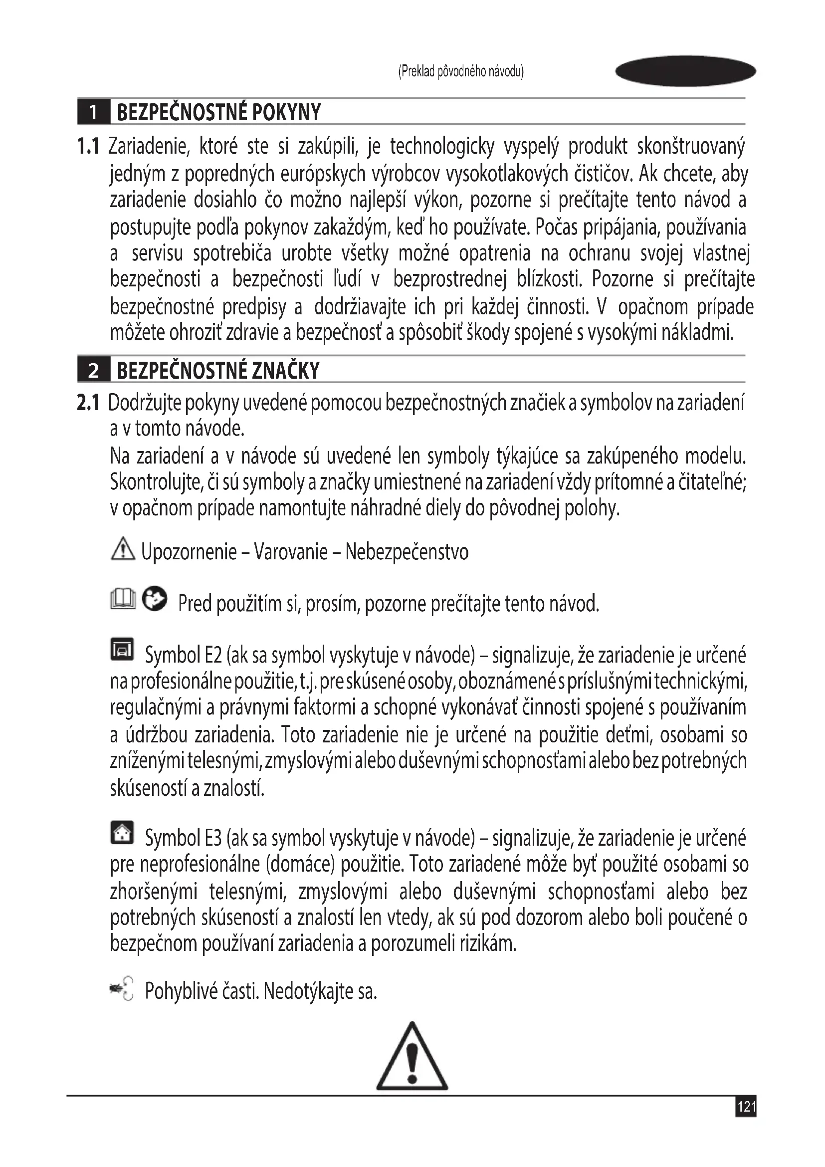a v tomto návode. Na zariadení a v návode sú uvedené len symboly týkajúce sa zakúpeného modelu. Skontrolujte, či sú symboly a značky umiestnené na zariadení vždy prítomné a čitateľné; v opačnom prípade namontujte náhradné diely do pôvodnej polohy. Upozornenie – Varovanie – Nebezpečenstvo Pred použitím si, prosím, pozorne prečítajte tento návod. Symbol E2 (ak sa symbol vyskytuje v návode) – signalizuje, že zariadenie je určené na profesionálne použitie, t.j. pre skúsené osoby, oboznámené s príslušnými technickými, regulačnými a právnymi faktormi a schopné vykonávať činnosti spojené s používaním a údržbou zariadenia. Toto zariadenie nie je určené na použitie deťmi, osobami so zníženými telesnými, zmyslovými alebo duševnými schopnosťami alebo bez potrebných skúseností aznalostí. Symbol E3 (ak sa symbol vyskytuje v návode) – signalizuje, že zariadenie je určené pre neprofesionálne (domáce) použitie. Toto zariadené môže byť použité osobami so zhoršenými telesnými, zmyslovými alebo duševnými schopnosťami alebo bez potrebných skúseností a znalostí len vtedy, ak sú pod dozorom alebo boli poučené o bezpečnom používaní zariadenia a porozumeli rizikám. Pohyblivé časti. Nedotýkajte sa.122 SLOVENSKY SLOVENSKY (Preklad pôvodného návodu) (Preklad pôvodného návodu)