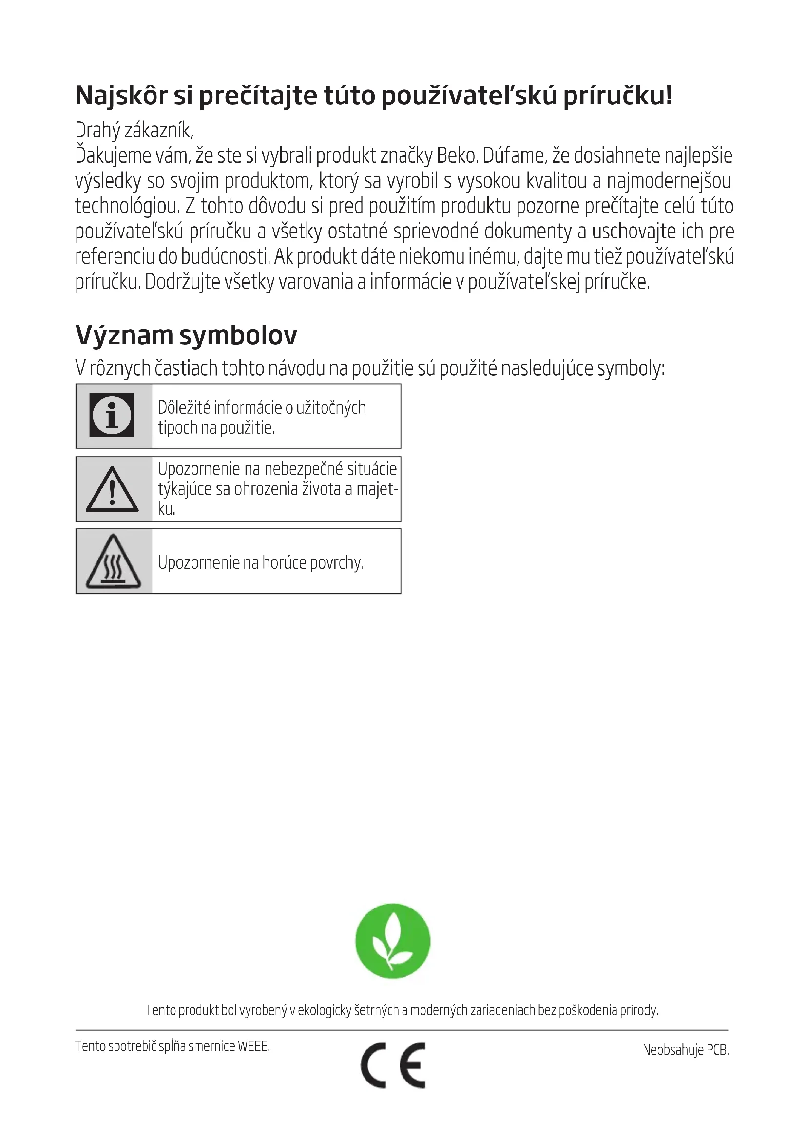 su prljavi. Pogledajte odjeljak „Čišćenje i održavanje” za čišćenje prljavih dijelova.Najskôr si prečítajte túto používateľskú príručku! Drahý zákazník, Ďakujeme vám, že ste si vybrali produkt značky Beko. Dúfame, že dosiahnete najlepšie výsledky so svojim produktom, ktorý sa vyrobil s vysokou kvalitou a najmodernejšou technológiou. Z tohto dôvodu si pred použitím produktu pozorne prečítajte celú túto používateľskú príručku a všetky ostatné sprievodné dokumenty a uschovajte ich pre referenciu do budúcnosti. Ak produkt dáte niekomu inému, dajte mu tiež používateľskú príručku. Dodržujte všetky varovania a informácie v používateľskej príručke. Význam symbolov V rôznych častiach tohto návodu na použitie sú použité nasledujúce symboly: