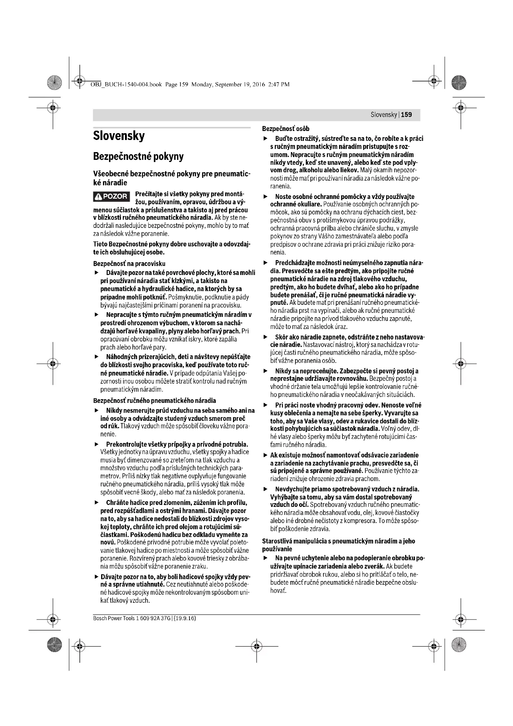 Ak existuje možnosť namontovať odsávacie zariadenie a zariadenie na zachytávanie prachu, presvedčte sa, či sú pripojené a správne používané. Používanie týchto za- riadení znižuje ohrozenie zdravia prachom. Nevdychujte priamo spotrebovaný vzduch z náradia. Vyhýbajte sa tomu, aby sa vám dostal spotrebovaný vzduch do očí. Spotrebovaný vzduch ručného pneumatic- kého náradia môže obsahovať vodu, olej, kovové čiastočky alebo iné drobné nečistoty z kompresora. To môže spôso- biť poškodenie zdravia. Starostlivá manipulácia s pneumatickým náradím a jeho používanie Na pevné uchytenie alebo na podopieranie obrobku po- užívajte upínacie zariadenia alebo zverák. Ak budete pridržiavať obrobok rukou, alebo si ho pritláčať o telo, ne- budete môcť ručné pneumatické náradie bezpečne obslu- hovať. POZOR OBJ_BUCH-1540-004.book Page 159 Monday, September 19, 2016 2:47 PM160 | Slovensky 1 609 92A 37G | (19.9.16) Bosch Power Tools Ručné pneumatické náradie nikdy nepreťažujte. Použí- vajte také pneumatické náradie, ktoré je určené pre da- ný druh práce. Pomocou vhodného pneumatického nára- dia budete pracovať lepšie a bezpečnejšie v uvedenom roz- sahu výkonu náradia. Nepoužívajte nikdy také ručné pneumatické náradie, ktoré má pokazený vypínač. Ručné pneumatické nára- die, ktoré sa nedá zapnúť alebo vypnúť, je nebezpečné a treba ho poslať do opravy. Predtým ako začnete vykonávať na náradí nastavova- nie, vymieňať príslušenstvo a pred dlhším nepoužíva- ním náradia vždy prerušte prívod tlakového vzduchu. Toto preventívne bezpečnostné opatrenie zabraňuje ne- úmyselnému spusteniu ručného pneumatického náradia. Nepoužívané ručné pneumatické náradie uschovávajte tak, aby bolo mimo dosahu detí. Nedovoľte používať pneumatické náradie osobám, ktoré s ním nie sú dôver- ne oboznámené, alebo ktoré si neprečítali tieto Poky- ny. Ručné pneumatické náradie je nebezpečné vtedy, keď ho používajú neskúsené osoby. Ručné pneumatické náradie starostlivo ošetrujte. Kon- trolujte, či pohyblivé súčiastky ručného pneumatické- ho náradia bezchybne fungujú, alebo či neblokujú, či nie sú zlomené alebo poškodené niektoré súčiastky, ktoré by mohli negatívne ovplyvňovať fungovanie ruč- ného pneumatického náradia. Pred použitím ručného pneumatického náradia dajte poškodené súčiastky opraviť. Veľa pracovných úrazov bolo spôsobených ne- dostatočnou údržbou ručného pneumatického náradia. Rezné nástroje udržiavajte ostré a čisté. Starostlivo ošetrované rezné nástroje s ostrými reznými hranami majú menšiu tendenciu k zablokovaniu a ľahšie sa dajú viesť. Ručné pneumatické náradie, príslušenstvo, pracovné nástroje atď. používajte podľa týchto pokynov. Pri prá- ci zohľadnite konkrétne pracovné podmienky a čin- nosť, ktorú budete vykonávať. Takýmto spôsobom sa v maximálnej možnej miere zredukuje produkovanie prachu, vibrácií a hluku. Ručné pneumatické náradie smú inštalovať a pripravo- vať, nastavovať alebo používať výlučne iba kvalifikova- ní a zaškolení pracovníci. Na tomto ručnom pneumatickom náradí sa nesmú vy- konávať žiadne zmeny. Zmeny by mohli znížiť účinnosť bezpečnostných opatrení a zvýšiť riziko pre obsluhujúci personál. Servis Ručné pneumatické náradie nechávajte opravovať len kvalifikovanému personálu, ktorý používa originálne náhradné súčiastky. Tým sa zaručí, že bezpečnosť ručné- ho pneumatického náradia zostane zachovaná. Bezpečnostné pokyny pre pneumatické vŕtačky Prekontrolujte, či je typový štítok náradia čitateľný. V prípade potreby si obstarajte náhradný štítok od výrobcu produktu. Ak sa zlomí pracovný nástroj, alebo niektorá časť prís- lušenstva, prípadne dokonca samotné pneumatické náradie, môže dôjsť k vymršteniu niektorej zo súčias- tok obrovskou rýchlosťou. Pri používaní pneumatického náradia, ako aj pri jeho oprave alebo údržbe a pri výmene náhradných súčias- tok náradia treba vždy používať ochranu zraku odolá- vajúcu nárazom. Stupeň požadovanej ochrany treba konkrétne zvážiť pre každý jednotlivý prípad použitia osobitnen. Obsluhujúca osoba a takisto aj personál vykonávajúci údržbu musia byť v stave fyzicky zvládnuť veľkosť, hmotnosť a výkon tohto pneumatického náradia. Buďte pripravený na neočakávané pohyby pneumatic- kého náradia, ktoré môžu vzniknúť následkom reakč- ných síl alebo v prípade zlomenia použitého pracovné- ho nástroja. Ručné pneumatické náradie držte pevne a svoje telo a svoje ruky udržiavajte vždy v takej polohe, aby ste prípadný spätný ráz náradia mohli zachytiť. Tie- to preventívne bezpečnostné opatrenia Vám pomôžu vy- hnúť sa poraneniam. Keď sa pracovný nástroj zablokuje, ručné pneumatické náradie okamžite vypnite. Buďte pripravený na vznik intenzívnych reakčných momentov, ktoré spôsobia spätný ráz náradia. Pracovný nástroj sa zablokuje v tých- to prípadoch: – keď je náradie preťažené, – keď sa náradie zaseklo v obrábanom materiáli – v ob- robku, alebo – keď prechádza cez obrábaný materiál hrotom. Používajte pomocné prostriedky na zachytenie reakč- ných momentov, ako je napríklad prípravok na podop- retie. V takom prípade, keď to nie je možné, použite prídavnú rukoväť. Nikdy nedávajte svoju ruku do blízkosti rotujúceho pra- covného nástroja. Mohli by ste sa poraniť. V prípade prerušenia dodávky tlakového vzduchu ale- bo pri redukovanom prevádzkovom tlaku ručné pneumatické náradie vypnite. Skontrolujte prevádzkový tlak a pri optimálnom prevádzkovom tlaku náradie znova zapnite. Pri používaní tohto ručného pneumatického náradia môže mať obsluhujú