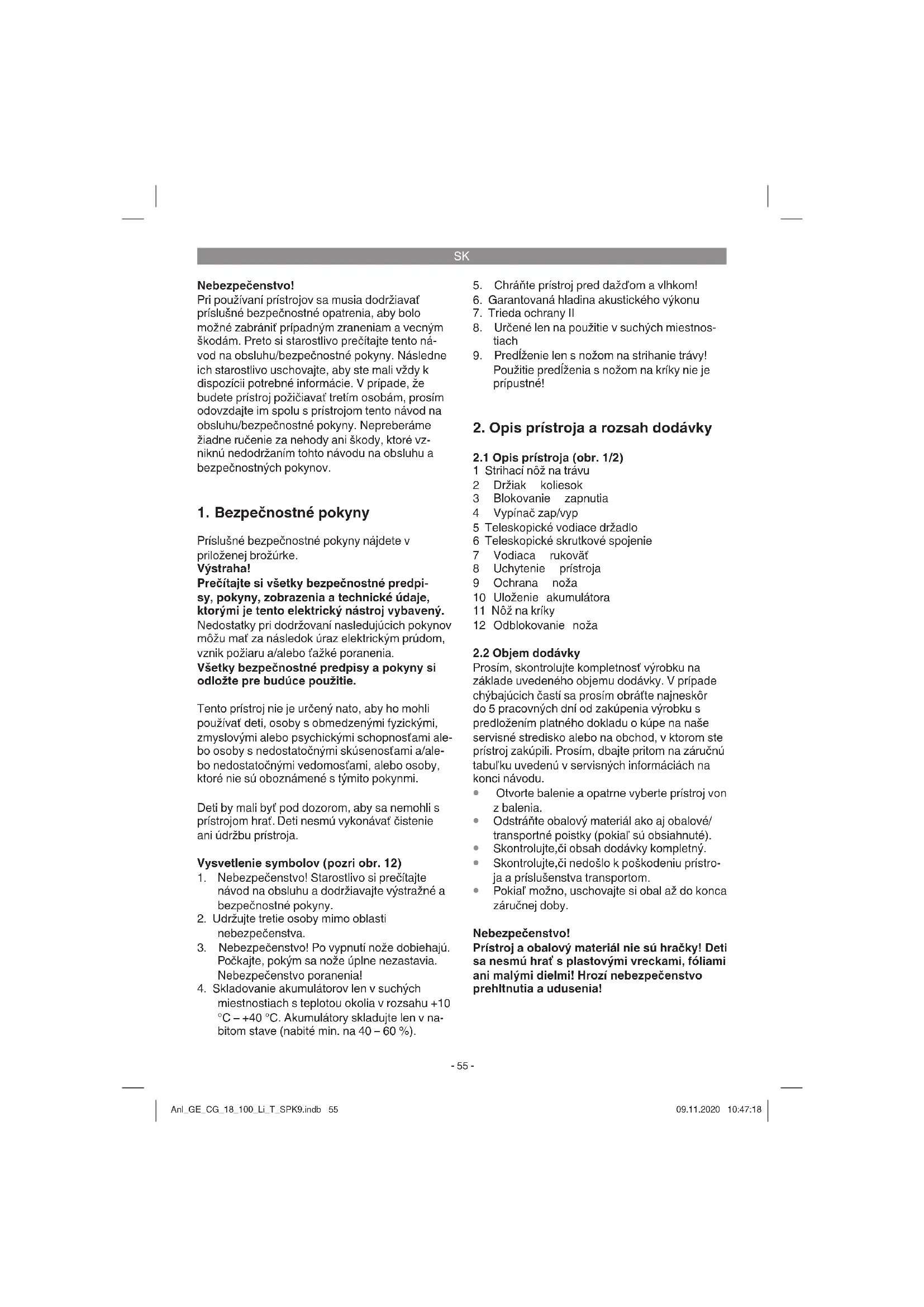 Pokiaľ možno, uschovajte si obal až do konca záručnej doby. Nebezpečenstvo! Prístroj a obalový materiál nie sú hračky! Deti sa nesmú hrať s plastovými vreckami, fóliami ani malými dielmi! Hrozí nebezpečenstvo prehltnutia a udusenia! Anl_GE_CG_18_100_Li_T_SPK9.indb 55Anl_GE_CG_18_100_Li_T_SPK9.indb 55 09.11.2020 10:47:1809.11.2020 10:47:18SK