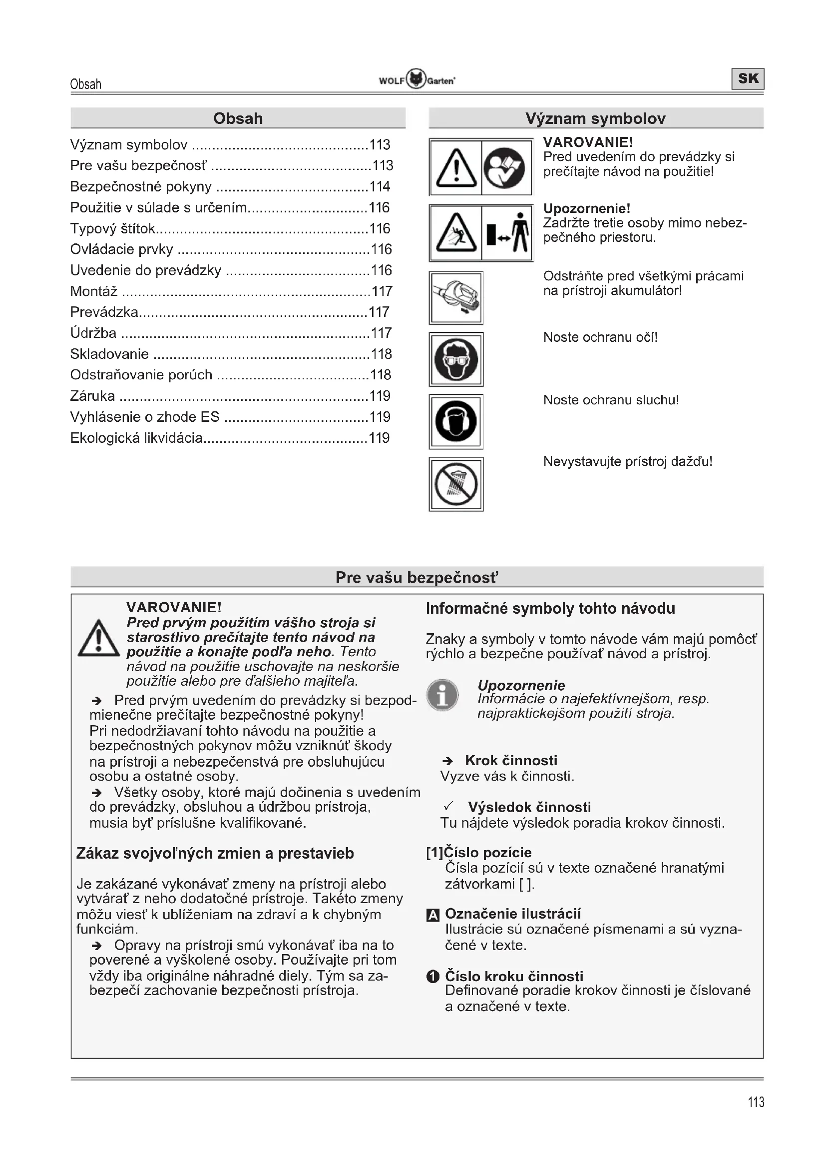 VAROVANIE! Pred prvým použitím vášho stroja si starostlivo prečítajte tento návod na použitie a konajte podľa neho. Tento návod na použitie uschovajte na neskoršie použitie alebo pre ďalšieho majiteľa. Î Pred prvým uvedením do prevádzky si bezpod- mienečne prečítajte bezpečnostné pokyny! Pri nedodržiavaní tohto návodu na použitie a bezpečnostných pokynov môžu vzniknúť škody na prístroji a nebezpečenstvá pre obsluhujúcu osobu a ostatné osoby. Î Všetky osoby, ktoré majú dočinenia s uvedením do prevádzky, obsluhou a údržbou prístroja, musia byť príslušne kvalikované. Zákaz svojvoľných zmien a prestavieb Je zakázané vykonávať zmeny na prístroji alebo vytvárať z neho dodatočné prístroje. Takéto zmeny môžu viesť k ublíženiam na zdraví a k chybným funkciám. Î Opravy na prístroji smú vykonávať iba na to poverené a vyškolené osoby. Používajte pri tom vždy iba originálne náhradné diely. Tým sa za- bezpečí zachovanie bezpečnosti prístroja. Informačné symboly tohto návodu Znaky a symboly v tomto návode vám majú pomôcť rýchlo a bezpečne používať návod a prístroj. Upozornenie Informácie o najefektívnejšom, resp. najpraktickejšom použití stroja. Î Krok činnosti Vyzve vás k činnosti. 3 Výsledok činnosti Tu nájdete výsledok poradia krokov činnosti. [1]Číslo pozície Čísla pozícií sú v texte označené hranatými zátvorkami [ ].