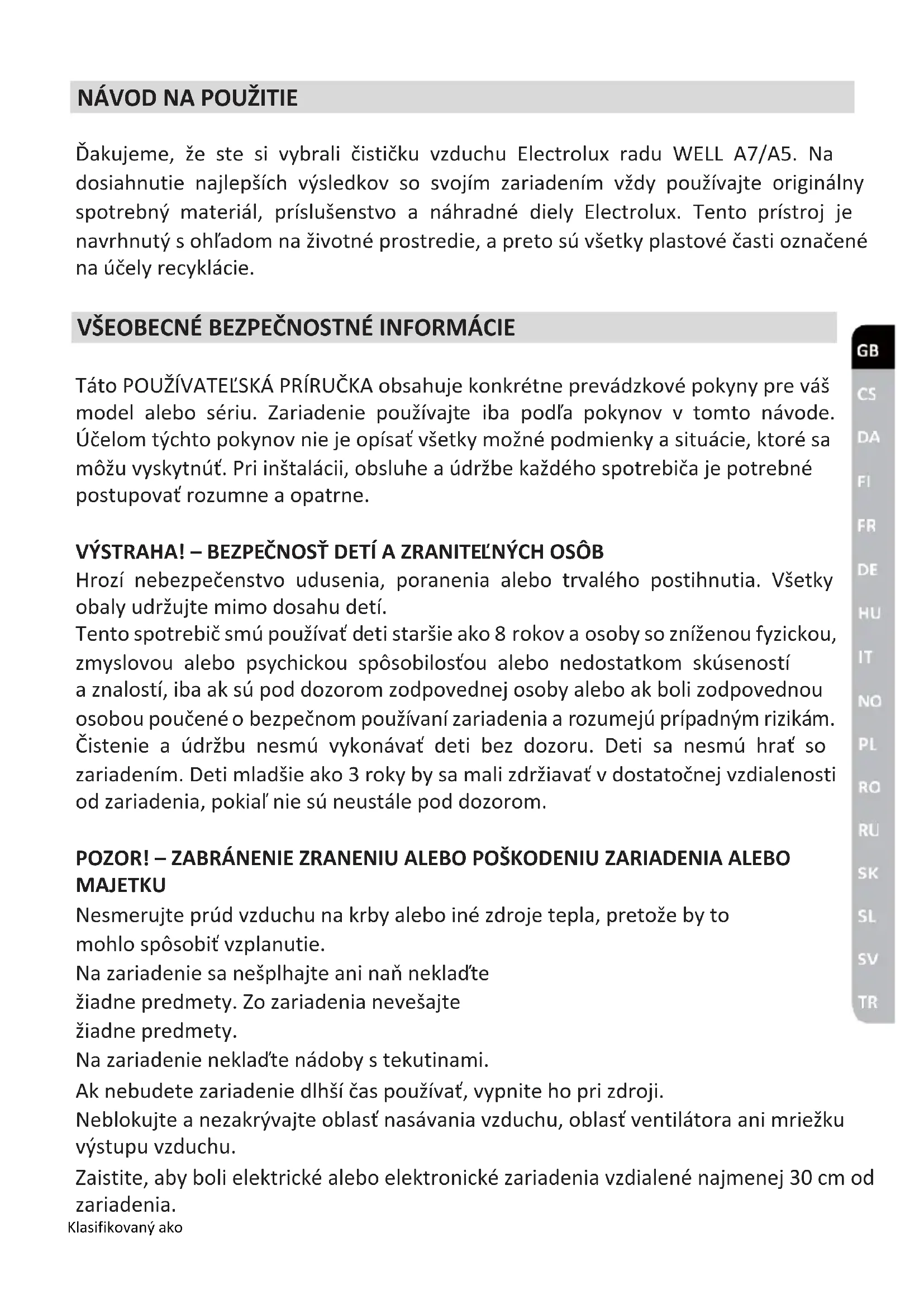 Ďakujeme, že ste si vybrali čističku vzduchu Electrolux radu WELL A7/A5. Na dosiahnutie najlepších výsledkov so svojím zariadením vždy používajte originálny spotrebný materiál, príslušenstvo a náhradné diely Electrolux. Tento prístroj je navrhnutý s ohľadom na životné prostredie, a preto sú všetky plastové časti označené na účely recyklácie.