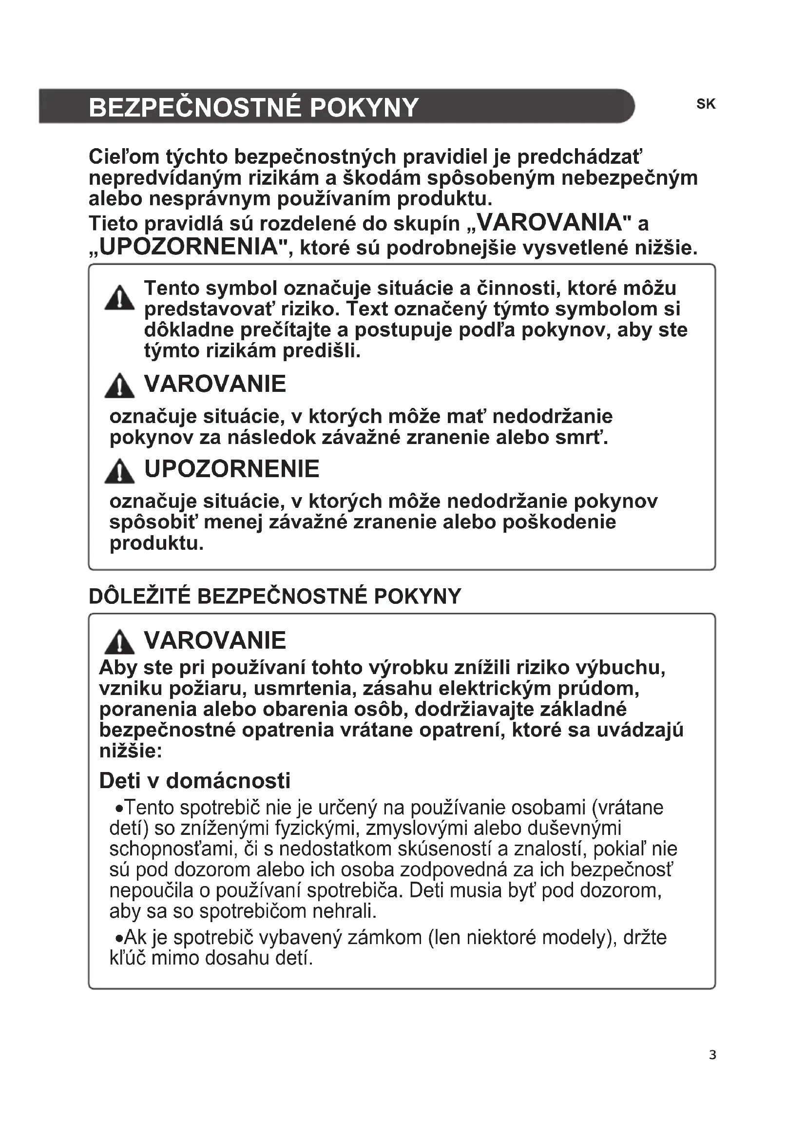 VAROVANIE Aby ste pri používaní tohto výrobku znížili riziko výbuchu, vzniku požiaru, usmrtenia, zásahu elektrickým prúdom, poranenia alebo obarenia osôb, dodržiavajte základné bezpečnostné opatrenia vrátane opatrení, ktoré sa uvádzajú nižšie: Deti v domácnosti