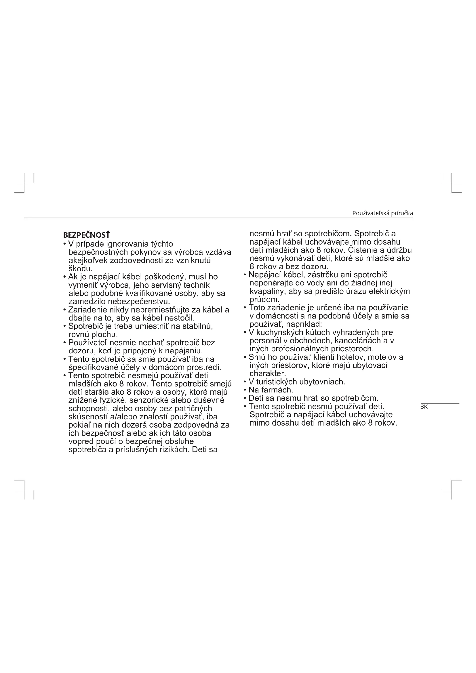 - Tento spotrebič nesmú používať deti. Spotrebič a napájací kábel uchovávajte mimo dosahu detí mladších ako 8 rokov. SKPoužívateľská príručka