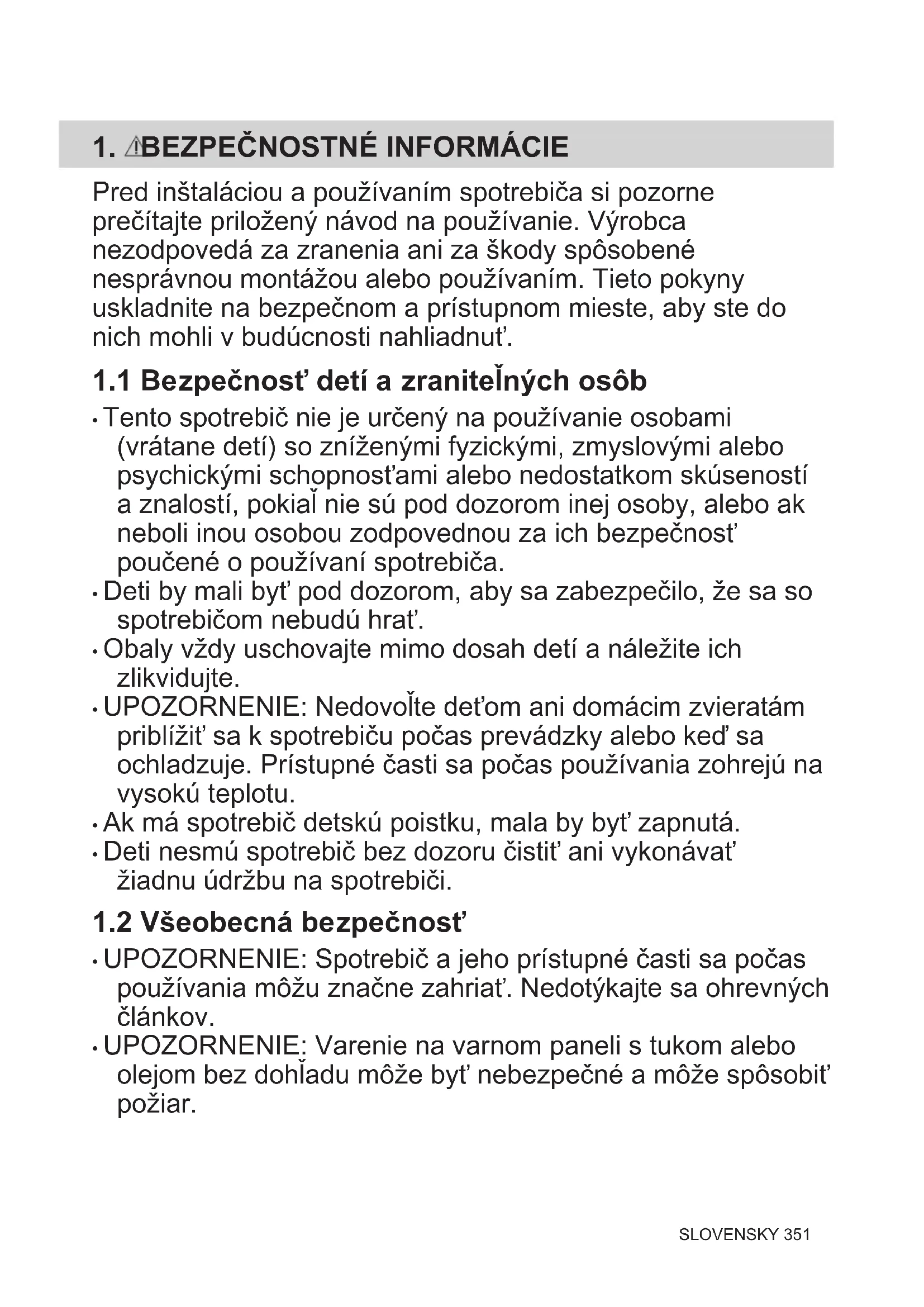 - Tento spotrebič nie je určený na používanie osobami (vrátane detí) so zníženými fyzickými, zmyslovými alebo psychickými schopnosťami alebo nedostatkom skúseností a znalostí, pokiaľ nie sú pod dozorom inej osoby, alebo ak neboli inou osobou zodpovednou za ich bezpečnosť poučené o používaní spotrebiča.