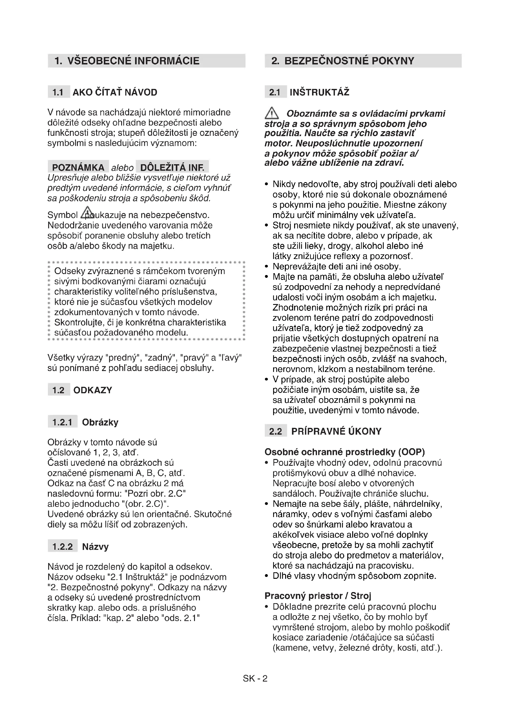 Návod je rozdelený do kapitol a odsekov. Názov odseku "2.1 Inštruktáž" je podnázvom "2. Bezpečnostné pokyny". Odkazy na názvy a odseky sú uvedené prostredníctvom skratky kap. alebo ods. a príslušného čísla. Príklad: "kap. 2" alebo "ods. 2.1"