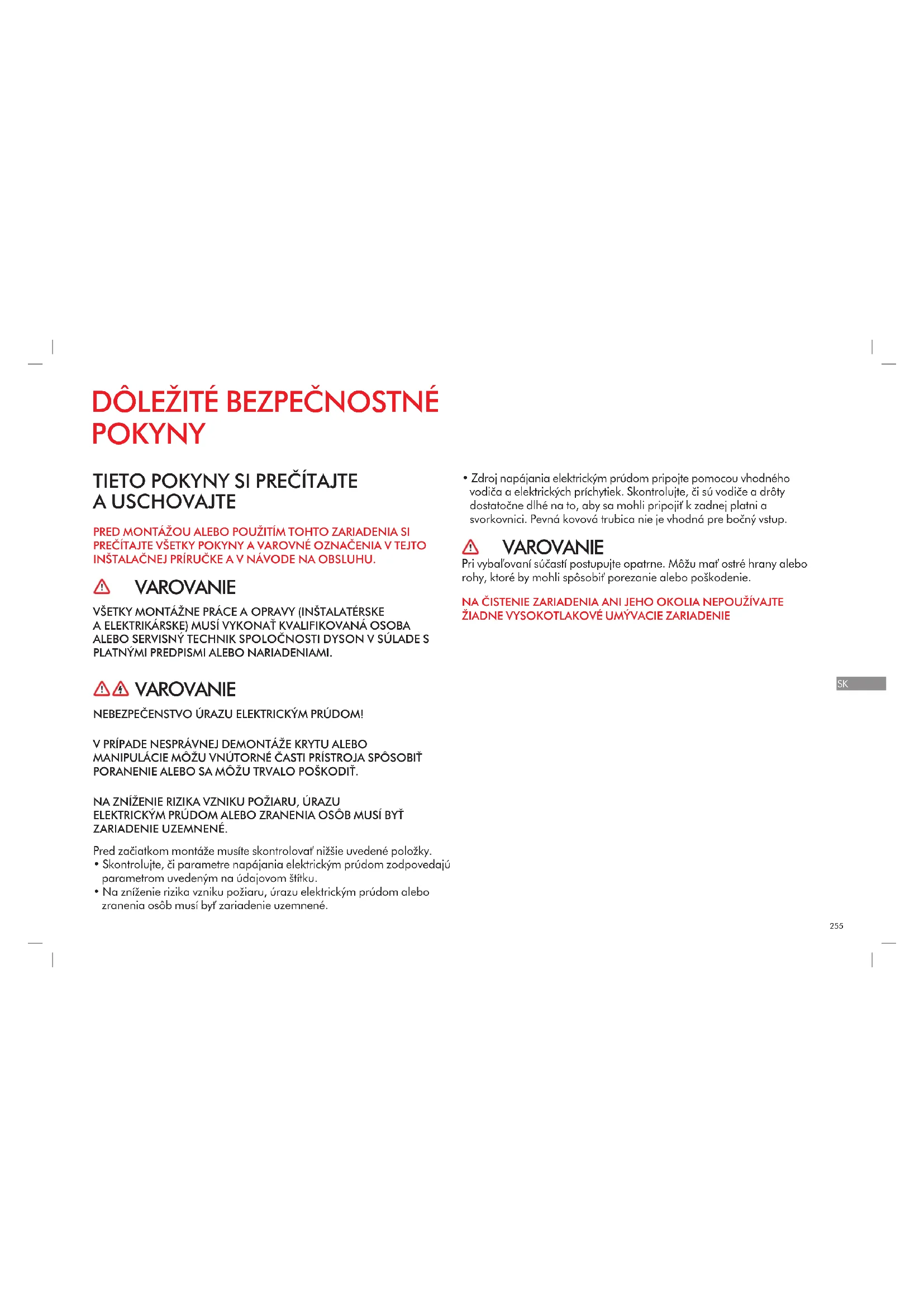 - Zdroj napájania elektrickým prúdom pripojte pomocou vhodného vodiča a elektrických príchytiek. Skontrolujte, či sú vodiče a drôty dostatočne dlhé na to, aby sa mohli pripojiť k zadnej platni a svorkovnici. Pevná kovová trubica nie je vhodná pre bočný vstup. VAROVANIE Pri vybaľovaní súčastí postupujte opatrne. Môžu mať ostré hrany alebo rohy, ktoré by mohli spôsobiť porezanie alebo poškodenie. NA ČISTENIE ZARIADENIA ANI JEHO OKOLIA NEPOUŽÍVAJTE