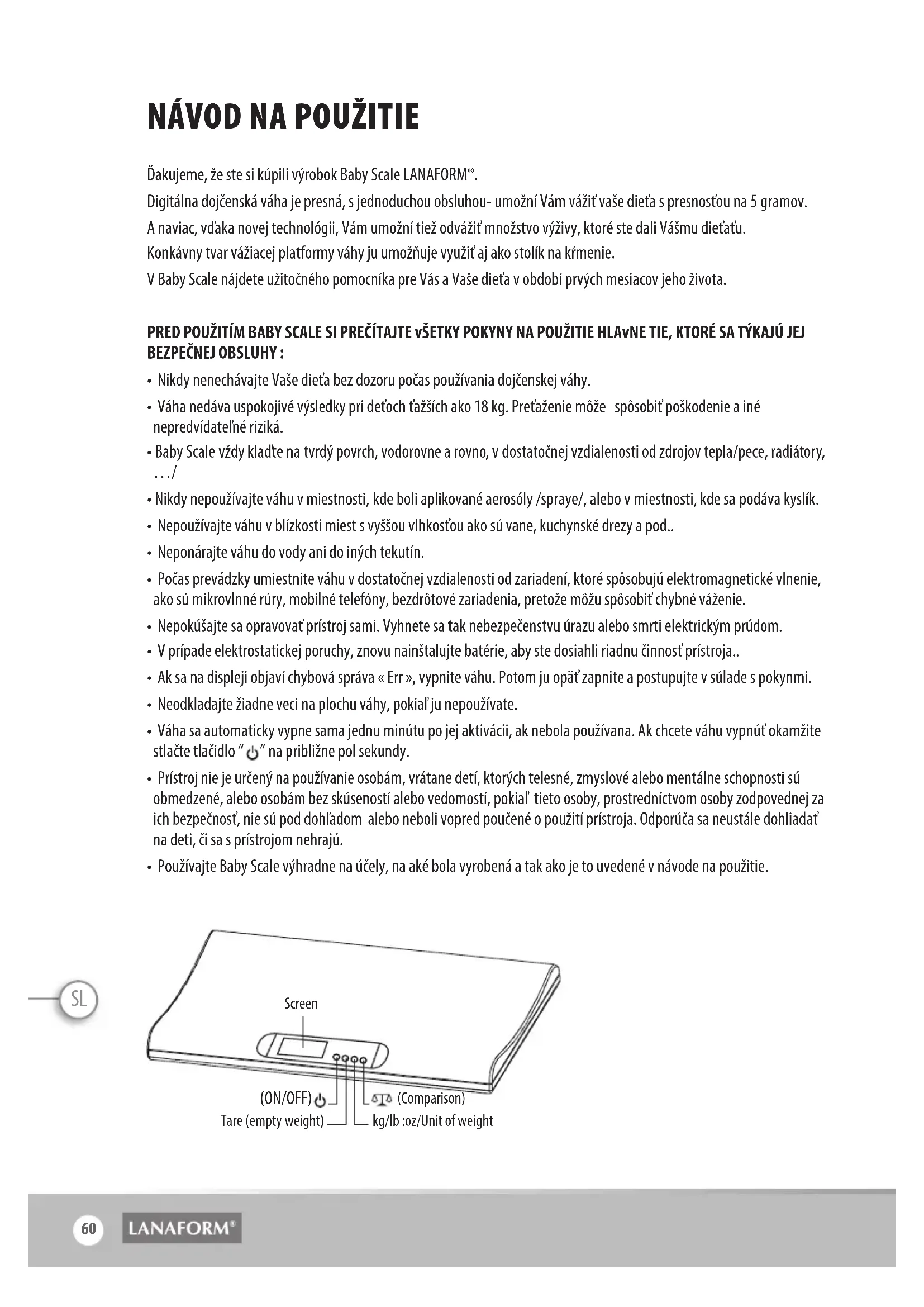 Spoločnosť LANAFORM® sa zaručuje, že tento výrobok je bez akejkoľvek chyby materiálu či spracovania, a to od dátumu predaja po dobu dvoch rokov, s výnimkou nižšie uvedených prípadov. Záruka spoločnosti LANAFORM® sa nevzťahuje na škody spôsobené bežným používaním tohto výrobku. Okrem iného sa záruka v rámci tohto výroku spoločnosti LANAFORM® nevzťahuje na škody spôsobené chybným nebo nevhodným používaním či akýmkoľvek chybným užívaním, nehodou, pripojením nedovolených doplnkov, zmenou realizovanou na výrobku či iným zásahom akejkoľvek povahy, na ktorý nemá spoločnosť LANAFORM® vplyv. Spoločnosť LANAFORM® nebude zodpovedná za žiadny druh poškodenia príslušenstva (následný alebo špeciálny). Všetky záruky týkajúce sa spôsobilosti výrobku sú obmedzené na obdobie dvoch rokov od prvej kúpi pod podmienkou, že pri reklamácii je treba predložiť doklad o kúpe tohto tovaru. Po prijatí prístroja ho spoločnosť LANAFORM® opraví alebo vymení v závislosti od prípadu a následne vám ho vráti. Záručný servis poskytuje iba servisné stredisko spoločnosti LANAFORM®. V prípade, že akúkoľvek údržbu tohto prístroja zveríte inej osobe ako servisnému stredisku spoločnosti LANAFORM®, táto záruka stráca platnosť. Baby Scale