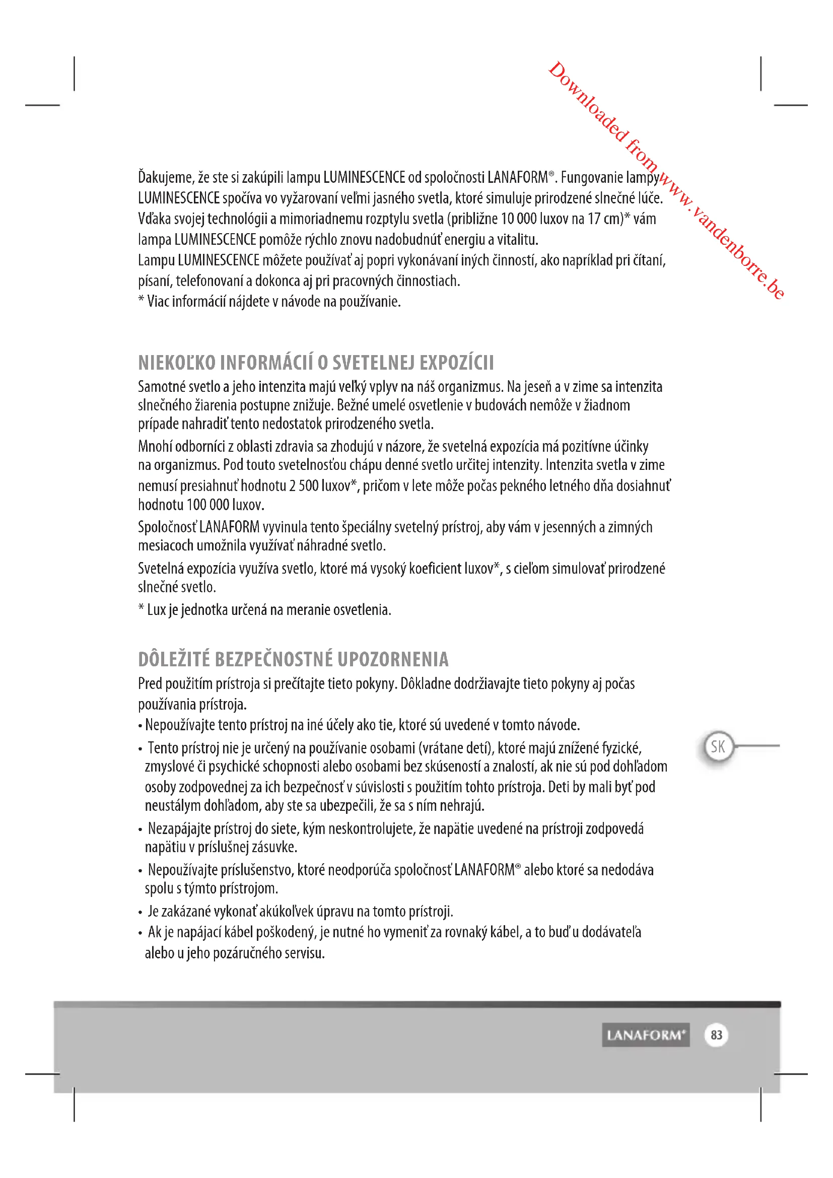 Downloaded from www.vandenborre.beSK Ďakujeme, že ste si zakúpili lampu LUMINESCENCE od spoločnosti LANAFORM®. Fungovanie lampy LUMINESCENCE spočíva vo vyžarovaní veľmi jasného svetla, ktoré simuluje prirodzené slnečné lúče. Vďaka svojej technológii a mimoriadnemu rozptylu svetla (približne 10 000 luxov na 17 cm)* vám lampa LUMINESCENCE pomôže rýchlo znovu nadobudnúť energiu a vitalitu. Lampu LUMINESCENCE môžete používať aj popri vykonávaní iných činností, ako napríklad pri čítaní, písaní, telefonovaní a dokonca aj pri pracovných činnostiach.