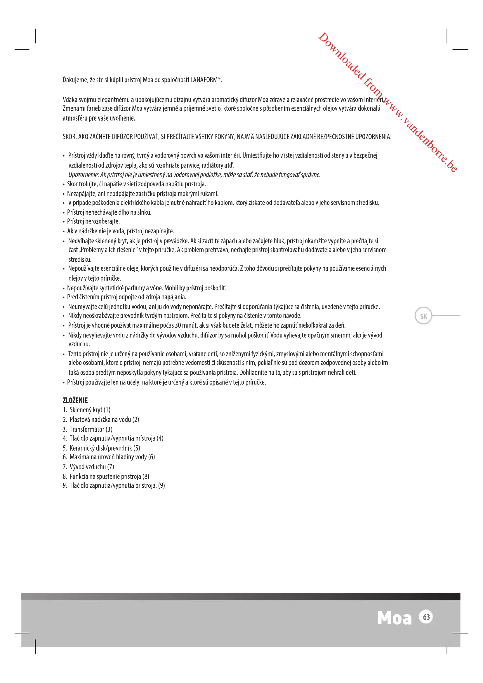 Ďakujeme, že ste si kúpili prístroj Moa od spoločnosti LANAFORM®. Vďaka svojmu elegantnému a upokojujúcemu dizajnu vytvára aromatický difúzor Moa zdravé a relaxačné prostredie vo vašom interiéri. Zmenami farieb zase difúzor Moa vytvára jemné a príjemné svetlo, ktoré spoločne s pôsobením esenciálnych olejov vytvára dokonalú atmosféru pre vaše uvoľnenie. SKÔR, AKO ZAČNETE DIFÚZOR POUŽÍVAŤ, SI PREČÍTAJTE VŠETKY POKYNY, NAJMÄ NASLEDUJÚCE ZÁKLADNÉ BEZPEČNOSTNÉ UPOZORNENIA: