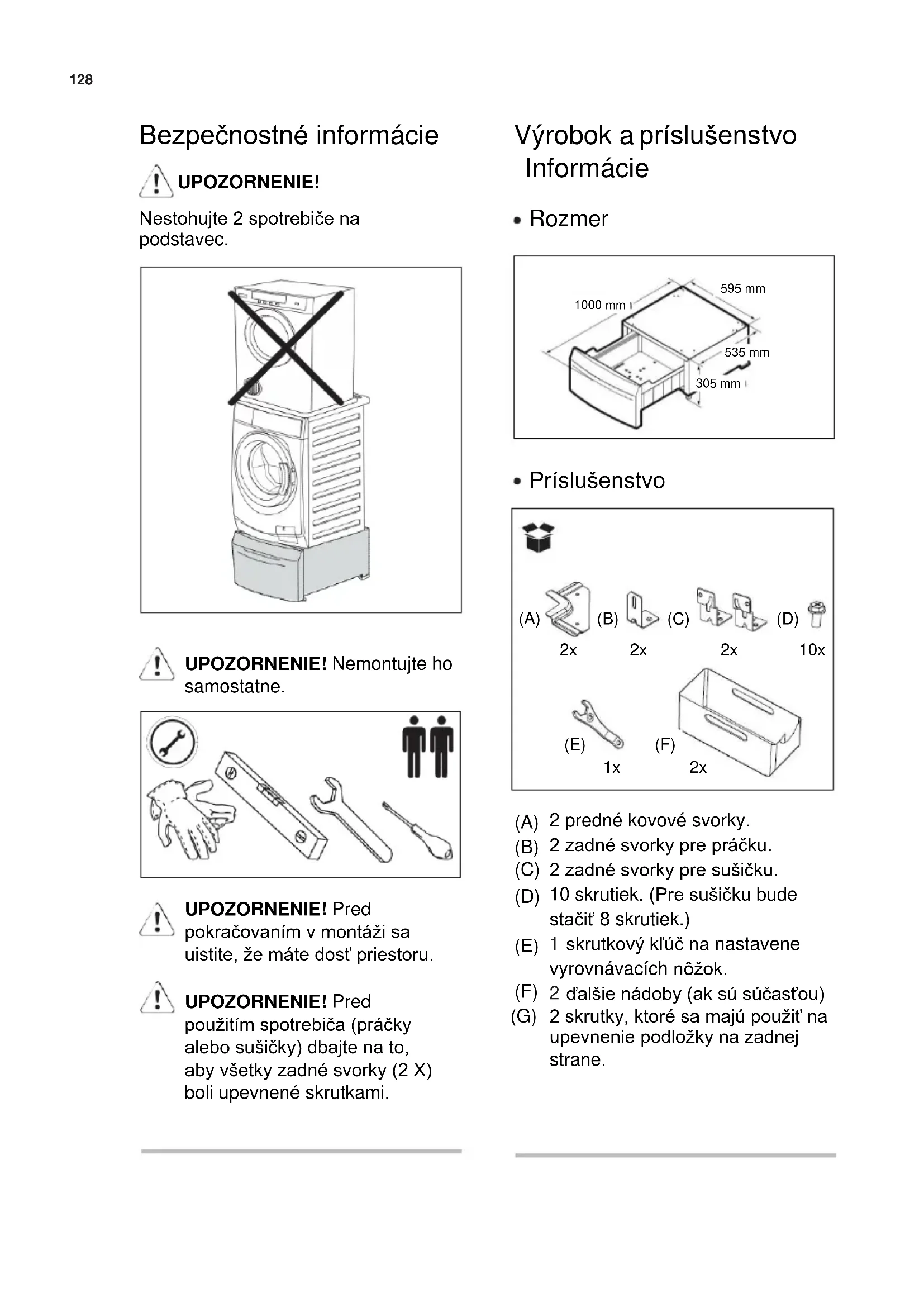 (A) (B) (C) (D) (E) (F) (G) 2 predné kovové svorky. 2 zadné svorky pre práčku. 2 zadné svorky pre sušičku. 10 skrutiek. (Pre sušičku bude stačiť 8 skrutiek.) skrutkový kľúč na nastavene vyrovnávacích nôžok. ďalšie nádoby (ak sú súčasťou) 2 skrutky, ktoré sa majú použiť na upevnenie podložky na zadnej strane. 1000 mm 595 mm 535 mm 305 mm129