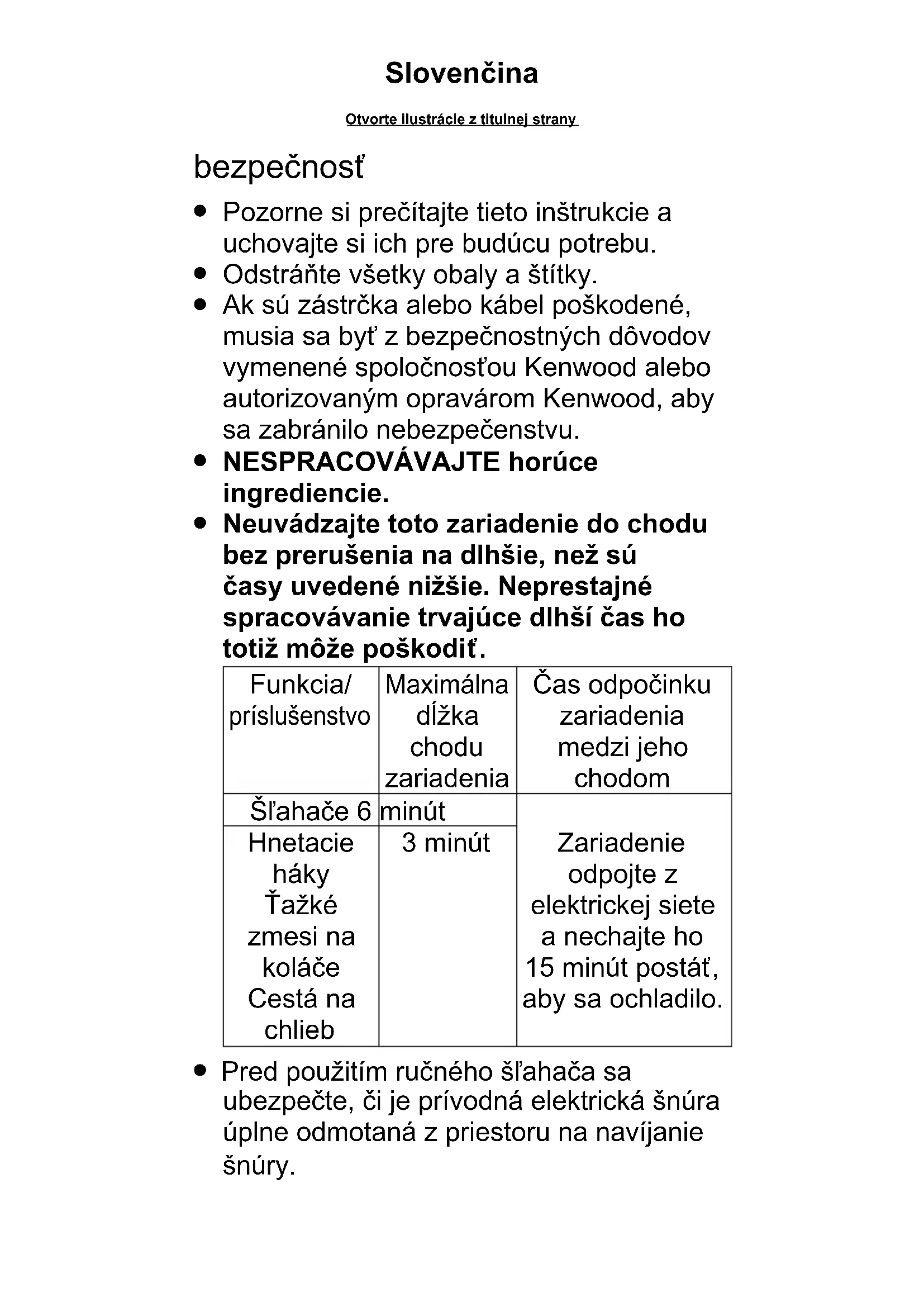 Neuvádzajte toto zariadenie do chodu bez prerušenia na dlhšie, než sú časy uvedené nižšie. Neprestajné spracovávanie trvajúce dlhší čas ho totiž môže poškodiť. Funkcia/ príslušenstvo Maximálna dĺžka chodu zariadenia Čas odpočinku zariadenia medzi jeho chodom Šľahače 6 minút Zariadenie odpojte z elektrickej siete a nechajte ho 15 minút postáť, aby sa ochladilo. Hnetacie háky Ťažké zmesi na koláče Cestá na chlieb 3 minút