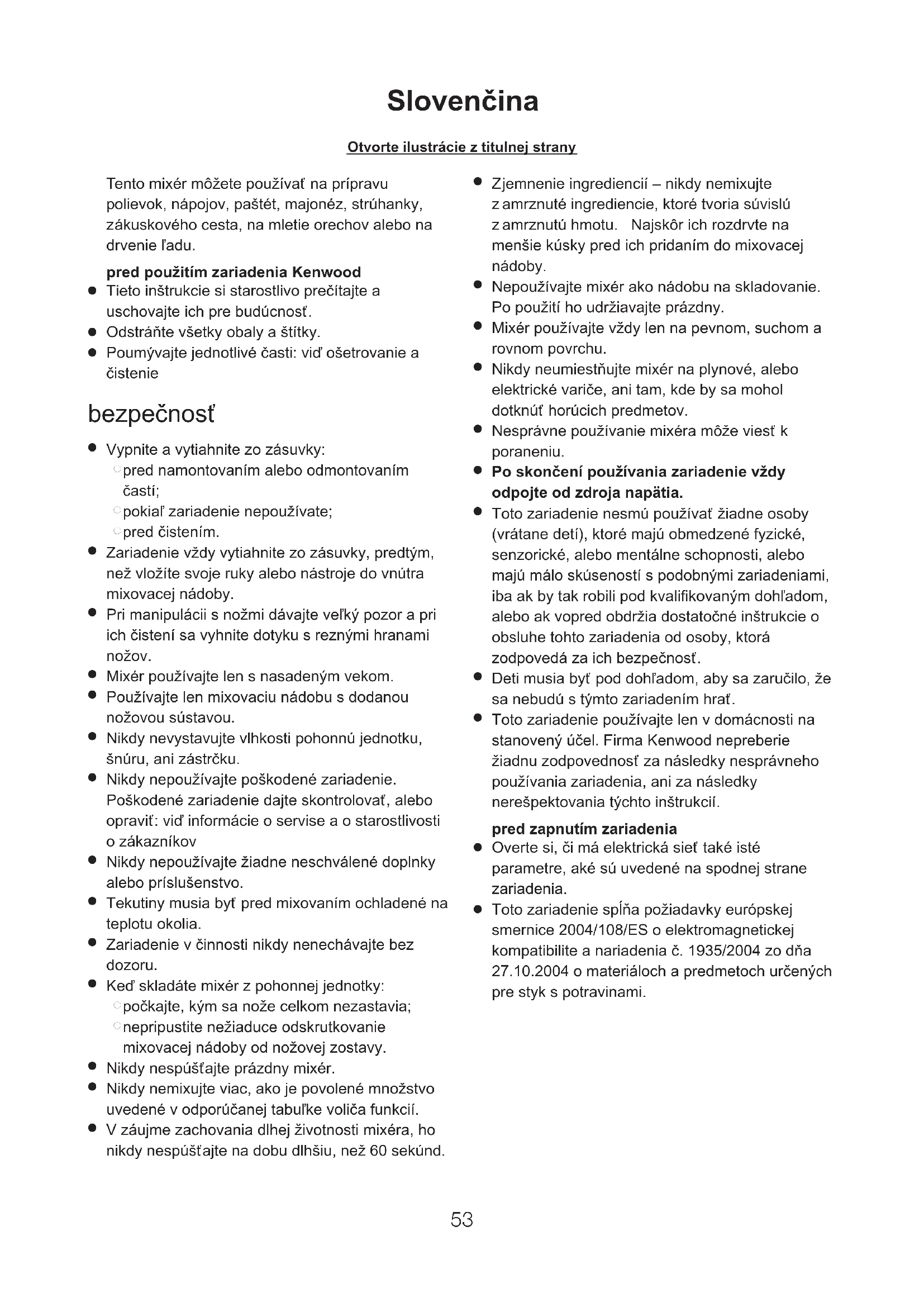 Toto zariadenie používajte len v domácnosti na stanovený účel. Firma Kenwood nepreberie žiadnu zodpovednosť za následky nesprávneho používania zariadenia, ani za následky nerešpektovania týchto inštrukcií. pred zapnutím zariadenia