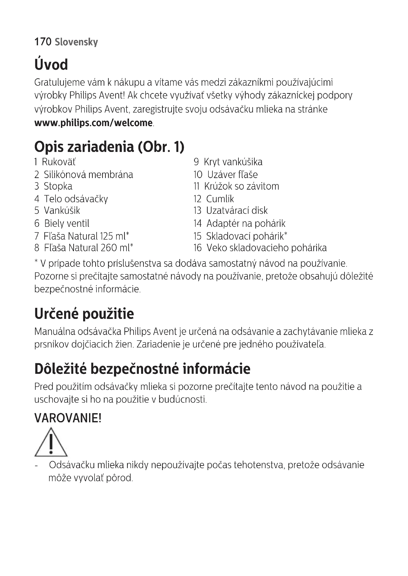 - V prípade tohto príslušenstva sa dodáva samostatný návod na používanie. Pozorne si prečítajte samostatné návody na používanie, pretože obsahujú dôležité bezpečnostné informácie. Určené použitie Manuálna odsávačka Philips Avent je určená na odsávanie a zachytávanie mlieka z prsníkov dojčiacich žien. Zariadenie je určené pre jedného používateľa. Dôležité bezpečnostné informácie Pred použitím odsávačky mlieka si pozorne prečítajte tento návod na použitie a uschovajte si ho na použitie v budúcnosti. VAROVANIE! - Odsávačku mlieka nikdy nepoužívajte počas tehotenstva, pretože odsávanie môže vyvolať pôrod. 170 SlovenskyVarovania, ktoré majú zabrániť uduseniu, uškrteniu a zraneniu: - Nedovoľte, aby sa so súčasťami odsávačky mlieka, baliacimi materiálmi či ostatným príslušenstvom hrali deti alebo zvieratá. - Pred každým použitím skontrolujte, či odsávačka mlieka nevykazuje známky poškodenia. Ak je odsávačka mlieka poškodená alebo nefunguje správne, nepoužívajte ju. Varovania na zabránenie kontaminácii a zaistenie riadnej hygieny: - Z hygienických dôvodov je odsávačka určená len na opakované používanie jednou osobou. - Všetky súčasti očistite a vydezinkujte pred prvým použitím a po každom ďalšom použití. - Na čistenie súčastí odsávačky mlieka nepoužívajte antibakteriálne čistiace prostriedky ani tekutý piesok, pretože by ste ich mohli poškodiť. - Skôr než sa dotknete súčastí odsávačky a prsníkov, dôkladne si umyte ruky mydlom a vodou, aby ste zabránili kontaminácii. Nedotýkajte sa vnútornej strany nádobiek ani viečok. Varovania na zabránenie problémom vrátane bolestivosti prsníkov a bradaviek: - Pred zložením tela odsávačky z prsníka vždy najprv uvoľnite rukoväť, aby ste uvoľnili podtlak. - Ak je podtlak nepríjemný alebo vám spôsobuje bolesť, prestaňte odsávať a zložte si odsávačku mlieka z prsníka. - Ak sa vám nepodarí odsať žiadne mlieko do piatich minút, nepokračujte v odsávaní. Skúste odsávať v priebehu inej časti dňa. - Ak odsávanie začne byť veľmi nepríjemné alebo bolestivé, prestaňte používať odsávačku a poraďte sa so svojím odborníkom z oblasti starostlivosti o zdravie. - Používajte len príslušenstvo a súčasti odporúčané spoločnosťou Philips Avent. - Úpravy odsávačky mlieka nie sú dovolené. Varovanie: Ak ste nakazená vírusom ľudskej imunitnej nedostatočnosti (HIV) alebo hepatitídou typu B alebo C, používanie odsávačky mlieka nezníži ani neodstráni riziko prenosu vírusu na vaše dieťa prostredníctvom materského mlieka. Výstraha - Jednotlivé súčasti uchovávajte mimo vyhriatych povrchov, aby sa nezdeformovali. 171SlovenskyPríprava na použitie Všetky súčasti odsávačky mlieka pred prvým použitím a po každom použití rozoberte, očistite a dezinkujte. Výstraha: Pri vyberaní bieleho ventila a jeho čistení buďte opatrní. Nevkladajte do bieleho ventila žiadne predmety, mohlo by dôjsť k jeho poškodeniu. Čistenie a dezinfekcia Krok 1: Rozoberanie Odsávačku mlieka a fľašu úplne rozoberte. Z odsávačky vyberte aj biely ventil. Krok 2: Čistenie Súčasti možno umývať ručne alebo v umývačke riadu. Varovanie: Na čistenie súčastí odsávačky mlieka nepoužívajte antibakteriálne čistiace prostriedky ani tekutý piesok, pretože by ste ich mohli poškodiť. Krok 2A: Manuálne čistenie 1 Všetky súčasti opláchnite prúdom vlažnej vody. 2 Namočte všetky súčasti na 5 minút do teplej vody s jemným prostriedkom na umývanie riadu. 3 Očistite všetky súčasti čistiacou kefkou. 4 Dôkladne opláchnite všetky súčasti prúdom studenej čistej vody. 5 Všetky súčasti nechajte vyschnúť na vzduchu na čistej utierke alebo odkvapkávači. Krok 2B: Čistenie v umývačke na riad Poznámka: Potravinárske farbivá môžu spôsobiť zmenu farieb častí. 1 Všetky súčasti umiestnite do hornej zásuvky v umývačke riadu. 2 Do umývačky doplňte roztok alebo tabletu na umývanie riadu a spustite štandardný program. 3 Všetky súčasti nechajte vyschnúť na vzduchu na čistej utierke alebo odkvapkávači. 172 SlovenskyKrok 3: Dezinfekcia Výstraha: Počas dezinfekcie vo vriacej vode zaistite, aby sa fľaša ani iné súčasti nedotýkali stien hrnca. Mohlo by to spôsobiť nevratnú deformáciu výrobku alebo poškodenie, za ktoré spoločnosť Philips nenesie zodpovednosť. 1 Všetky súčasti vložte do hrnca, ktorý naplňte dostatočným množstvom vody, aby v nej boli všetky súčasti ponorené. Nechajte vodu 5 minút variť. Zaistite, aby sa súčasti nedotýkali bočnej strany hrnca. 2 Vodu nechajte vychladnúť. 3 Opatrne vyberte súčasti z vody. Súčasti uložte na čistý povrch, utierku alebo na odkvapkávač a nechajte ich vyschnúť. Zostavenie odsávačky mlieka Uistite sa, že ste vyčistili a vydezinkovali všetky súčasti odsávačky, ktoré prichádzajú do kontaktu s materským mliekom. Varovanie: Ak ste súčasti odsávačky dezinkovali vyváraním, dávajte pozor, pretože môžu byť veľmi horúce. Aby nedošlo k popáleniu, začnite odsávačku zostavovať, až keď vydezinkované súčasti vychladnú. Pred použitím skontrolujte súčasti zostavy odsávačky mlieka, či nie sú opotrebované, a v prípade potreby ich vymeňte. Poznámka: Na vytvorenie vhodného podtlaku treba vankúšik a silikónovú membránu umiestniť správne. 1 Zospodu vložte biely ventil do tela odsávačky. Ventil zatlačte čo najhlbšie (Obr. 2). 2 Naskrutkujte telo odsávačky v smere hodinových ručičiek na fľašu (Obr. 3) alebo skladovací pohárik (Obr. 4), kým nie je bezpečne pripevnená. Poznámka: Ak chcete použiť skladovací pohárik, najskôr naň musíte naskrutkovať adaptér na pohárik (Obr. 4). 3 Stopku vložte do silikónovej membrány (Obr. 5). 4 Zhora vložte do tela odsávačky silik