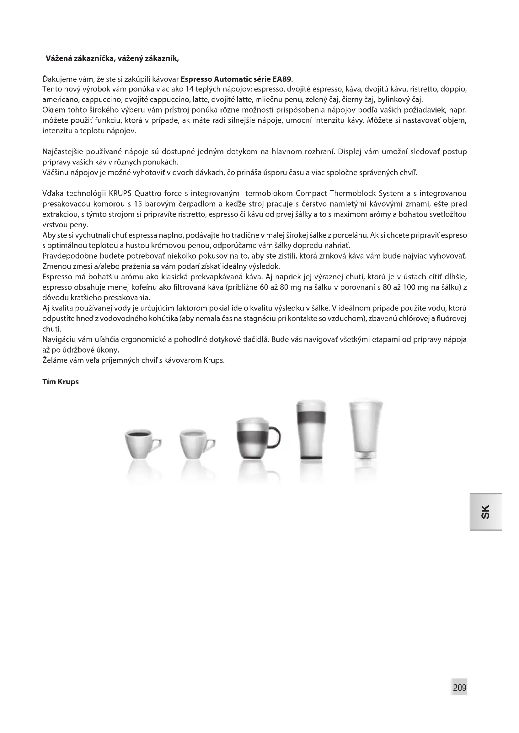 Vážená zákazníčka, vážený zákazník, Ďakujeme vám, že ste si zakúpili kávovar Espresso Automatic série EA89. Tento nový výrobok vám ponúka viac ako 14 teplých nápojov: espresso, dvojité espresso, káva, dvojitú kávu, ristretto, doppio, americano, cappuccino, dvojité cappuccino, latte, dvojité latte, mliečnu penu, zelený čaj, čierny čaj, bylinkový čaj. Okrem tohto širokého výberu vám prístroj ponúka rôzne možnosti prispôsobenia nápojov podľa vašich požiadaviek, napr. môžete použiť funkciu, ktorá v prípade, ak máte radi silnejšie nápoje, umocní intenzitu kávy. Môžete si nastavovať objem, intenzitu a teplotu nápojov. Najčastejšie používané nápoje sú dostupné jedným dotykom na hlavnom rozhraní. Displej vám umožní sledovať postup prípravy vašich káv v rôznych ponukách. Väčšinu nápojov je možné vyhotoviť v dvoch dávkach, čo prináša úsporu času a viac spoločne správených chvíľ. Vďaka technológii KRUPS Quattro force s integrovaným termoblokom Compact Thermoblock System a s integrovanou presakovacou komorou s 15-barovým čerpadlom a keďže stroj pracuje s čerstvo namletými kávovými zrnami, ešte pred extrakciou, s týmto strojom si pripravíte ristretto, espresso či kávu od prvej šálky a to s maximom arómy a bohatou svetložltou vrstvou peny. Aby ste si vychutnali chuť espressa naplno, podávajte ho tradične v malej širokej šálke z porcelánu. Ak si chcete pripraviť espreso s optimálnou teplotou a hustou krémovou penou, odporúčame vám šálky dopredu nahriať. Pravdepodobne budete potrebovať niekoľko pokusov na to, aby ste zistili, ktorá zrnková káva vám bude najviac vyhovovať. Zmenou zmesi a/alebo praženia sa vám podarí získať ideálny výsledok. Espresso má bohatšiu arómu ako klasická prekvapkávaná káva. Aj napriek jej výraznej chuti, ktorú je v ústach cítiť dlhšie, espresso obsahuje menej kofeínu ako ltrovaná káva (približne 60 až 80 mg na šálku v porovnaní s 80 až 100 mg na šálku) z dôvodu kratšieho presakovania. Aj kvalita používanej vody je určujúcim faktorom pokiaľ ide o kvalitu výsledku v šálke. V ideálnom prípade použite vodu, ktorú odpustíte hneď z vodovodného kohútika (aby nemala čas na stagnáciu pri kontakte so vzduchom), zbavenú chlórovej a uórovej chuti. Navigáciu vám uľahčia ergonomické a pohodlné dotykové tlačidlá. Bude vás navigovať všetkými etapami od prípravy nápoja až po údržbové úkony. Želáme vám veľa príjemných chvíľ s kávovarom Krups. Tím Krups211