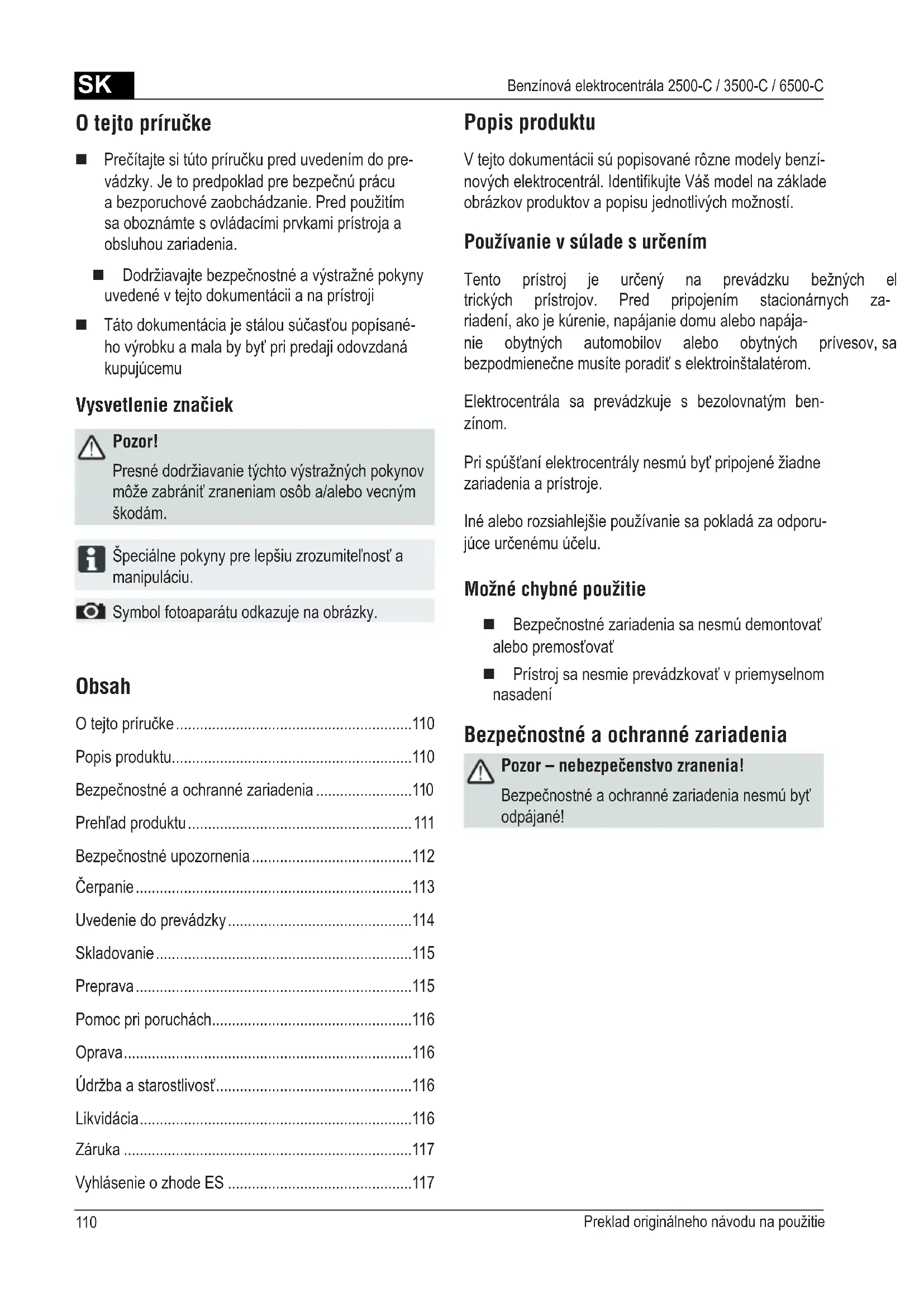 - Benzínová elektrocentrála 2500-C / 3500-C / 6500-C Obsah Otejtopríručke p. 110