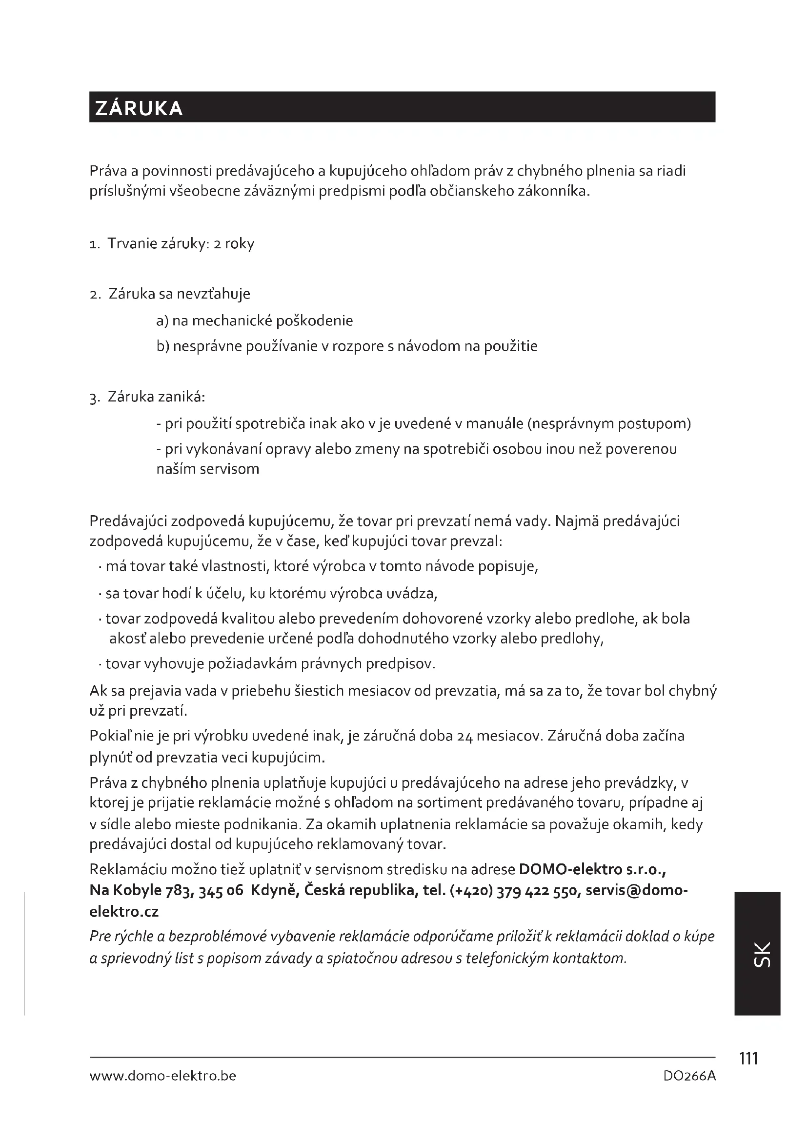 - tovar vyhovuje požiadavkám právnych predpisov. Ak sa prejavia vada v priebehu šiestich mesiacov od prevzatia, má sa za to, že tovar bol chybný už pri prevzatí. Pokiaľ nie je pri výrobku uvedené inak, je záručná doba 24 mesiacov. Záručná doba začína plynúť od prevzatia veci kupujúcim. Práva z chybného plnenia uplatňuje kupujúci u predávajúceho na adrese jeho prevádzky, v ktorej je prijatie reklamácie možné s ohľadom na sortiment predávaného tovaru, prípadne aj v sídle alebo mieste podnikania. Za okamih uplatnenia reklamácie sa považuje okamih, kedy predávajúci dostal od kupujúceho reklamovaný tovar. Reklamáciu možno tiež uplatniť v servisnom stredisku na adrese DOMO-elektro s.r.o., Na Kobyle 783, 345 06 Kdyně, Česká republika, tel. (+420) 379 422 550, servis@domo- elektro.cz Pre rýchle a bezproblémové vybavenie reklamácie odporúčame priložiť k reklamácii doklad o kúpe a sprievodný list s popisom závady a spiatočnou adresou s telefonickým kontaktom.112 DO266A