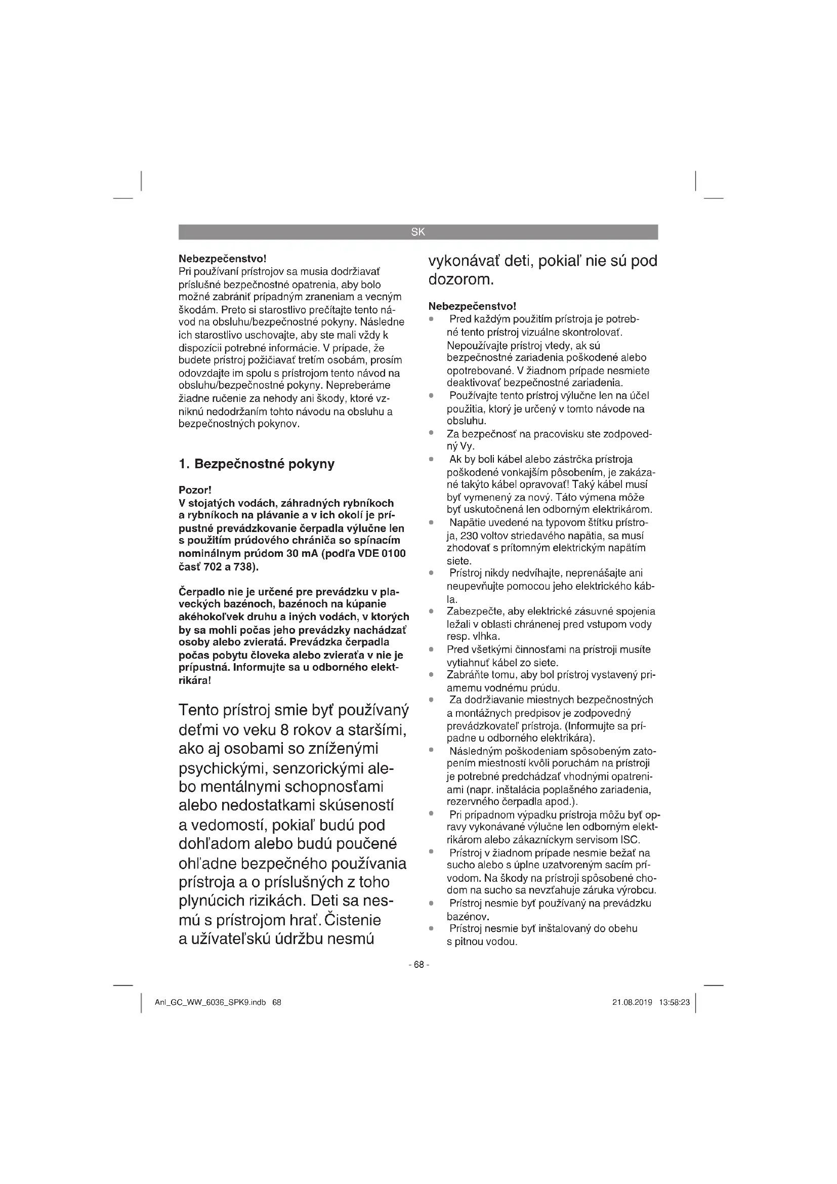 Pozor! V stojatých vodách, záhradných rybníkoch a rybníkoch na plávanie a v ich okolí je prí- pustné prevádzkovanie čerpadla výlučne len s použitím prúdového chrániča so spínacím nominálnym prúdom 30 mA (podľa VDE 0100 časť 702 a 738). Čerpadlo nie je určené pre prevádzku v pla- veckých bazénoch, bazénoch na kúpanie akéhokoľvek druhu a iných vodách, v ktorých by sa mohli počas jeho prevádzky nachádzať osoby alebo zvieratá. Prevádzka čerpadla počas pobytu človeka alebo zvieraťa v nie je prípustná. Informujte sa u odborného elekt- rikára! Tento prístroj smie byť používaný deťmi vo veku 8 rokov a staršími, ako aj osobami so zníženými psychickými, senzorickými ale- bo mentálnymi schopnosťami alebo nedostatkami skúseností a vedomostí, pokiaľ budú pod dohľadom alebo budú poučené ohľadne bezpečného používania prístroja a o príslušných z toho plynúcich rizikách. Deti sa nes- mú s prístrojom hrať. Čistenie a užívateľskú údržbu nesmú vykonávať deti, pokiaľ nie sú pod dozorom. Nebezpečenstvo!