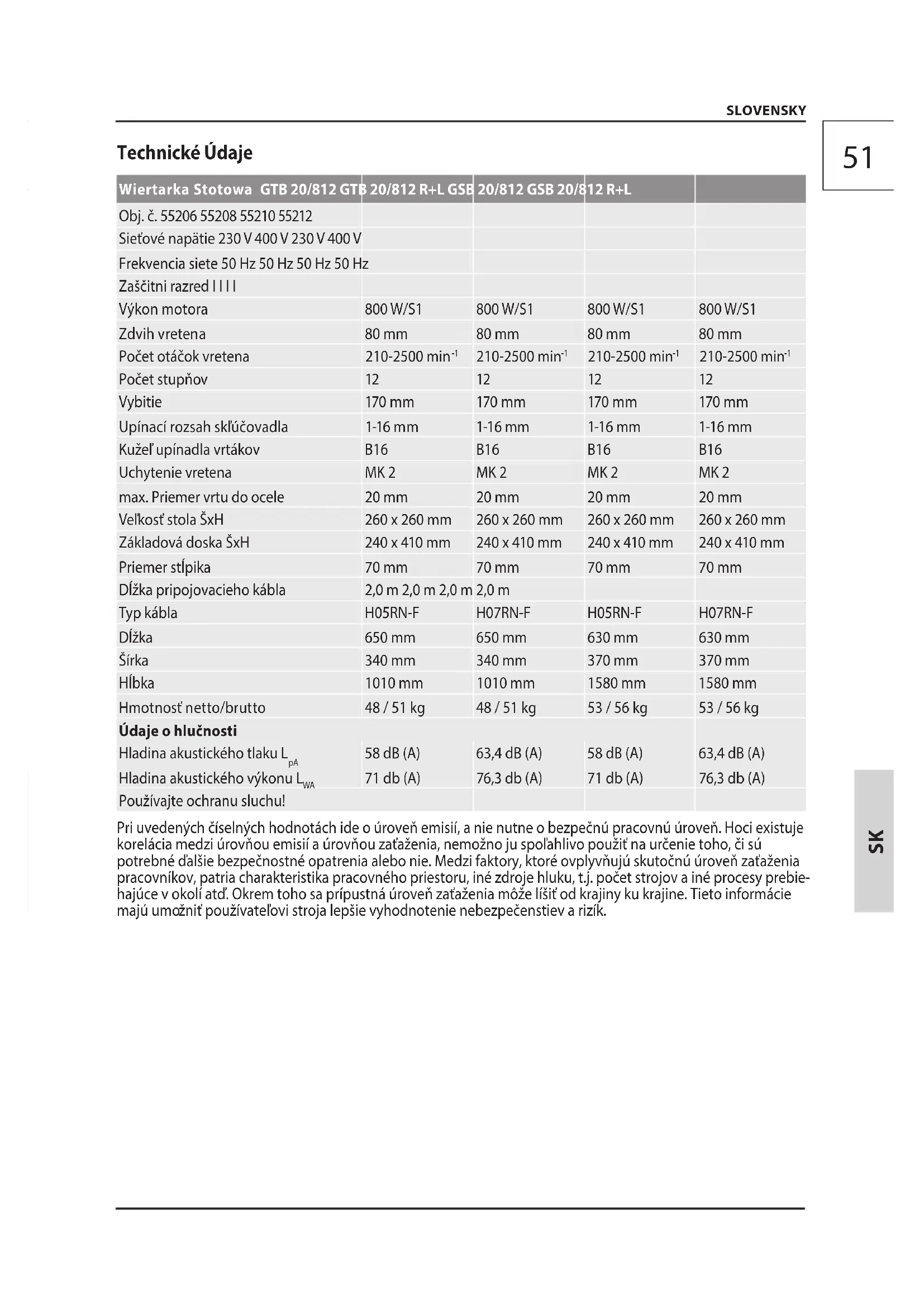 oužívajte osobný ochranný výstroj, ktorý je určený pre vás. Pri dlhých vlasoch noste sieťku na vlasy. Nenoste rukavice pri práci s vrtákom. Nepokúšajte sa vŕtať materiál, ktorý nemá rovný povrch, poprípade použite vhodnú podperu. Nikdy nezapínajte vŕtačku s vrtákom pritlačeným k obrobku. Vždy používajte svorky, upínacie čeľuste alebo zverák na zaistenie obrobku na stole. Vŕtačku nastavte na rýchlosť, ktorá je primeraná pre danú prácu. V prípade blokády stroj okamžite vypnite. Vytiahnite sieťovú zástrčku a vyberte zaseknutý obrobok. Triesky alebo úlomky sa nesmú odstraňovať za chodu stroja. Sieťová Prípojka Prevádzka je povolená len s ochranným vypínačom proti chybovému prúdu (RCD max. chybový prúd30 mA). Pripájať len na jednofázový striedavý prúd a na sieťové napätie uvedené na štítku o výkonnosti. Pripájať len do zásuviek s ochranným kontaktom. Len vypnutý stroj pripájajte do zásuvky. Údrzba Pred vykonávaním akýchkoľvek prác na prístroji vždy vytiahnite zástrčku zo zásuvky. <<Führen Sie vor jedem Betreiben eine Sichtprüfung durch.>> Prístroj sa nesmie používať, ak je poškodený alebo sú chybné bezpečnostné zariadenia. Opotrebené a poškodené diely vymeňte. Pozor! Ak sa poškodí napájací kábel tohto prístroja, musí ho výrobca alebo jeho zákaznícky servis či po