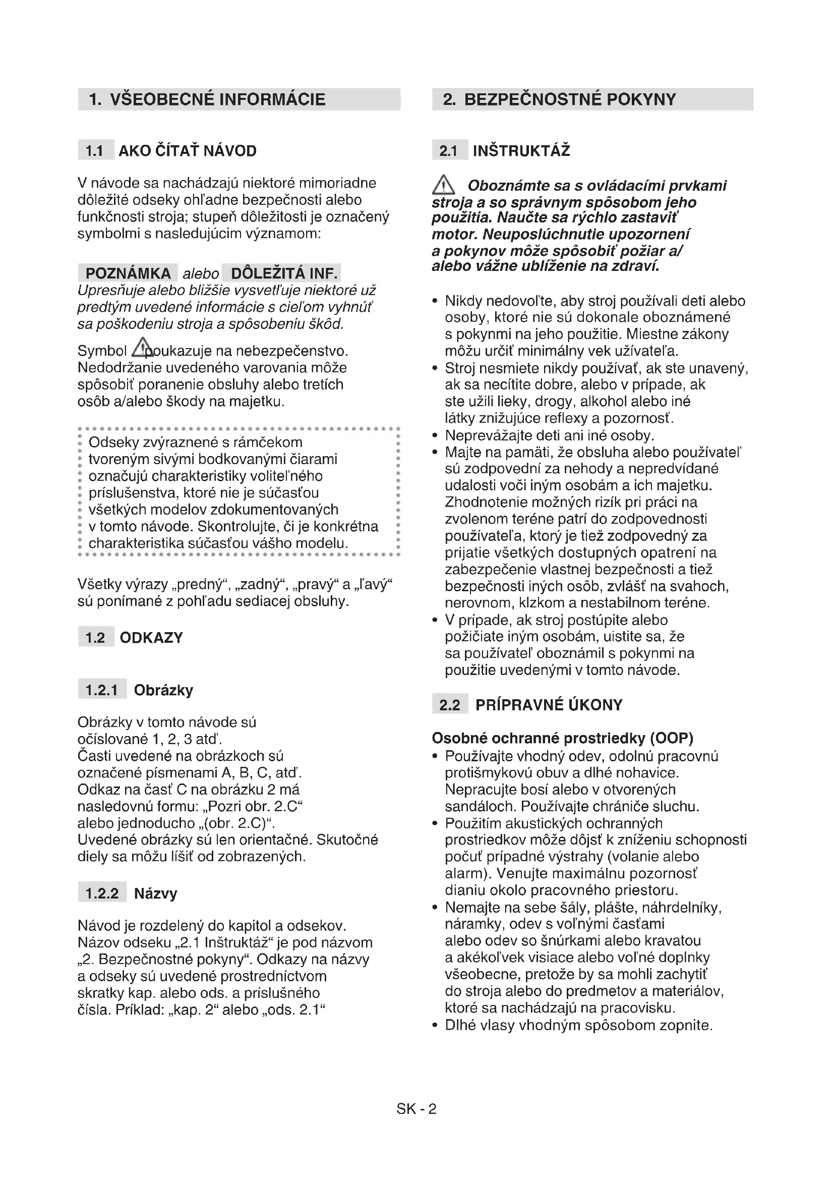 Návod je rozdelený do kapitol a odsekov. Názov odseku „2.1 Inštruktáž“ je pod názvom „2. Bezpečnostné pokyny“. Odkazy na názvy a odseky sú uvedené prostredníctvom skratky kap. alebo ods. a príslušného čísla. Príklad: „kap. 2“ alebo „ods. 2.1“