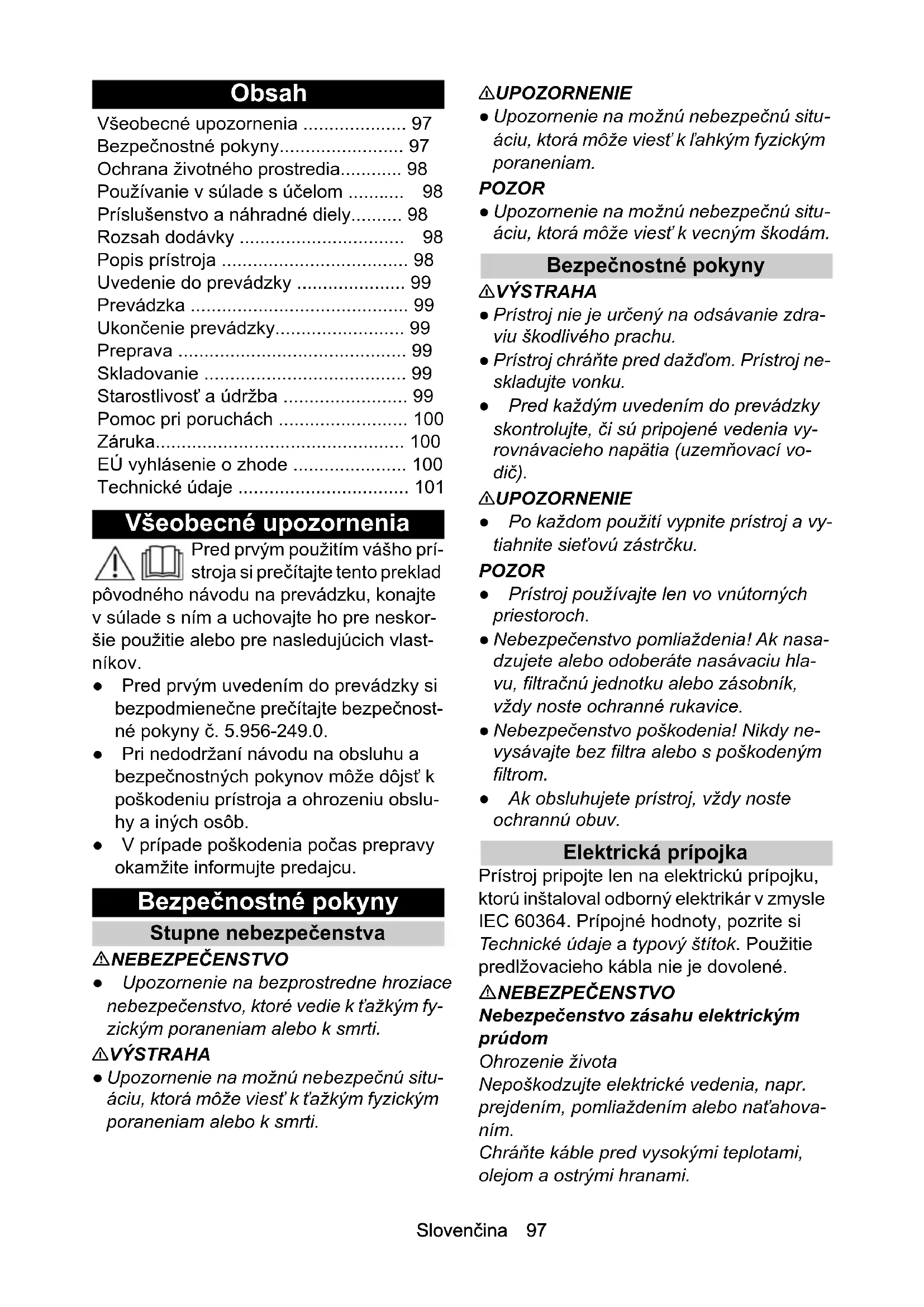 - 3 x 1,5 Objednací číslo (EU) 9.979-874.0 Délka kabelu m 6,0Slovenčina 97 Obsah Všeobecné upozornenia Pred prvým použitím vášho prí- stroja si prečítajte tento preklad pôvodného návodu na prevádzku, konajte v súlade s ním a uchovajte ho pre neskor- šie použitie alebo pre nasledujúcich vlast- níkov. ● Pred prvým uvedením do prevádzky si bezpodmienečne prečítajte bezpečnost- né pokyny č. 5.956-249.0. ● Pri nedodržaní návodu na obsluhu a bezpečnostných pokynov môže dôjsť k poškodeniu prístroja a ohrozeniu obslu- hy a iných osôb. ● V prípade poškodenia počas prepravy okamžite informujte predajcu. Bezpečnostné pokyny Stupne nebezpečenstva NEBEZPEČENSTVO ● Upozornenie na bezprostredne hroziace nebezpečenstvo, ktoré vedie k ťažkým fy- zickým poraneniam alebo k smrti. 몇 VÝSTRAHA ● Upozornenie na možnú nebezpečnú situ- áciu, ktorá môže viesť k ťažkým fyzickým poraneniam alebo k smrti. 몇 UPOZORNENIE ● Upozornenie na možnú nebezpečnú situ- áciu, ktorá môže viesť k ľahkým fyzickým poraneniam. POZOR ● Upozornenie na možnú nebezpečnú situ- áciu, ktorá môže viesť k vecným škodám. Bezpečnostné pokyny 몇 VÝSTRAHA ● Prístroj nie je určený na odsávanie zdra- viu škodlivého prachu. ● Prístroj chráňte pred dažďom. Prístroj ne- skladujte vonku. ● Pred každým uvedením do prevádzky skontrolujte, či sú pripojené vedenia vy- rovnávacieho napätia (uzemňovací vo- dič). 몇 UPOZORNENIE ● Po každom použití vypnite prístroj a vy- tiahnite sieťovú zástrčku. POZOR ● Prístroj používajte len vo vnútorných priestoroch. ● Nebezpečenstvo pomliaždenia! Ak nasa- dzujete alebo odoberáte nasávaciu hla- vu, filtračnú jednotku alebo zásobník, vždy noste ochranné rukavice. ● Nebezpečenstvo poškodenia! Nikdy ne- vysávajte bez filtra alebo s poškodeným filtrom. ● Ak obsluhujete prístroj, vždy noste ochrannú obuv. Elektrická prípojka Prístroj pripojte len na elektrickú prípojku, ktorú inštaloval odborný elektrikár v zmysle IEC 60364. Prípojné hodnoty, pozrite si Technické údaje a typový štítok. Použitie predlžovacieho kábla nie je dovolené. NEBEZPEČENSTVO Nebezpečenstvo zásahu elektrickým prúdom Ohrozenie života Nepoškodzujte elektrické vedenia, napr. prejdením, pomliaždením alebo naťahova- ním. Chráňte káble pred vysokými teplotami, olejom a ostrými hranami. Všeobecné upozornenia p. 97