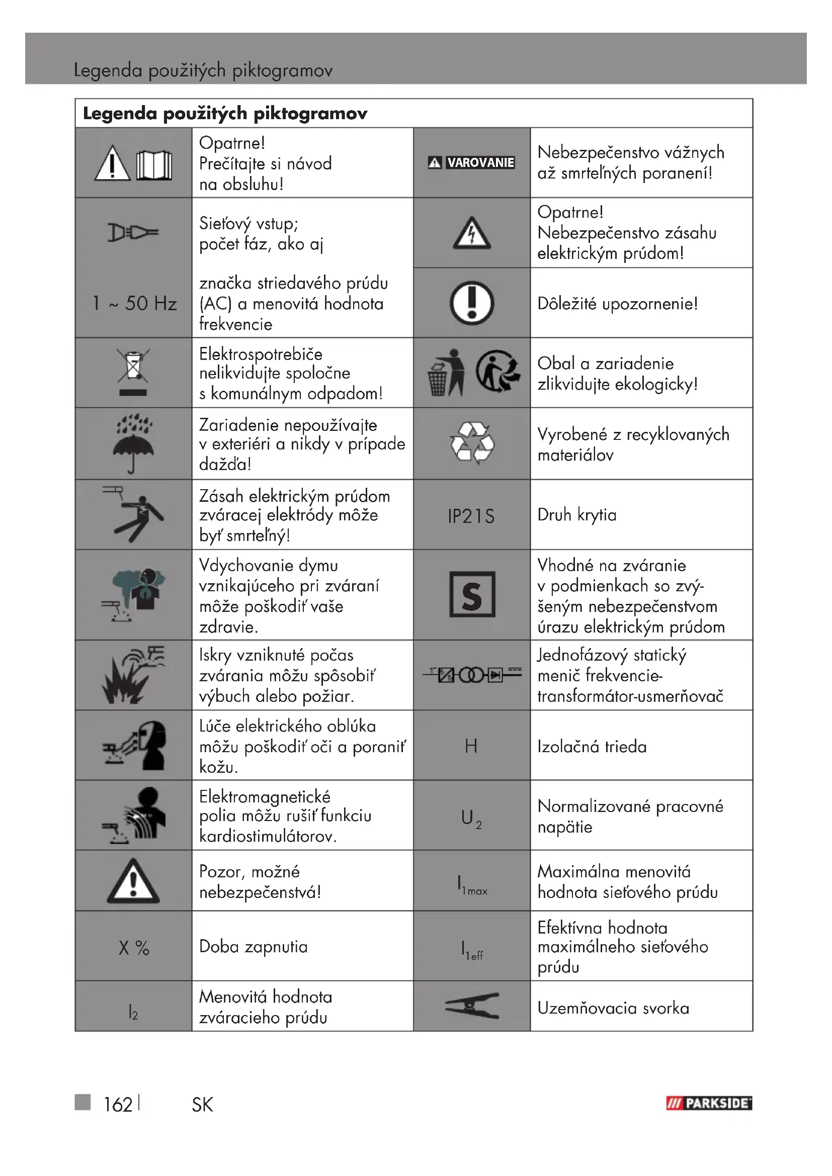 Legenda použitých piktogramov Legenda použitých piktogramov Opatrne! Prečítajte si návod naobsluhu! VAROVANIE Nebezpečenstvo vážnych až smrteľných poranení! Sieťový vstup; počet fáz, ako aj Opatrne! Nebezpečenstvo zásahu elektrickým prúdom! 1 ~ 50 Hz značka striedavého prúdu (AC) a menovitá hodnota frekvencie Dôležité upozornenie! Elektrospotrebiče nelikvidujte spoločne s komunálnym odpadom! Obal a zariadenie zlikvidujte ekologicky! Zariadenie nepoužívajte vexteriéri a nikdy v prípade dažďa! Vyrobené zrecyklovaných materiálov Zásah elektrickým prúdom zváracej elektródy môže byť smrteľný! IP21S Druh krytia Vdychovanie dymu vznikajúceho pri zváraní môže poškodiť vaše zdravie.
