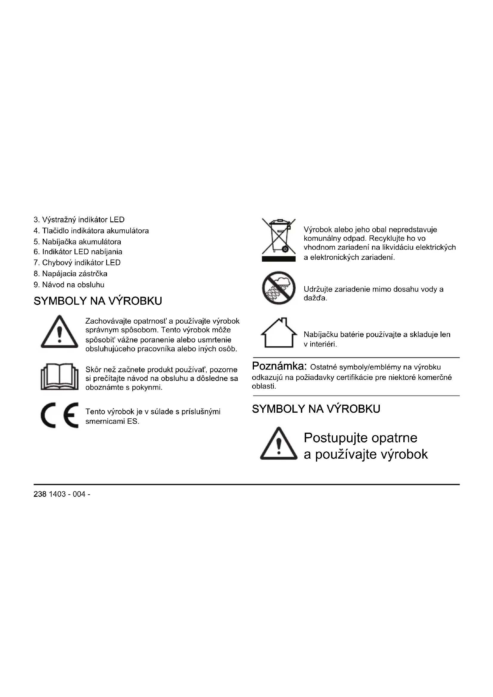 Postupujte opatrne a používajte výrobok 238 1403 - 004 -správnym spôsobom. Tento výrobok môže spôsobiť vážne poranenie alebo usmrtenie obsluhujúceho pracovníka alebo iných osôb. Skôr než začnete produkt používať, pozorne si prečítajte návod na obsluhu a dôsledne sa oboznámte s pokynmi. Udržujte zariadenie mimo dosahu vody a dažďa. Nabíjačku batérie používajte a skladuje len v interiéri. Poznámka: Ostatné symboly/ emblémy na výrobku odkazujú na požiadavky certifikácie pre niektoré komerčné oblasti.