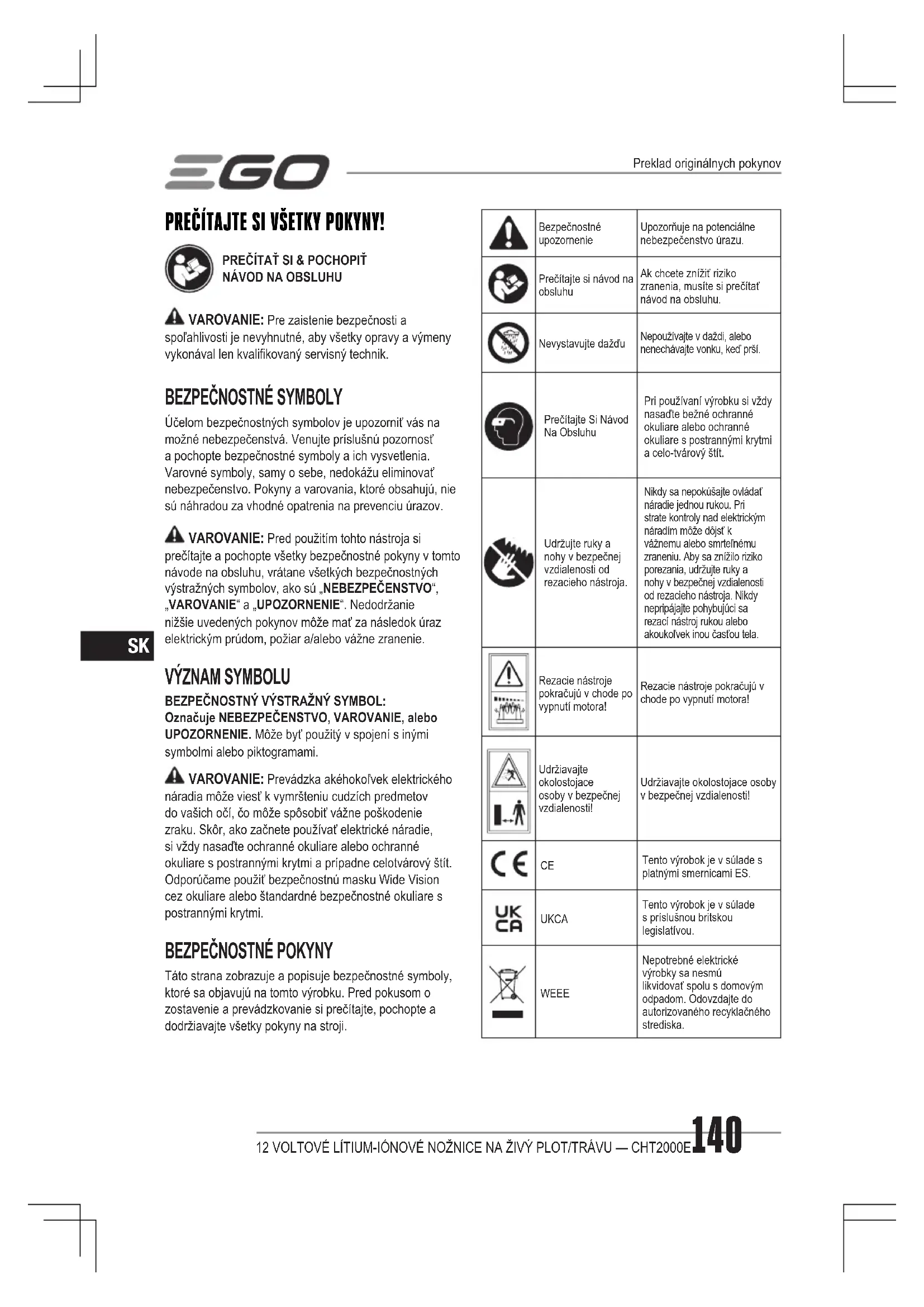 Táto strana zobrazuje a popisuje bezpečnostné symboly, ktoré sa objavujú na tomto výrobku. Pred pokusom o zostavenie a prevádzkovanie si prečítajte, pochopte a dodržiavajte všetky pokyny na stroji.Bezpečnostné upozornenieUpozorňuje na potenciálne nebezpečenstvo úrazu.Prečítajte si návod na obsluhuAk chcete znížiť riziko zranenia, musíte si prečítať návod na obsluhu.Nevystavujte dažďuNepoužívajte v daždi, alebo nenechávajte vonku, keď prší.Prečítajte Si Návod Na ObsluhuPri používaní výrobku si vždy nasaďte bežné ochranné okuliare alebo ochranné okuliare s postrannými krytmi a celo-tvárový štít.Udržujte ruky a nohy v bezpečnej vzdialenosti od rezacieho nástroja.Nikdy sa nepokúšajte ovládať náradie jednou rukou. Pri strate kontroly nad elektrickým náradím môže dôjsť k vážnemu alebo smrteľnému zraneniu. Aby sa znížilo riziko porezania, udržujte ruky a nohy v bezpečnej vzdialenosti od rezacieho nástroja. Nikdy nepripájajte pohybujúci sa rezací nástroj rukou alebo akoukoľvek inou časťou tela.Rezacie nástroje pokračujú v chode po vypnutí motora!Rezacie nástroje pokračujú v chode po vypnutí motora!Udržiavajte okolostojace osoby v bezpečnej vzdialenosti!Udržiavajte okolostojace osoby v bezpečnej vzdialenosti! Tento výrobok je v súlade s platnými smernicami ES. UKCA Tento výrobok je v súlade s príslušnou britskou legislatívou. WEEE Nepotrebné elektrické výrobky sa nesmú likvidovať spolu s domovým odpadom. Odovzdajte do autorizovaného recyklačného strediska.Preklad originálnych pokynov12 VOLTOVÉ LÍTIUM-IÓNOVÉ NOŽNICE NA ŽIVÝ PLOT/TRÁVU — CHT2000E 141