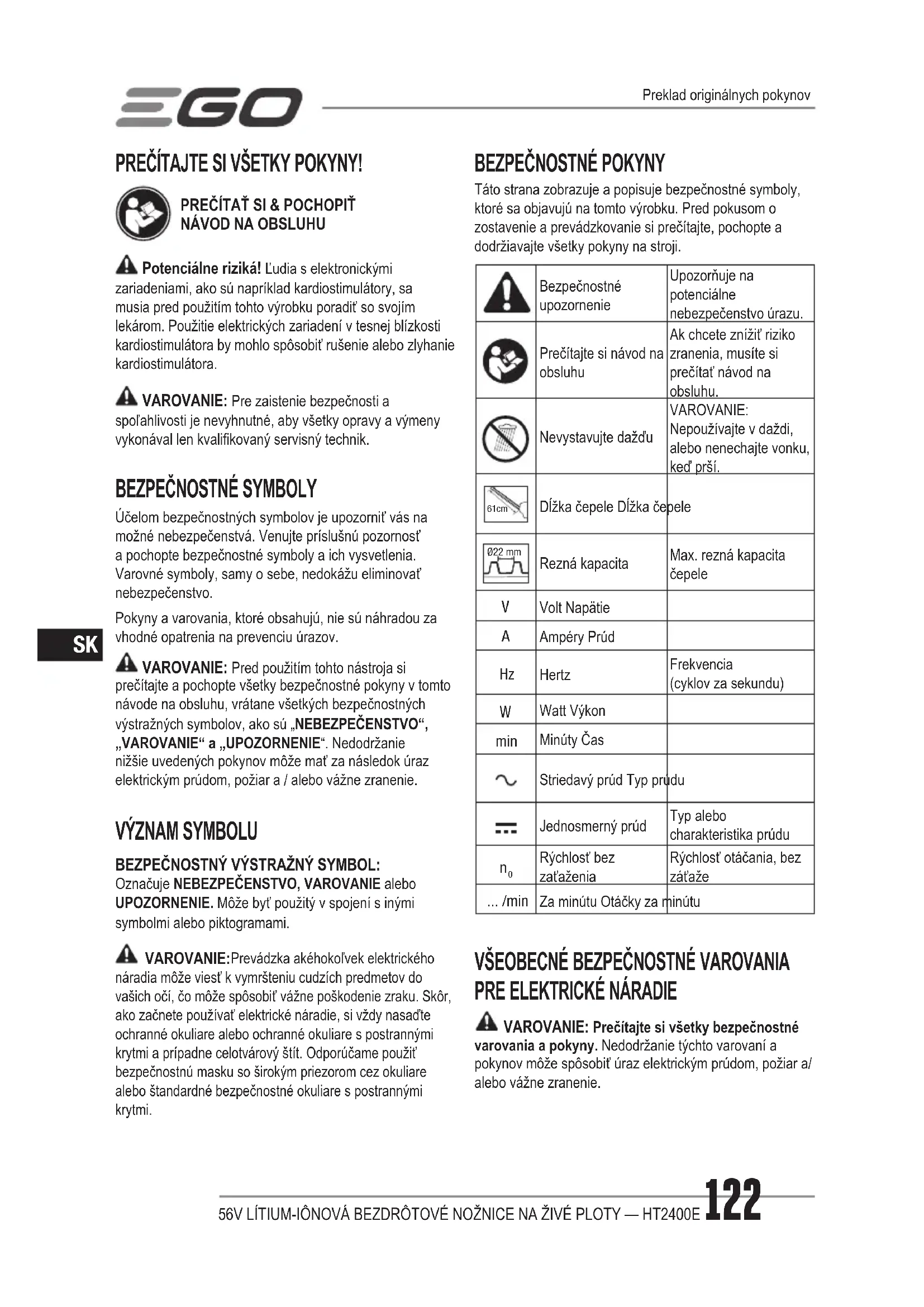 VAROVANIE: Prečítajte si všetky bezpečnostné varovania a pokyny. Nedodržanie týchto varovaní a pokynov môže spôsobiť úraz elektrickým prúdom, požiar a/ alebo vážne zranenie. Preklad originálnych pokynov56V LÍTIUM-IÔNOVÁ BEZDRÔTOVÉ NOŽNICE NA ŽIVÉ PLOTY — HT2400E