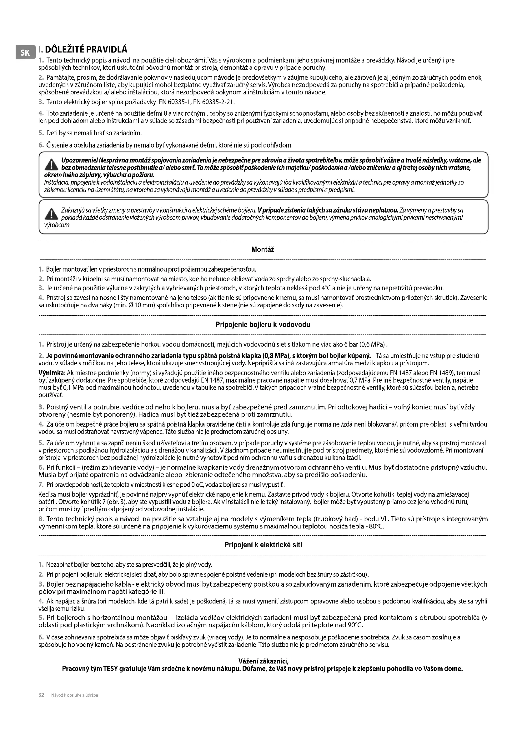 5. Pri bojleroch s horizontálnou montážou - izolácia vodičov elektrických zariadení musí byť zabezpečená pred kontaktom s obrubou spotrebiča (v oblasti pod plastickým vrchnákom). Napríklad izolačným napájacím káblom, ktorý odolá pri teplote nad 90°C. 6. V čase zohrievania spotrebiča sa môže objaviť piskľavý zvuk (vriacej vody). Je to normálne a nespôsobuje poškodenie spotrebiča. Zvuk sa časom zosilňuje a spôsobuje ho vodný kameň. Na odstránenie zvuku je potrebné vyčistiť zariadenie. Táto služba nie je predmetom záručného servisu. Vážení zákazníci, Pracovný tým TESY gratuluje Vám srdečne k novému nákupu. Dúfame, že Váš nový prístroj prispeje k zlepšeniu pohodlia vo Vašom dome.Slovenčina Návod k obsluhe a údržbe 33