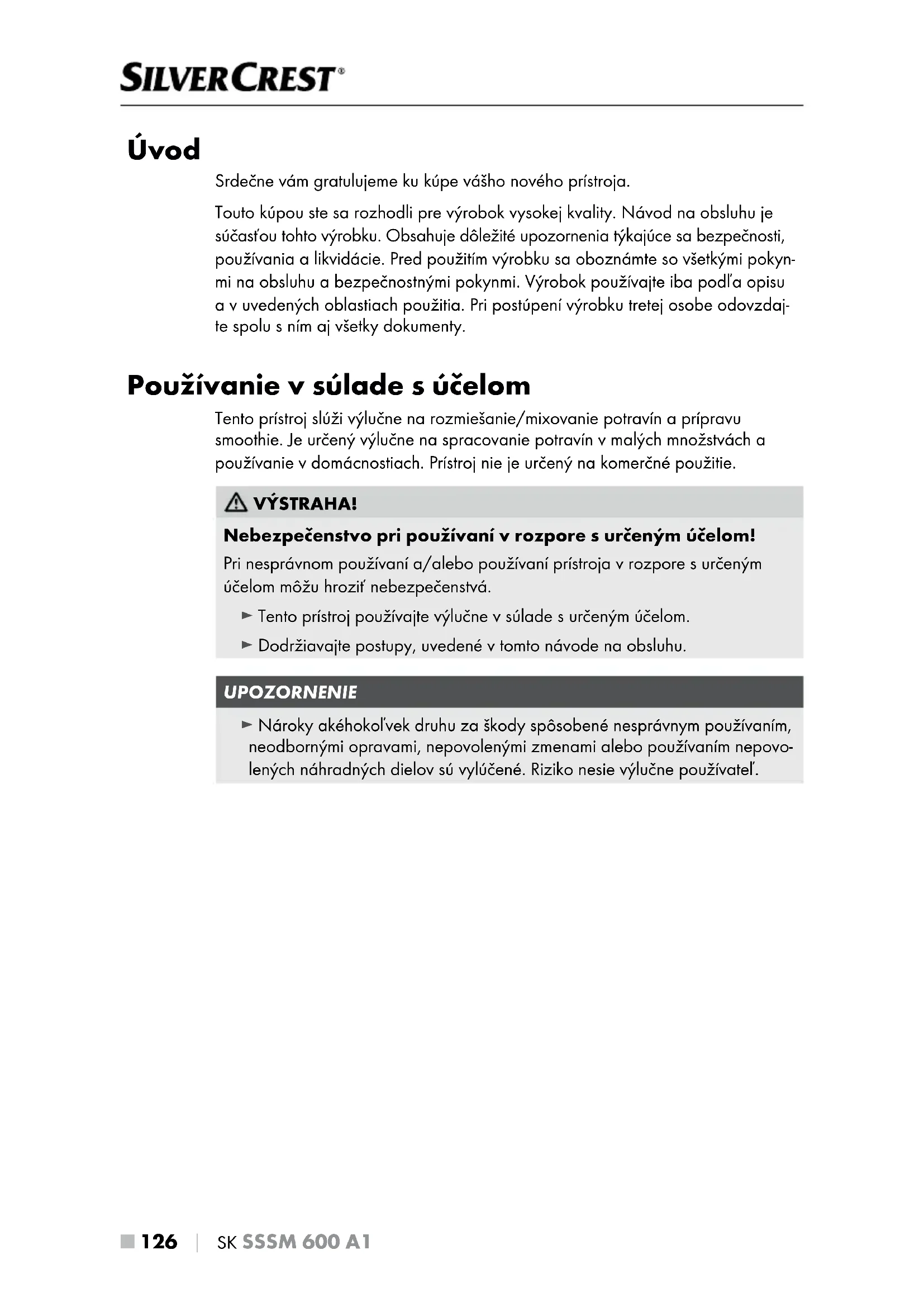 Úvod Srdečne vám gratulujeme ku kúpe vášho nového prístroja. Touto kúpou ste sa rozhodli pre výrobok vysokej kvality. Návod naobsluhu je súčasťou tohto výrobku. Obsahuje dôležité upozornenia týkajúce sa bezpečnosti, používania a likvidácie. Pred použitím výrobku sa oboznámte sovšetkými pokyn- mi na obsluhu a bezpečnostnými pokynmi. Výrobok používajte iba podľa opisu a vuvedených oblastiach použitia. Pri postúpení výrobku tretej osobe odovzdaj- te spolu sním aj všetky dokumenty. Používanie v súlade s účelom Tento prístroj slúži výlučne na rozmiešanie/mixovanie potravín a prípravu smoothie. Je určený výlučne na spracovanie potravín v malých množstvách a používanie vdomácnostiach. Prístroj nie je určený na komerčné použitie. VÝSTRAHA! Nebezpečenstvo pri používaní vrozpore surčeným účelom! Pri nesprávnom používaní a/alebo používaní prístroja vrozpore surčeným účelom môžu hroziť nebezpečenstvá. ► Tento prístroj používajte výlučne v súlade s určeným účelom. ► Dodržiavajte postupy, uvedené vtomto návode na obsluhu. UPOZORNENIE ► Nároky akéhokoľvek druhu za škody spôsobené nesprávnym používaním, neodbornými opravami, nepovolenými zmenami alebo používaním nepovo- lených náhradných dielov sú vylúčené. Riziko nesie výlučne používateľ.SK