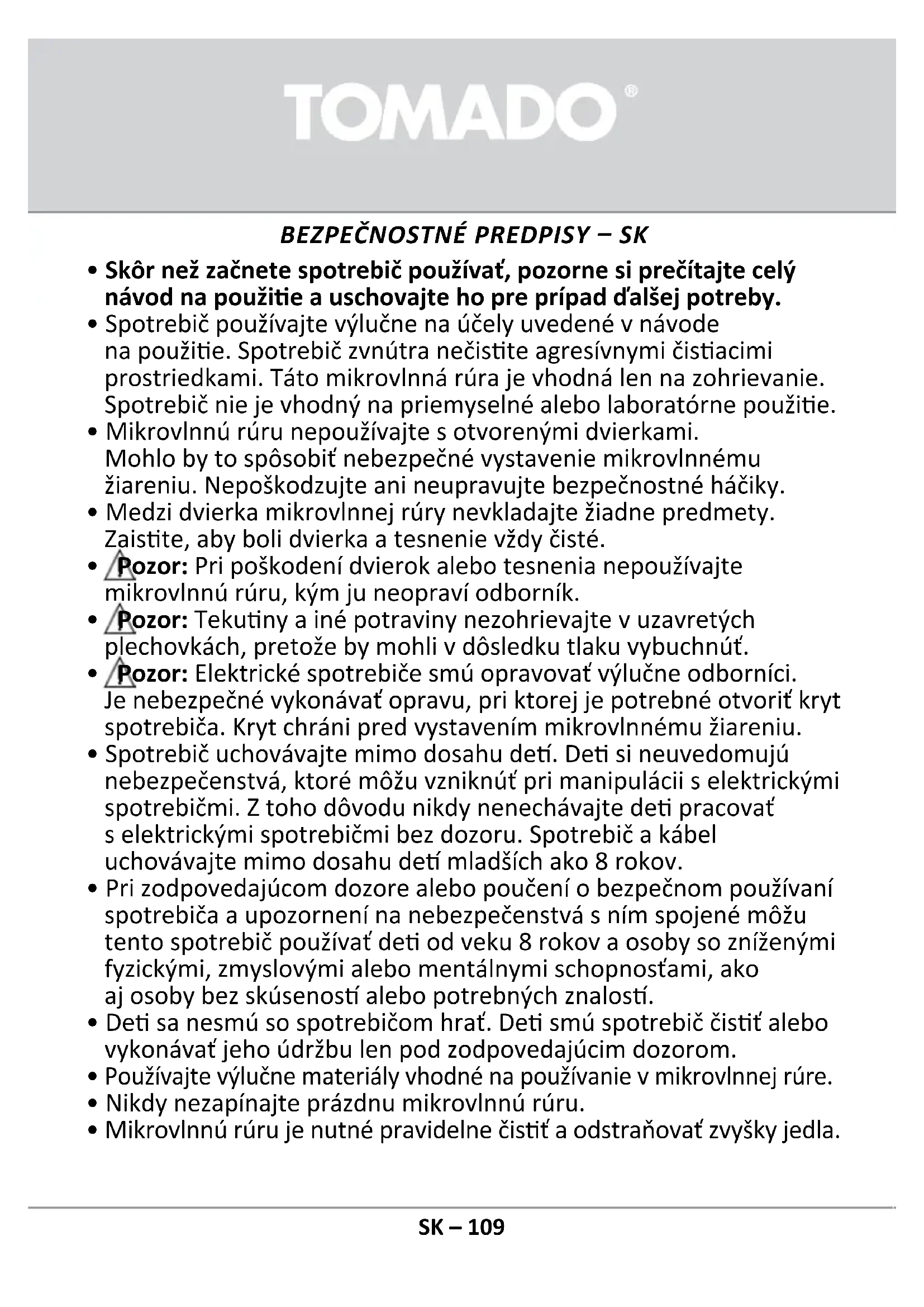 SK – 109• Pri zohrievaní jedla v plastovej alebo papierovej nádobe mikrovlnnúrúrukontrolujte.Vznikátunebezpečenstvo samovoľnéhovznietenia.