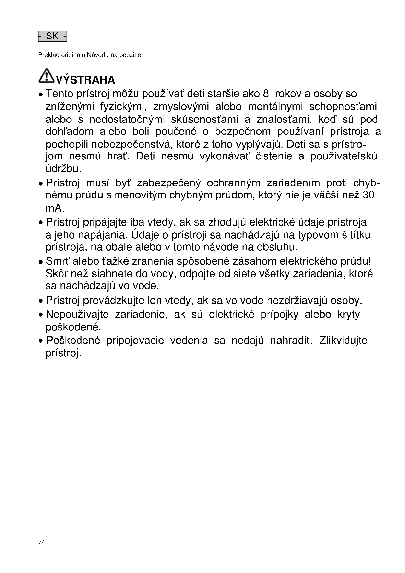 Tento prístroj môžu používať deti staršie ako 8 rokov a osoby so zníženými fyzickými, zmyslovými alebo mentálnymi schopnosťami alebo s nedostatočnými skúsenosťami a znalosťami, keď sú pod dohľadom alebo boli poučené o bezpečnom používaní prístroja a poc hopili nebezpečenstvá, ktoré z toho vyplývajú. Deti sa s prístro- jom nes mú hrať. Deti nesmú vykonávať čistenie a používateľskú údržbu.