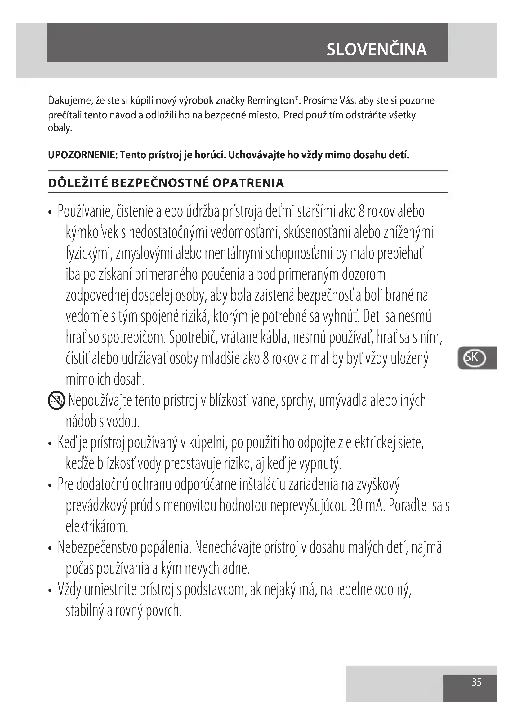 - Ak sa elektrický kábel tohto prístroja poškodí, prestaňte okamžite s jeho používaním a prístroj odovzdajte do najbližšieho servisného strediska Remington® na opravu alebo výmenu, aby ste predišli akémukoľvek riziku.